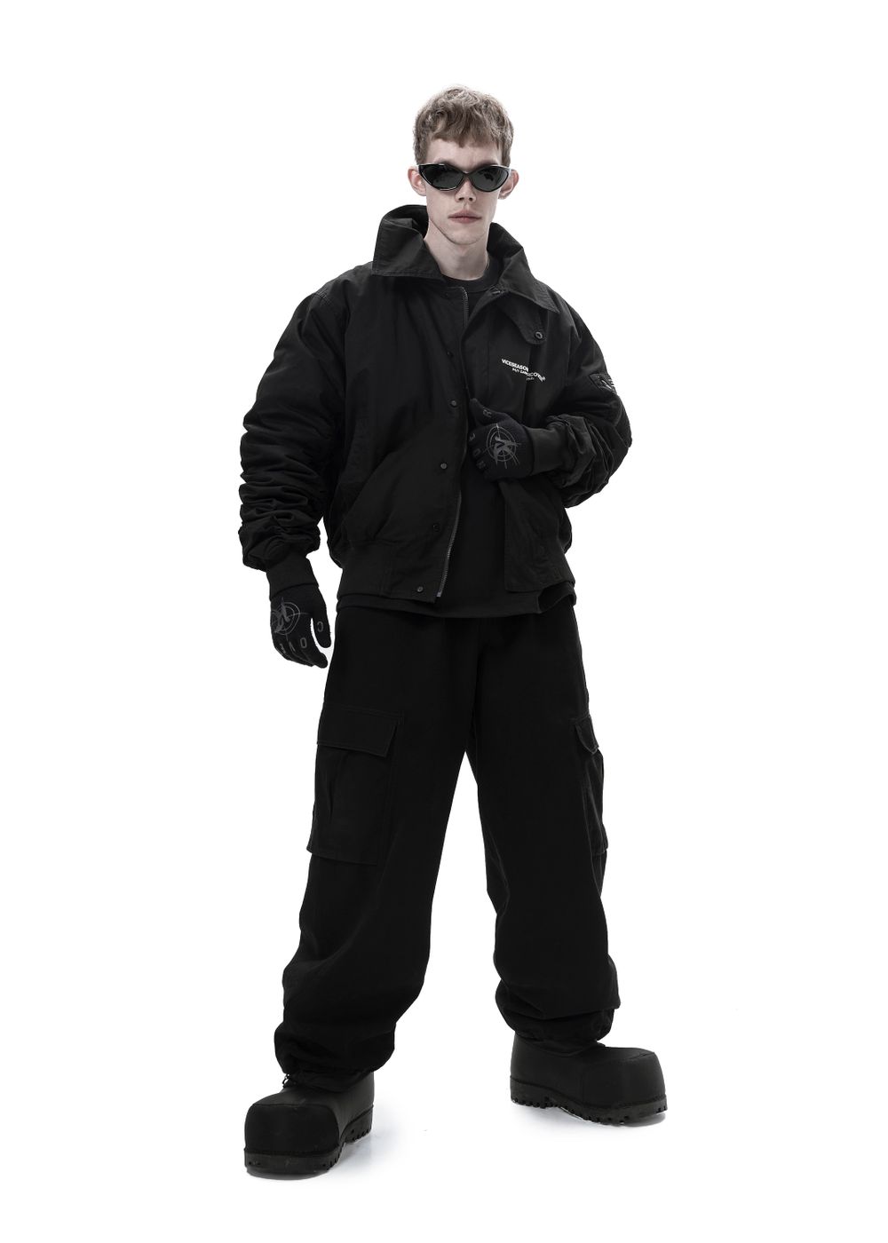 Oversized fit with a technical collar that can shift from a high stand-up collar to a classic fold-down collar. Voluminous sleeves with gathering add texture. Rugged cuffs on the sleeves and the bottom hem emphasize the bold and edgy look. Includes 2 side pockets and 2 inner pockets, one of which is zippered.