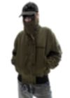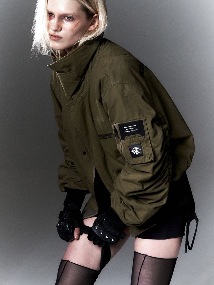 Oversized fit with a technical collar that can shift from a high stand-up collar to a classic fold-down collar. Voluminous sleeves with gathering add texture. Rugged cuffs on the sleeves and the bottom hem emphasize the bold and edgy look. Includes 2 side pockets and 2 inner pockets, one of which is zippered.