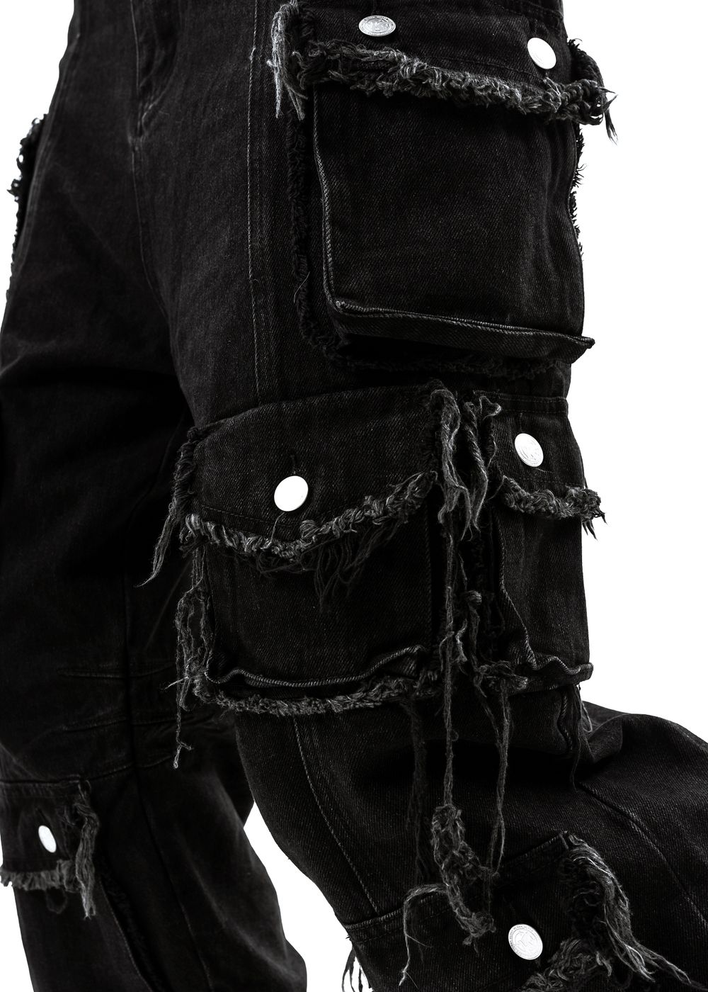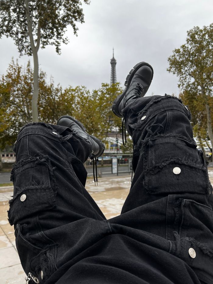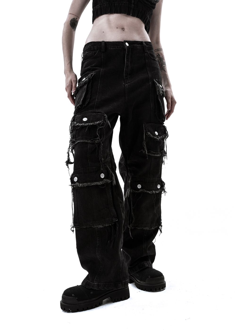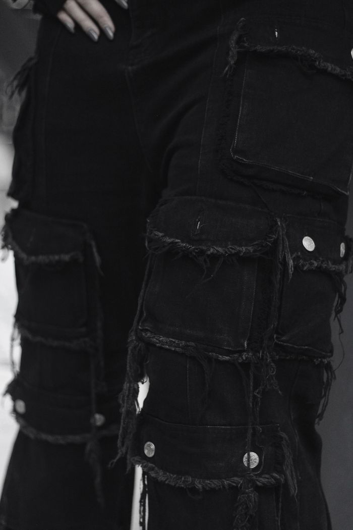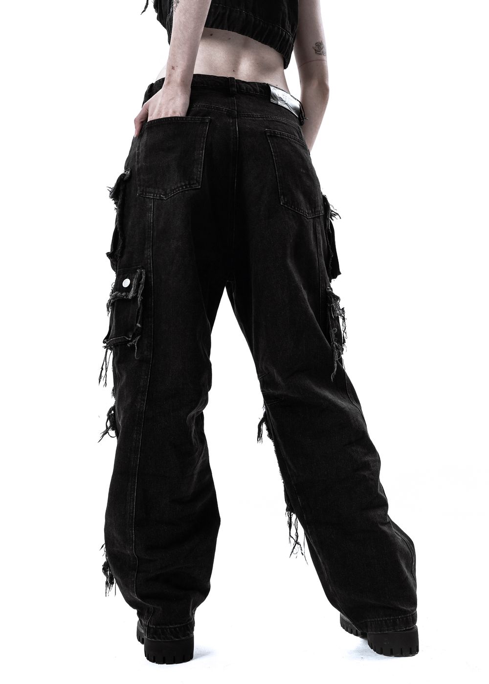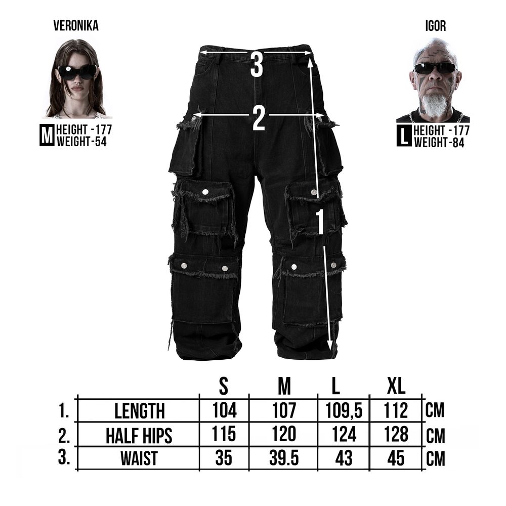 Straight, wide, oversized cargo fit. Low rise, long silhouette. 8 large, roomy outer pockets trimmed with fringe, 2 inner deep pockets and 2 back pockets. 2 front and 2 back vertical seams along the length of the jeans. All sizes are already oversized, so we recommend to take your size.