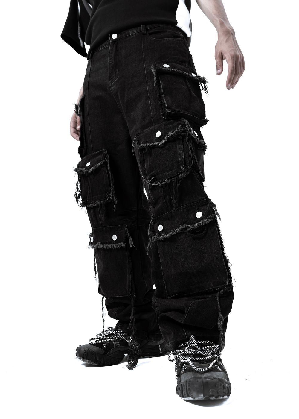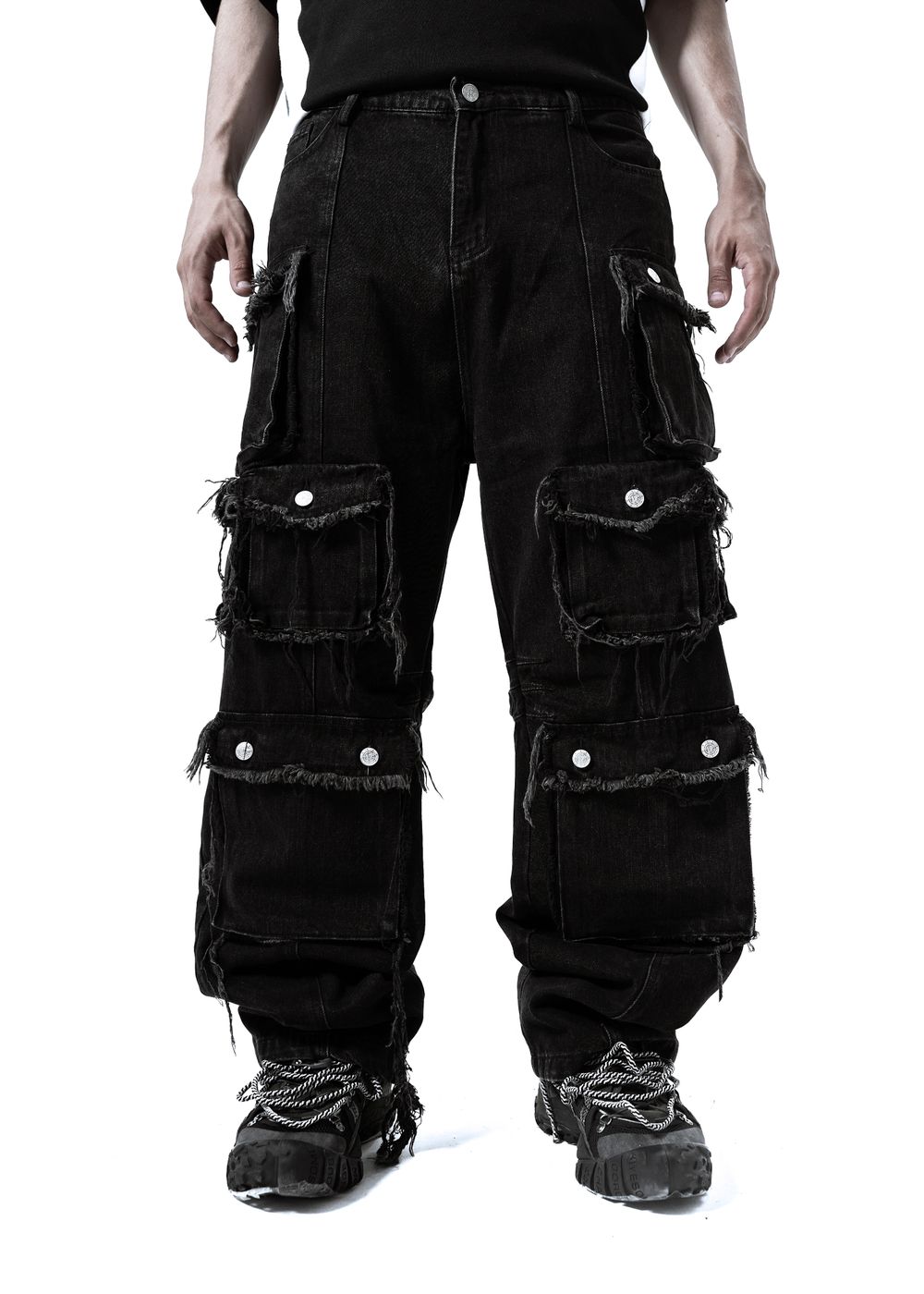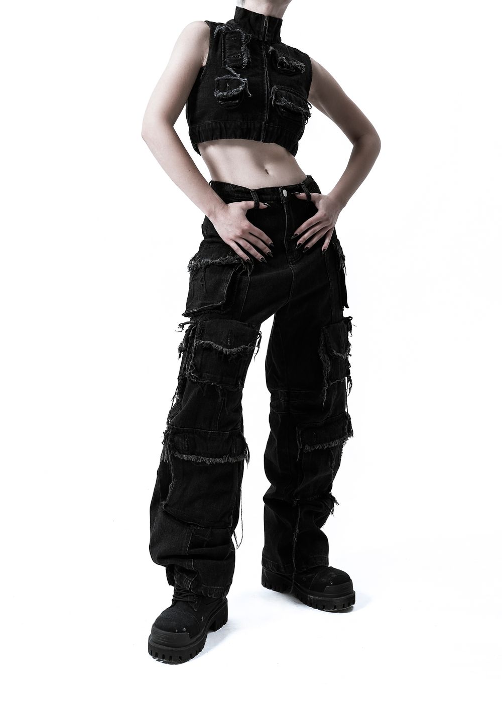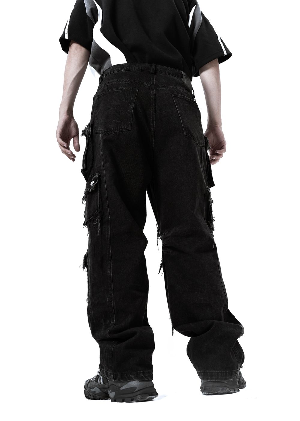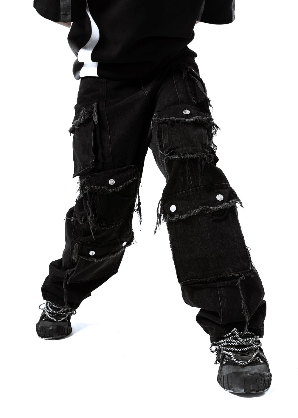 Straight, wide, oversized cargo fit. Low rise, long silhouette. 8 large, roomy outer pockets trimmed with fringe, 2 inner deep pockets and 2 back pockets. 2 front and 2 back vertical seams along the length of the jeans. All sizes are already oversized, so we recommend to take your size.