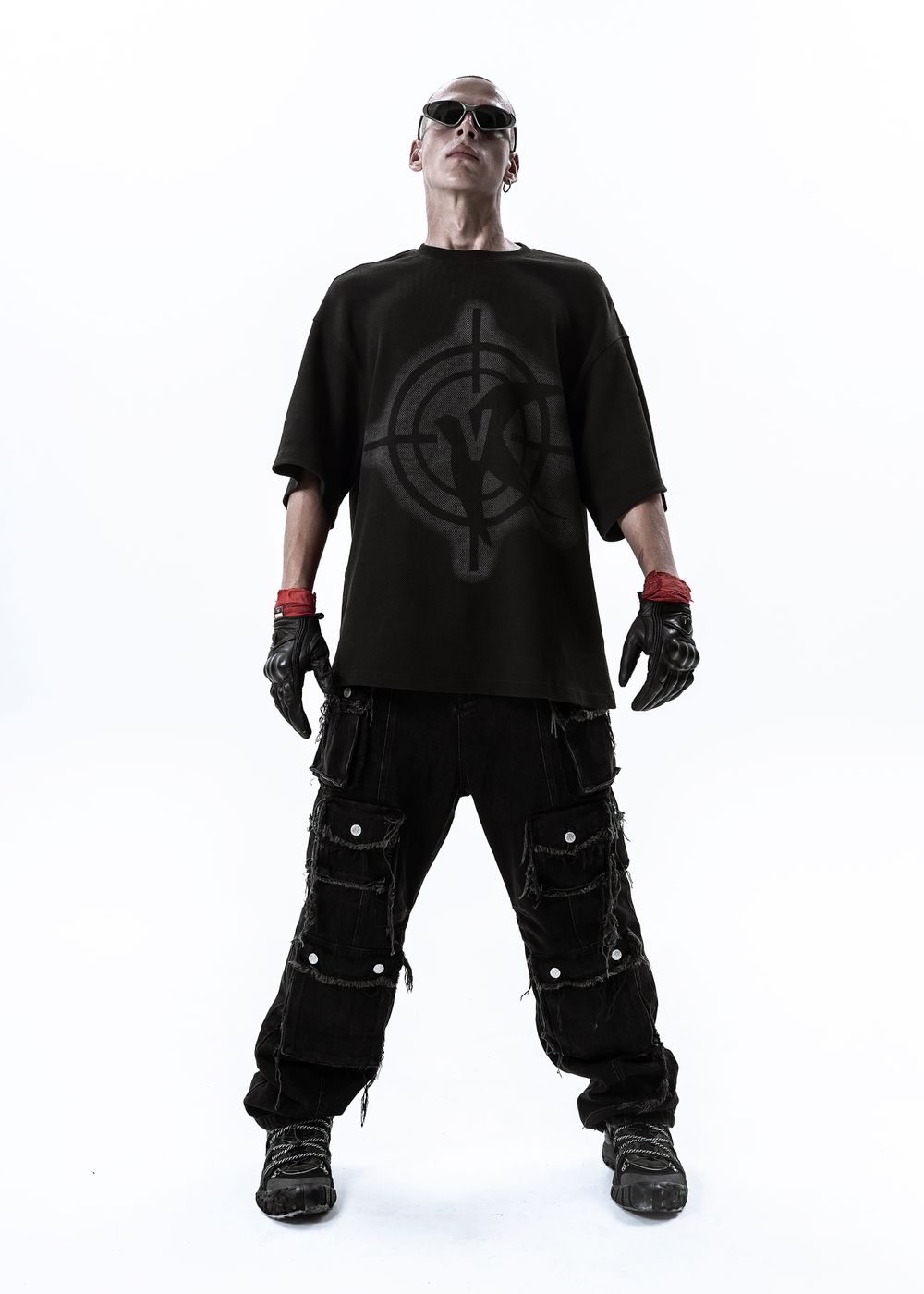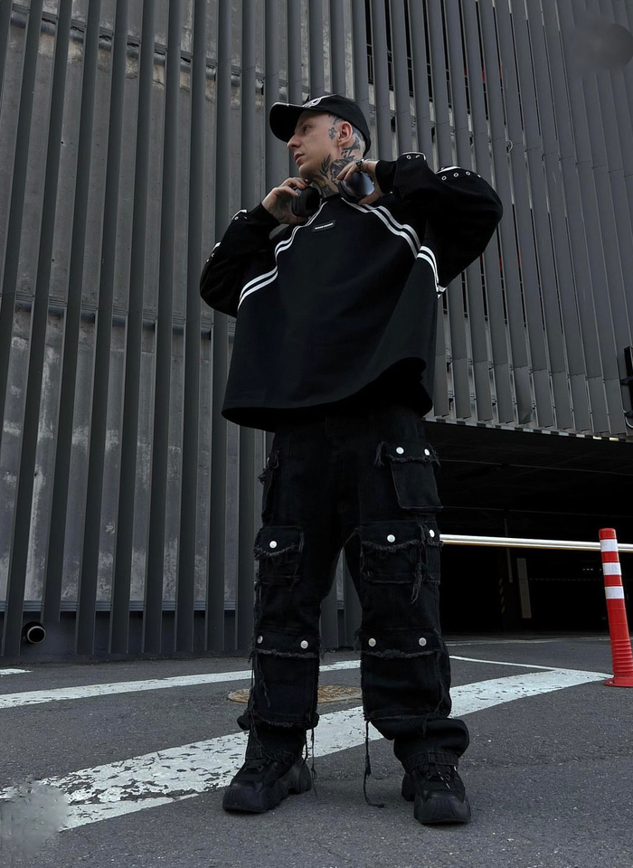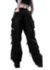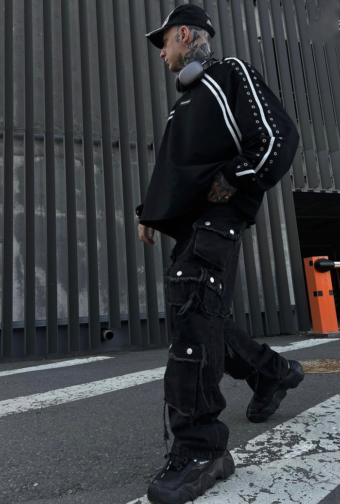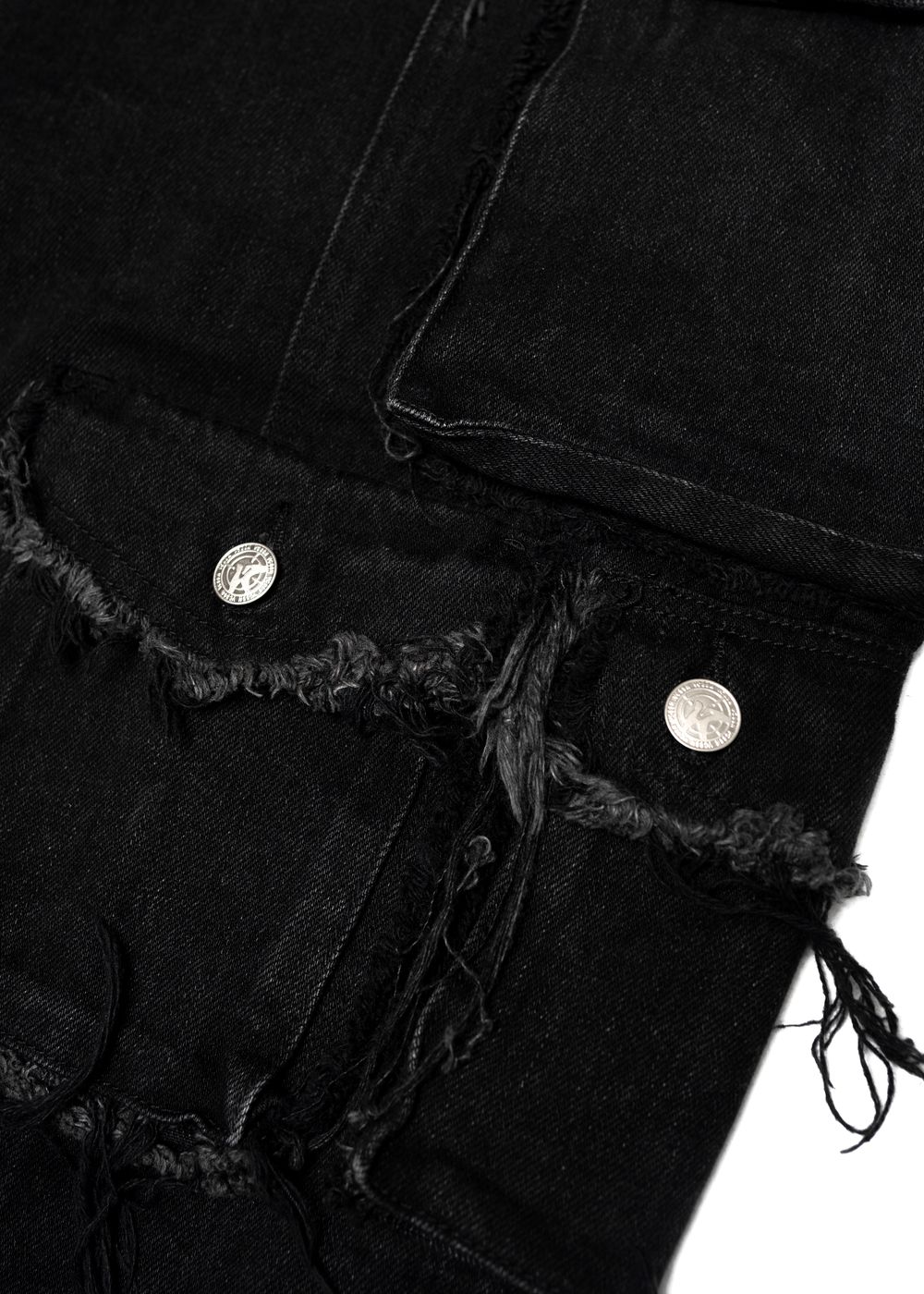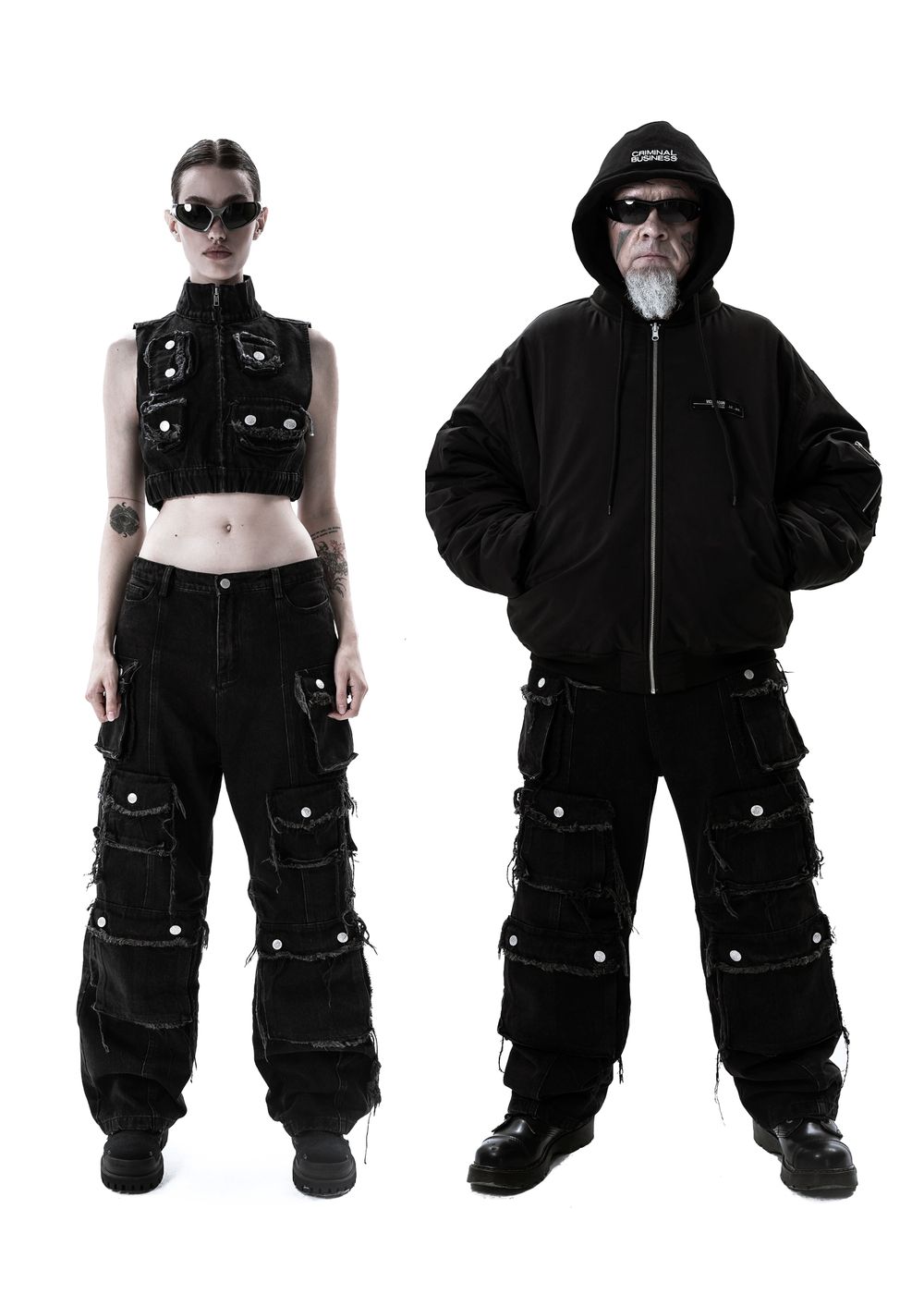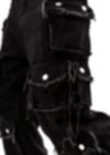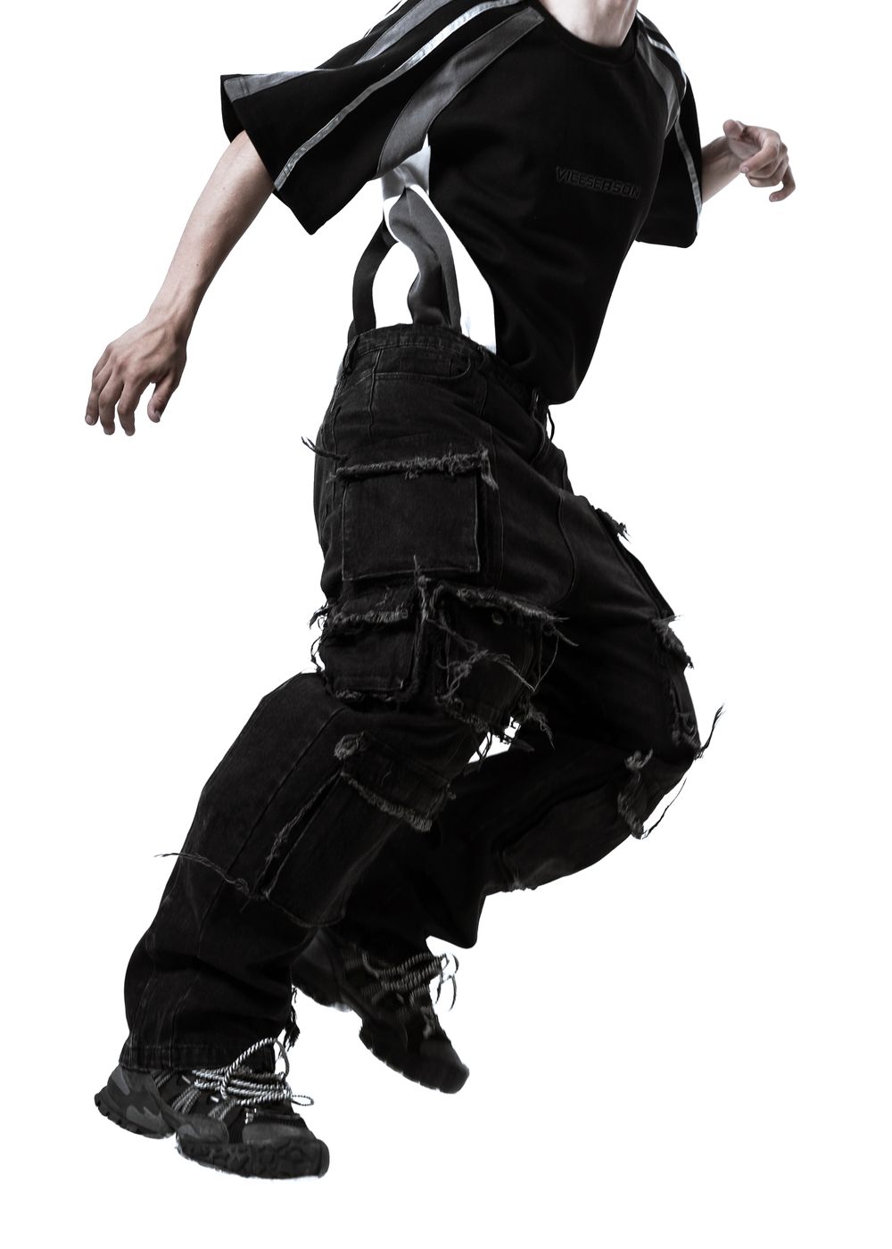 Straight, wide, oversized cargo fit. Low rise, long silhouette. 8 large, roomy outer pockets trimmed with fringe, 2 inner deep pockets and 2 back pockets. 2 front and 2 back vertical seams along the length of the jeans. All sizes are already oversized, so we recommend to take your size.