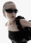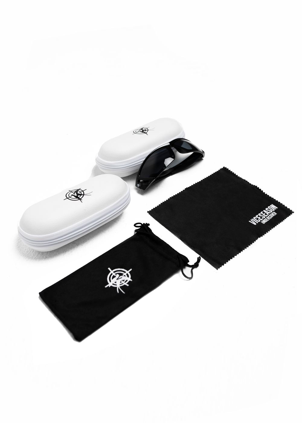 White solid case with logo print, branded bag, branded lens cleaning cloth.