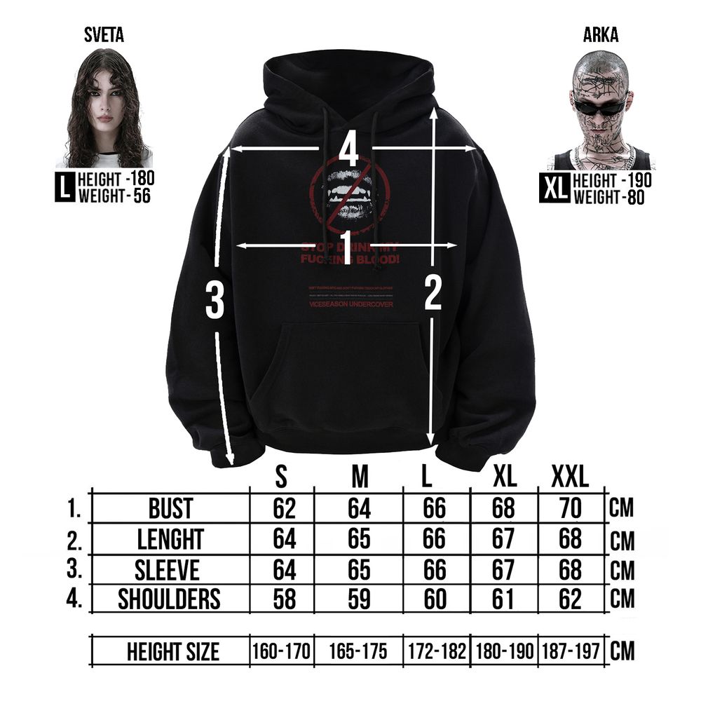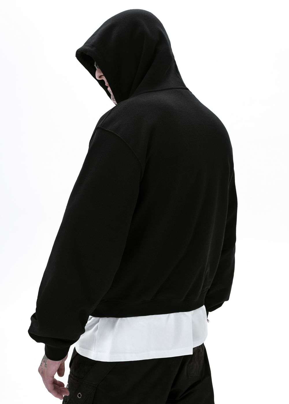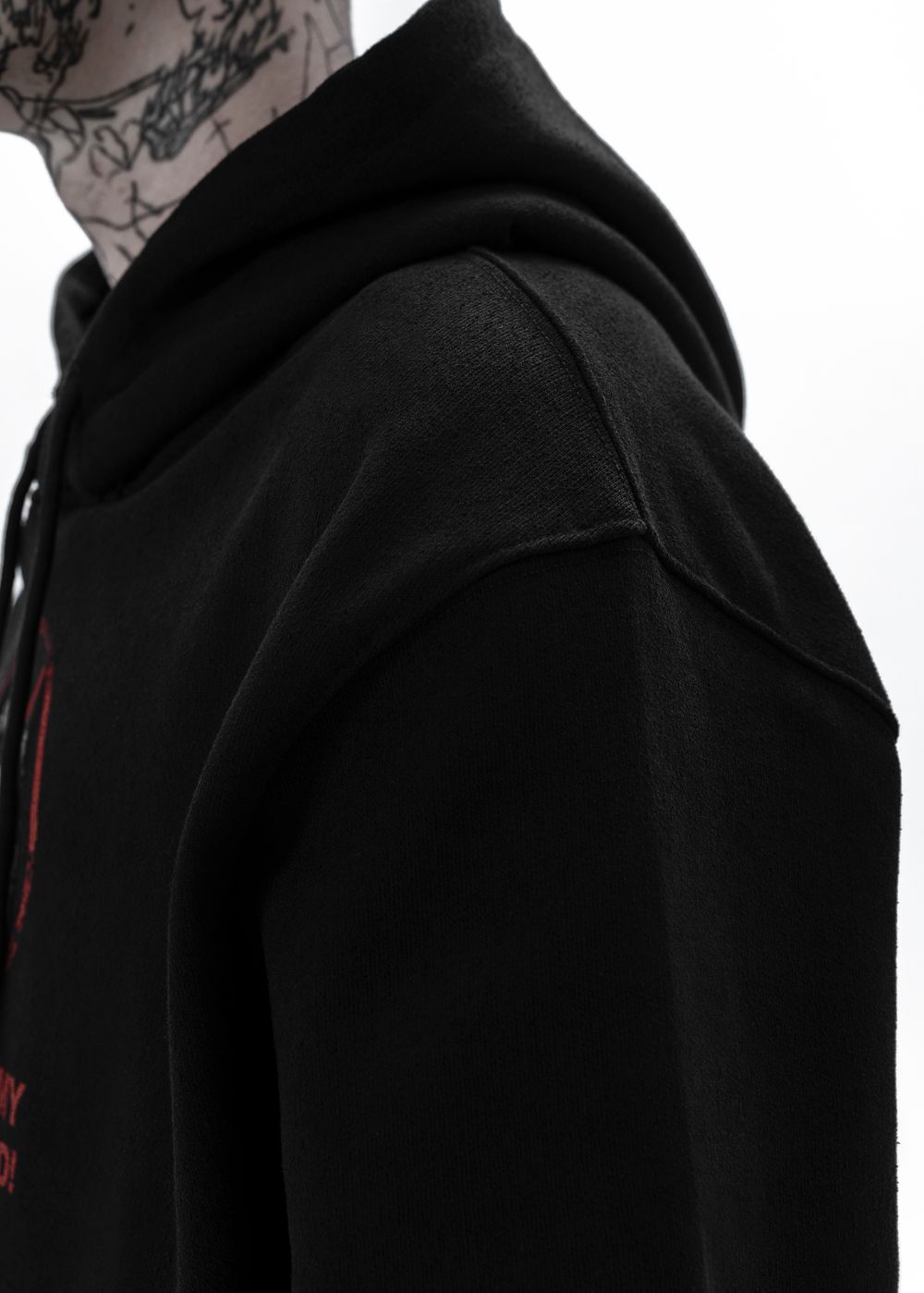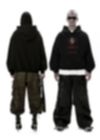 Oversized fit. Voluminous sleeves, dropped shoulder. Large hood. Front kangaroo pocket.