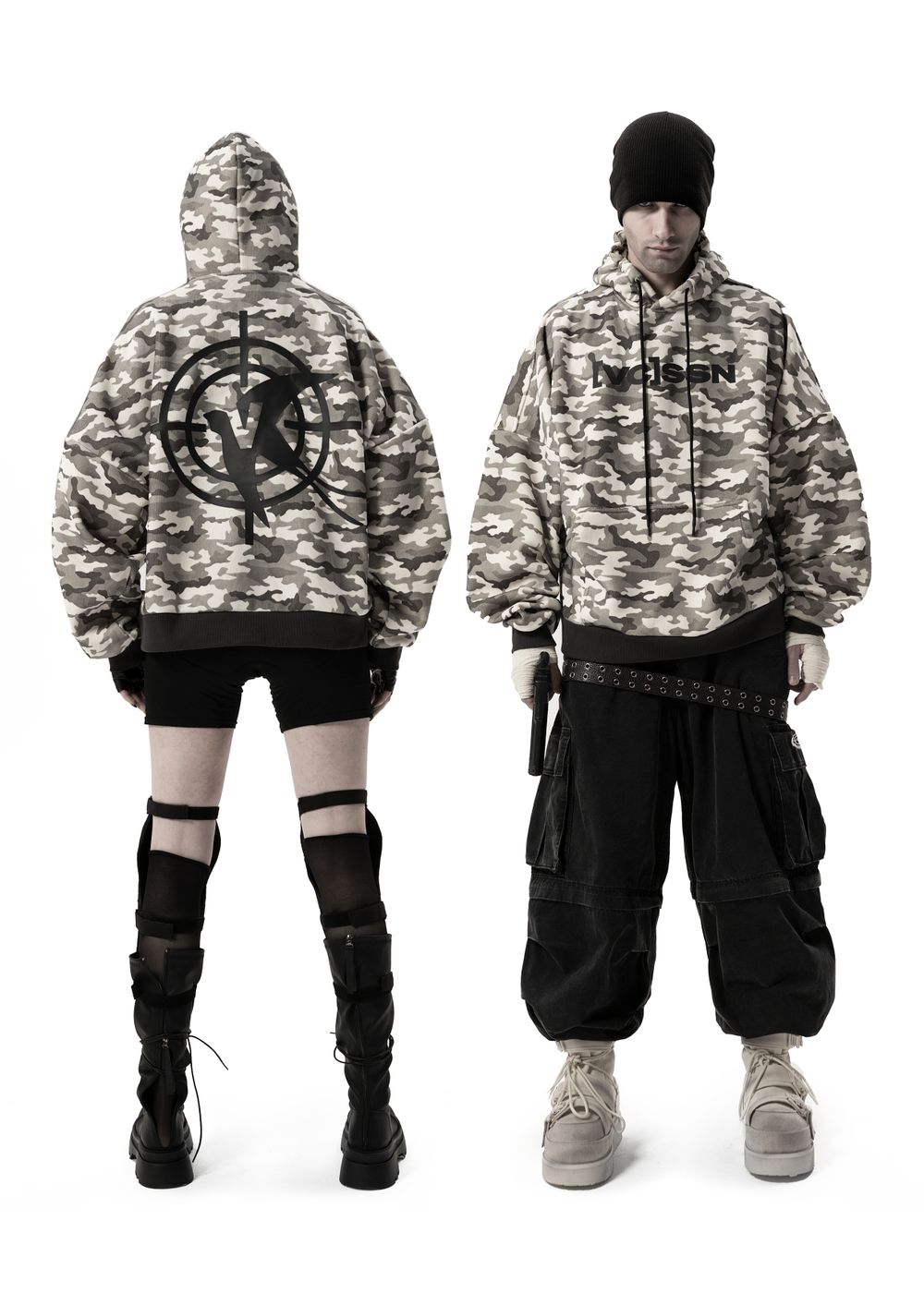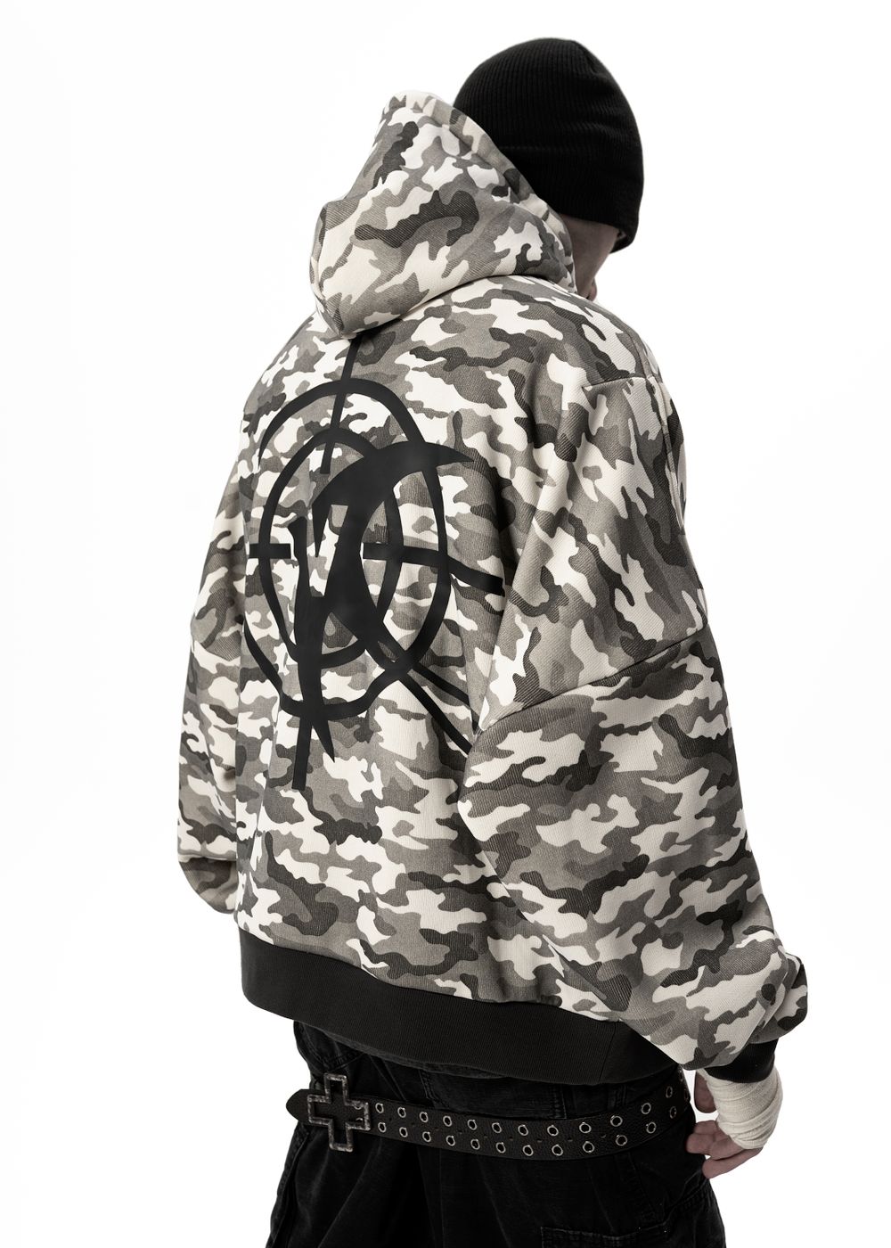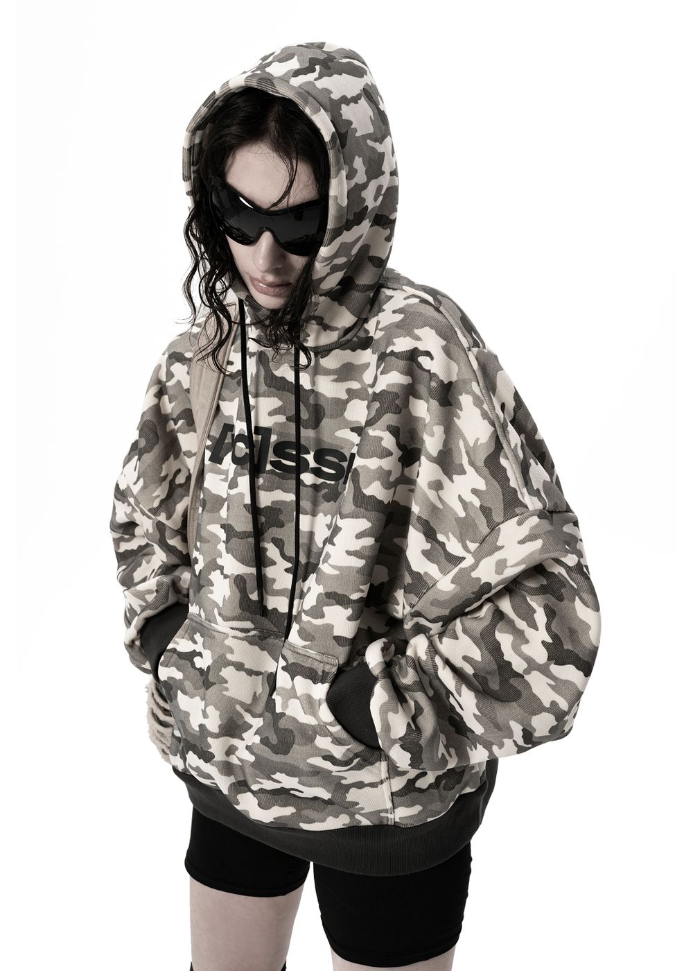 Ultra-voluminous oversized silhouette with dropped shoulders and a massive hood. Camouflage patterns on a light base create a strong visual impact.