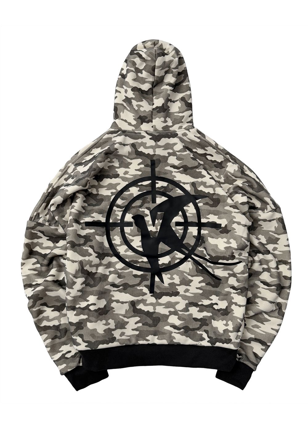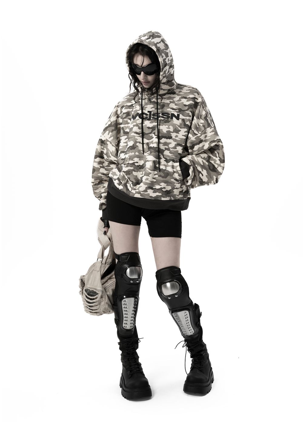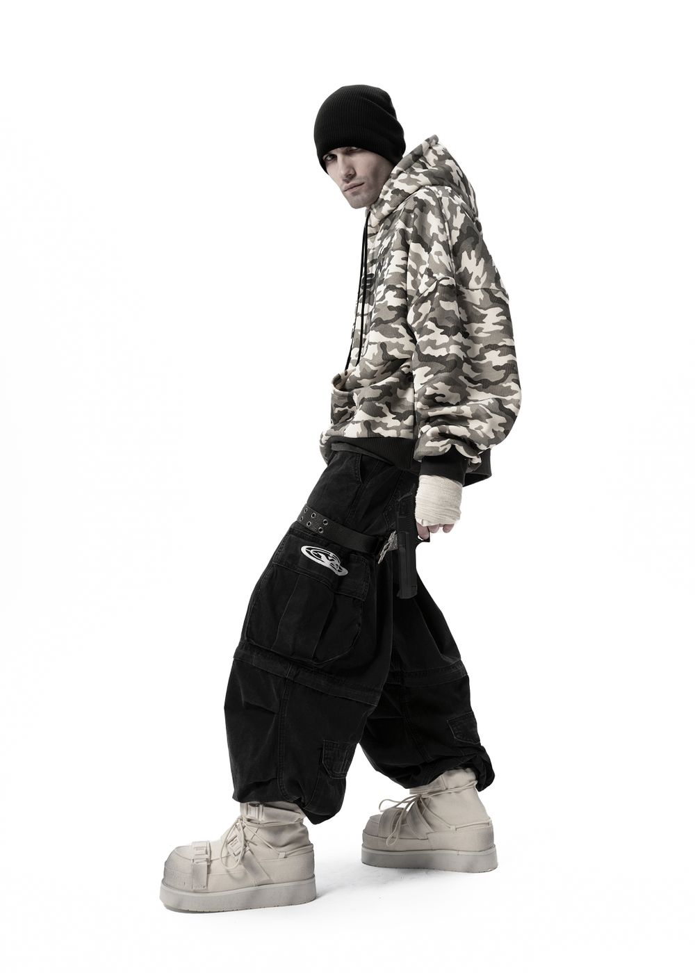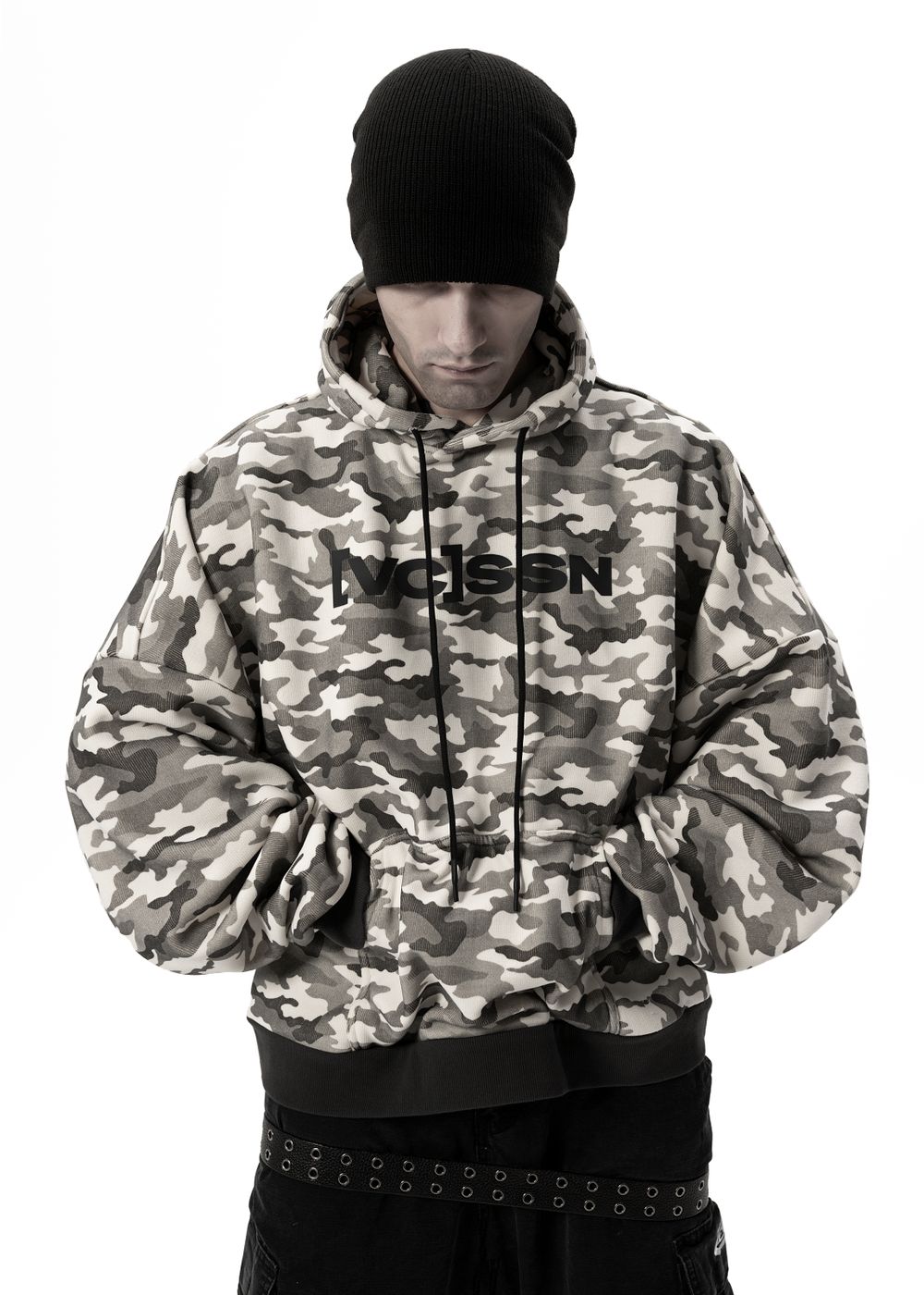 Ultra-voluminous oversized silhouette with dropped shoulders and a massive hood. Camouflage patterns on a light base create a strong visual impact.