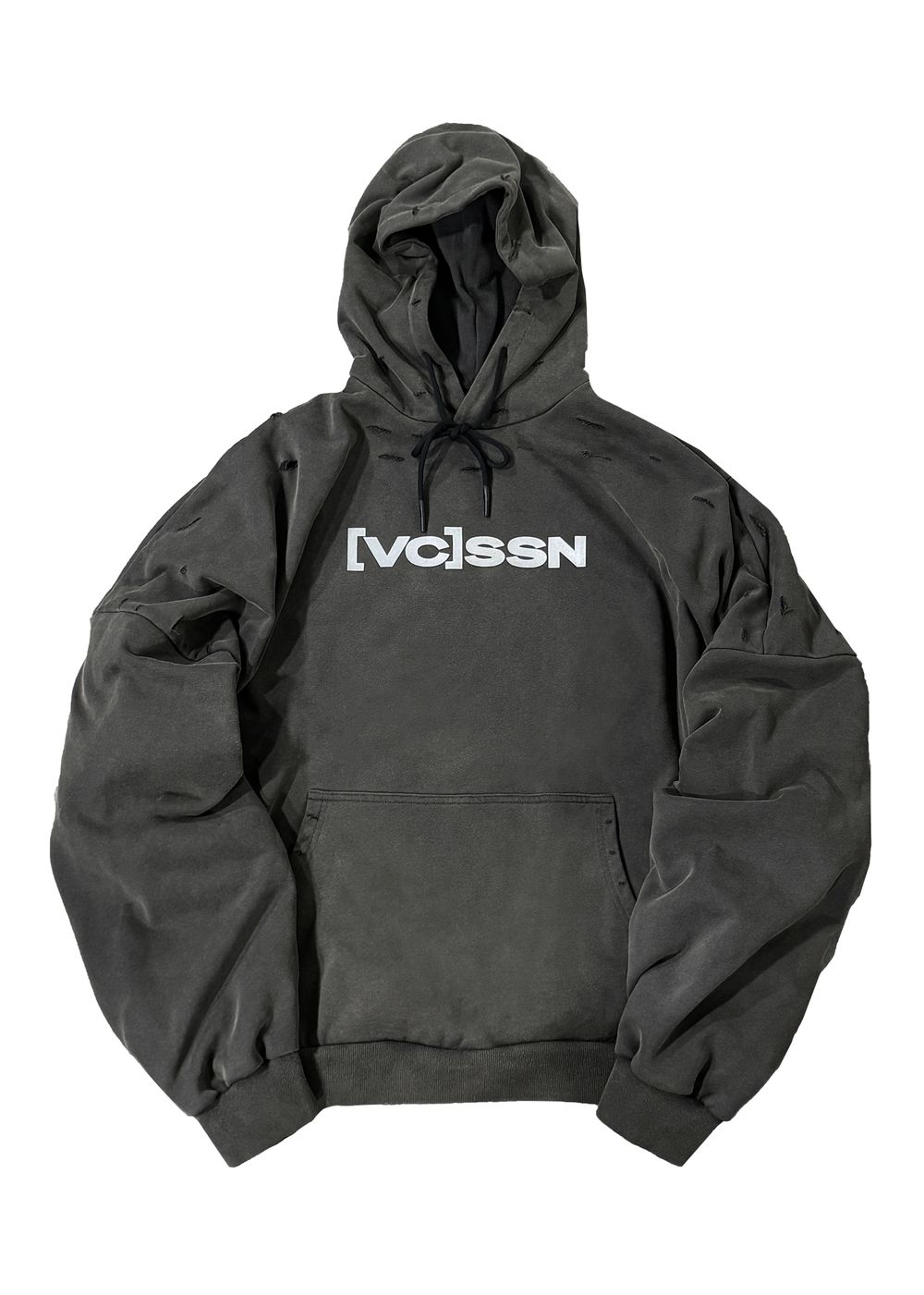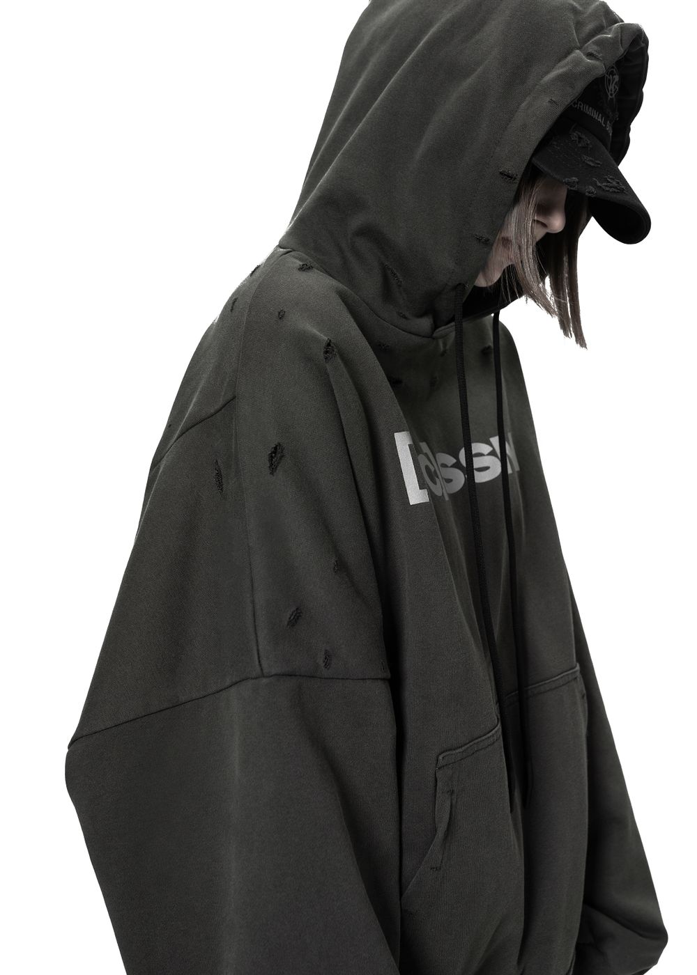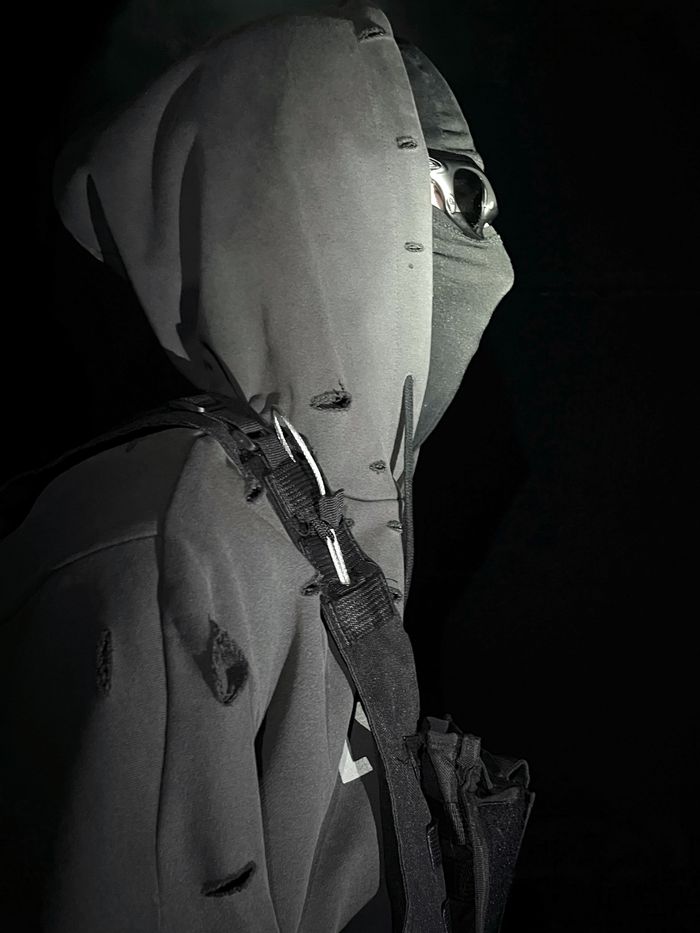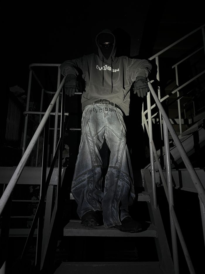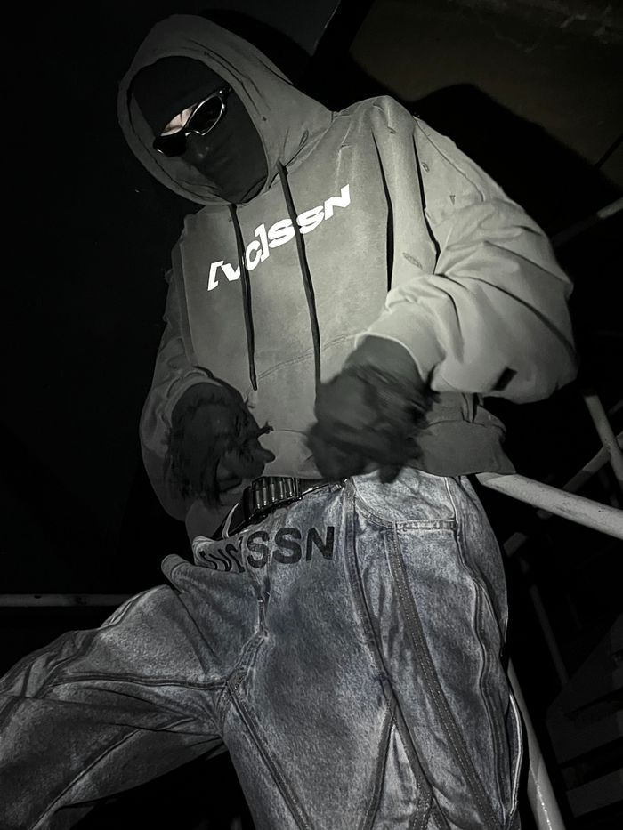 This hoodie feels as if it were carved from heavy concrete and hardened in chemicals — resulting in muted, dusty shades, as if the fabric absorbed factory smog, traces of corrosion and the silence of monolithic walls.