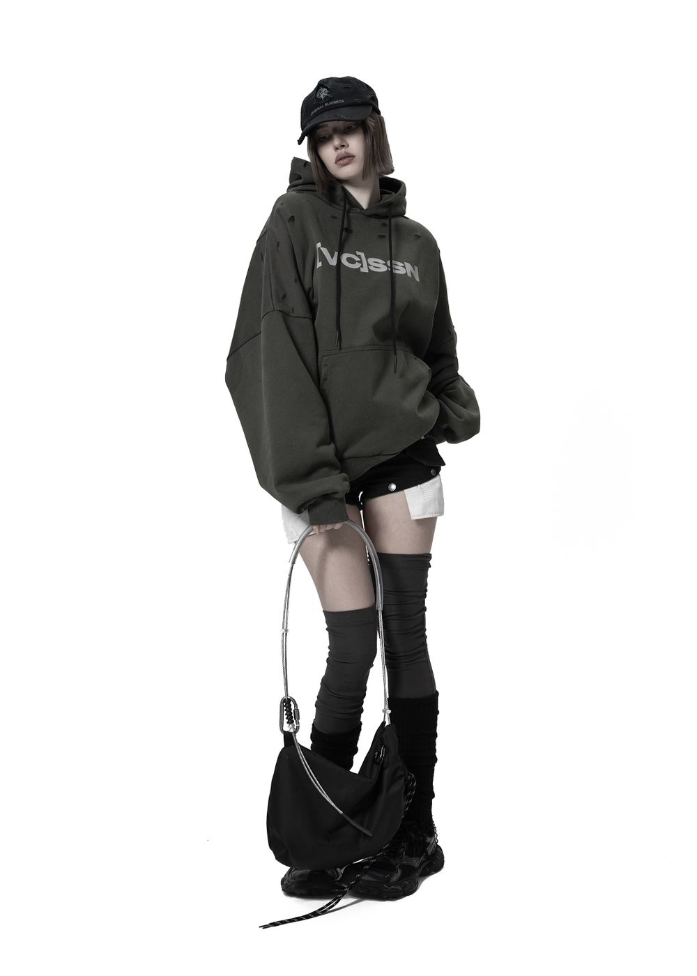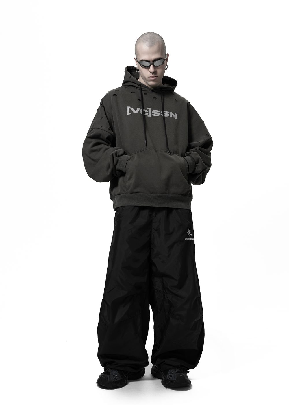 On the chest — durable [VC]SSN branding, resembling warehouse markings for hazardous materials. Basalt version features reflective print, Sepia version features matte black print.