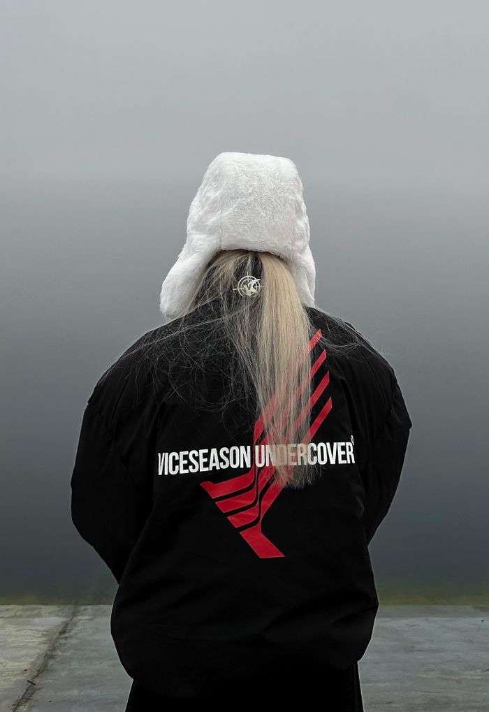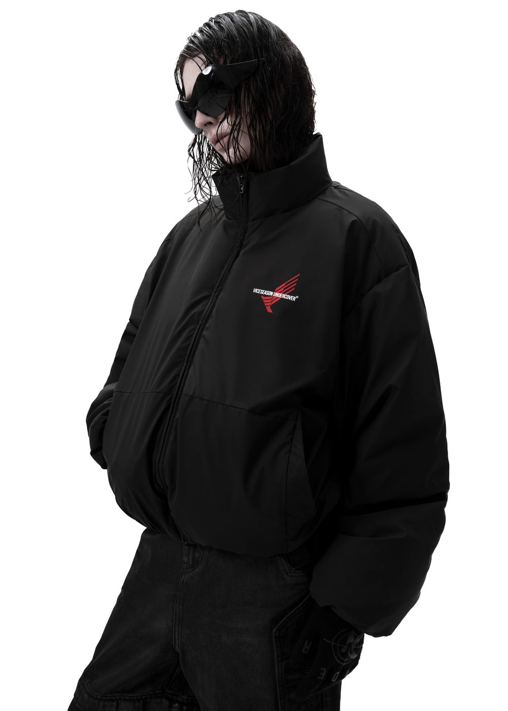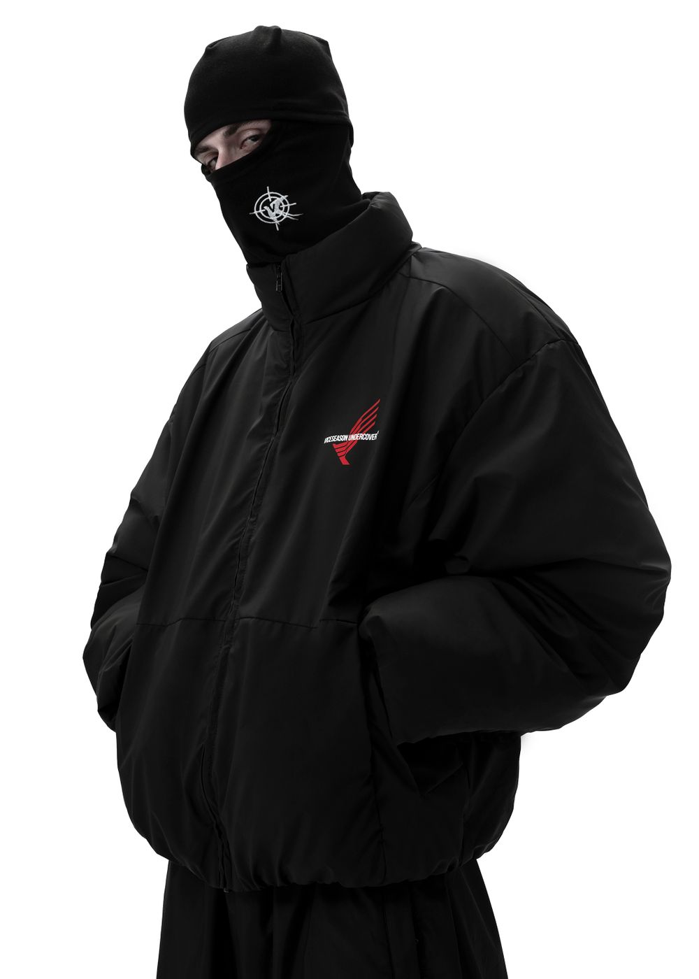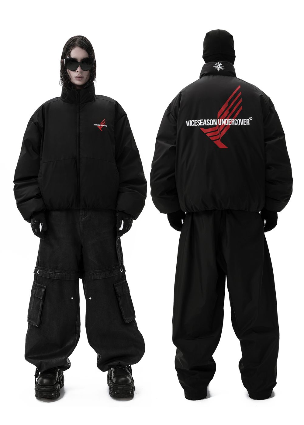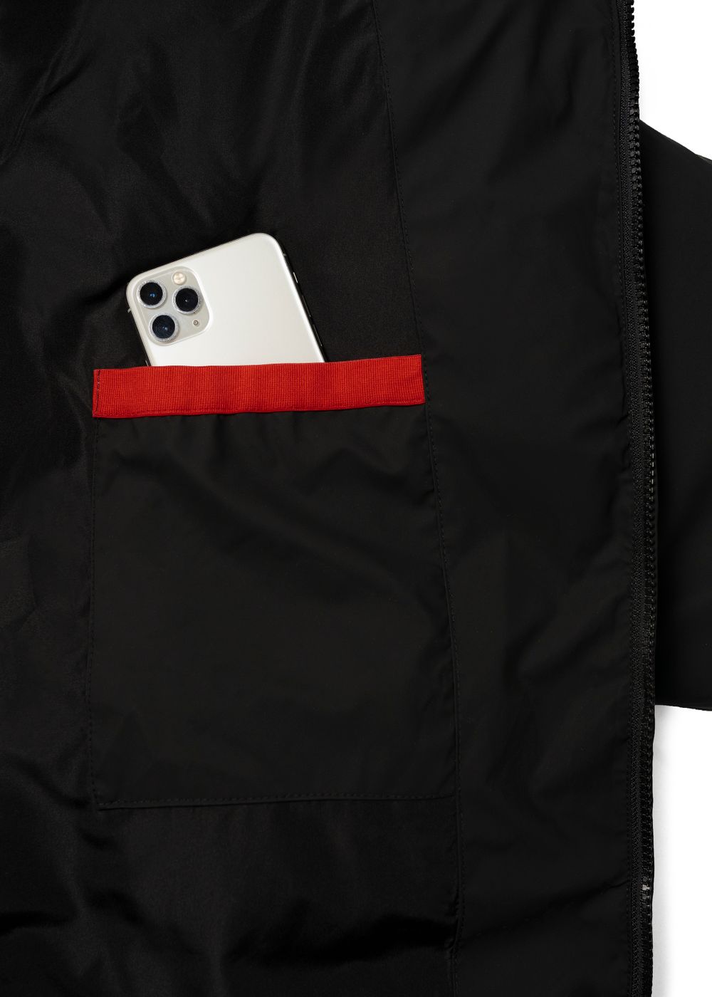 Durable YKK hardware. The jacket features a bright inner pocket and a hanger loop. 2 side zip pockets with a fleece lining for warmth. Branding print with a bright red element on the left chest, a similar large print on the back, and a logo print on the high stand-up collar. Hidden elastic cuffs around the hem and sleeves protect against wind. All sizes have an oversized fit; we recommend choosing your regular size.