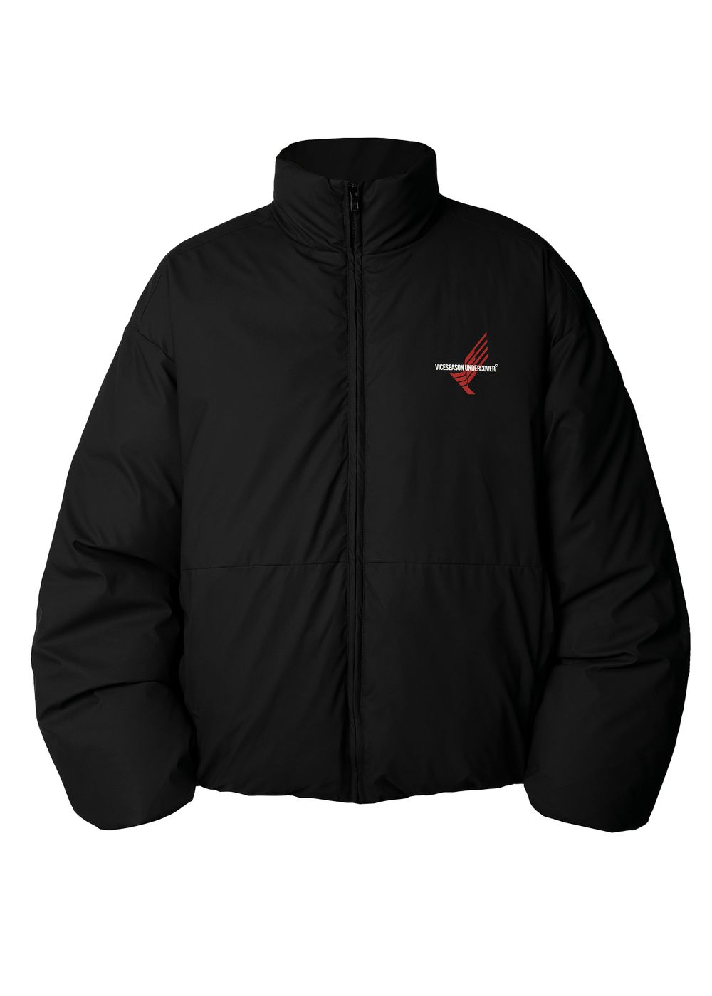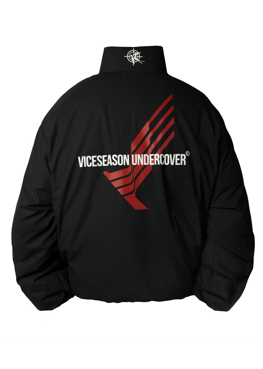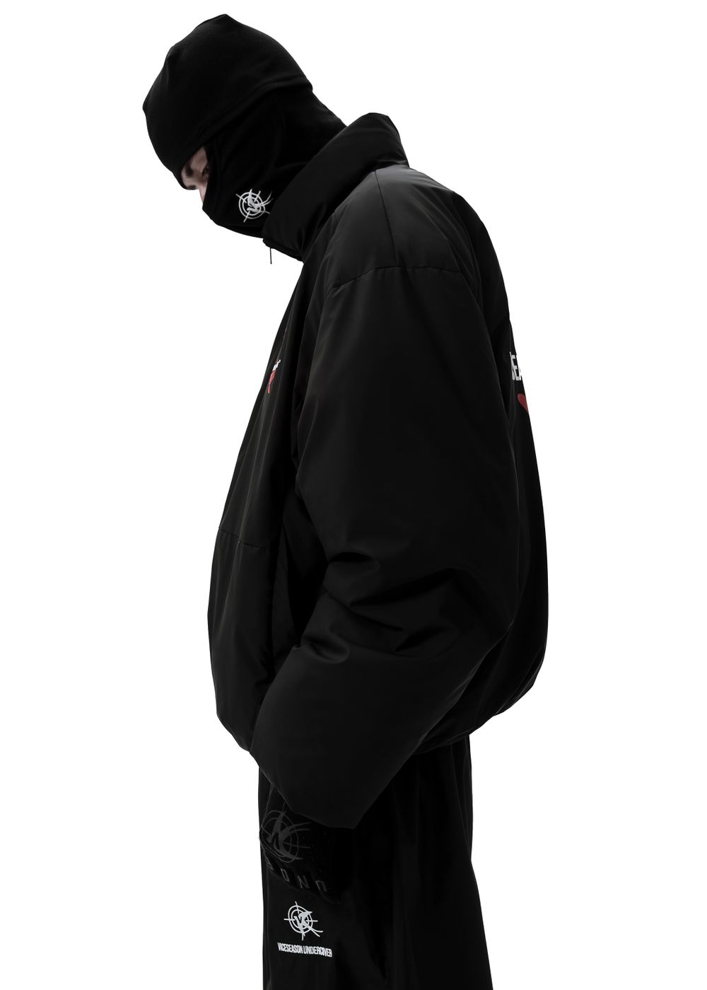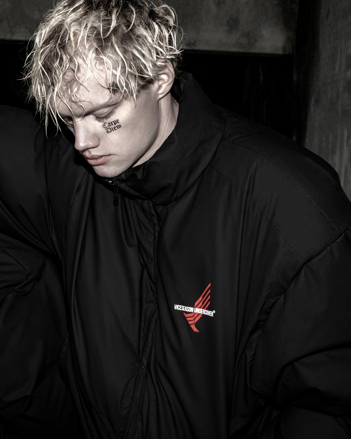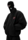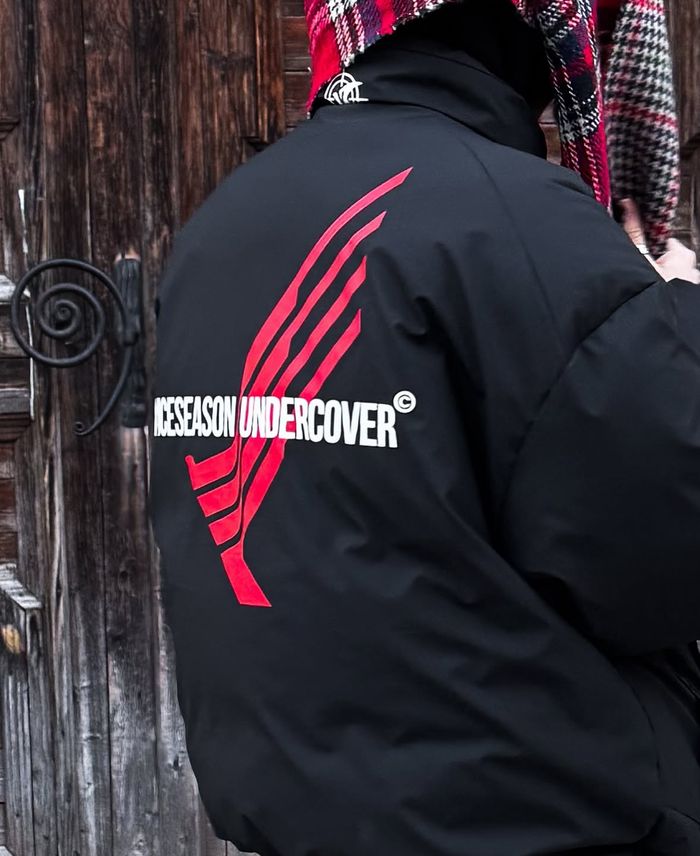 Durable YKK hardware. The jacket features a bright inner pocket and a hanger loop. 2 side zip pockets with a fleece lining for warmth. Branding print with a bright red element on the left chest, a similar large print on the back, and a logo print on the high stand-up collar. Hidden elastic cuffs around the hem and sleeves protect against wind. All sizes have an oversized fit; we recommend choosing your regular size.
