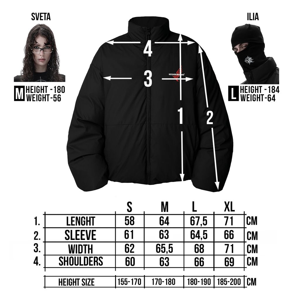 Outer material - black matte polyurethane, known for its durability and resistance to harsh conditions. It is highly resistant to mechanical damage and waterproof. The material is water-repellent, but not waterproof. Filling - 90% duck down / 10% duck feather. Suitable for temperatures down to -30°C.