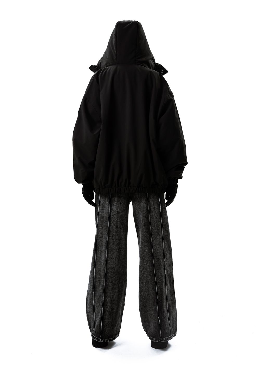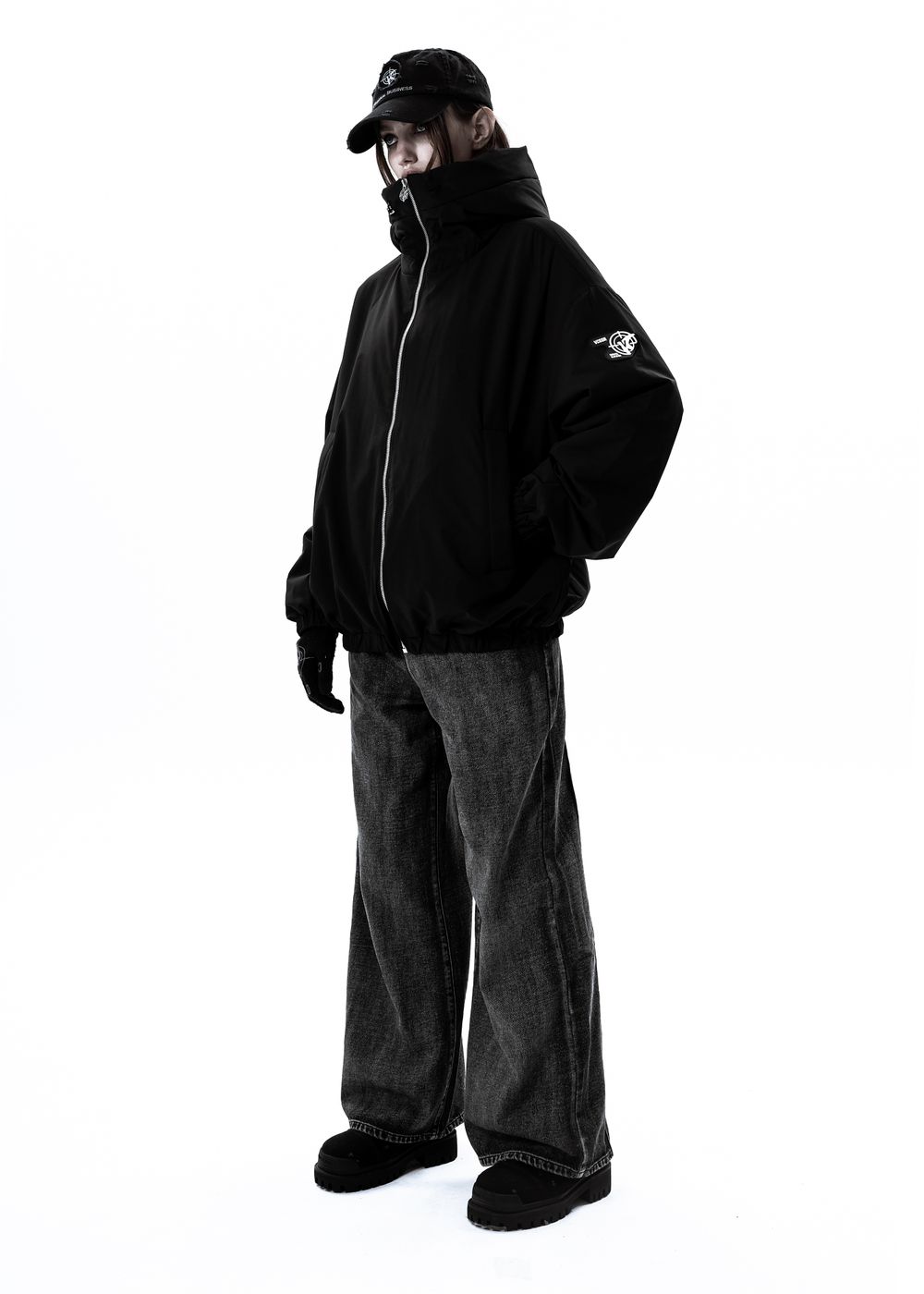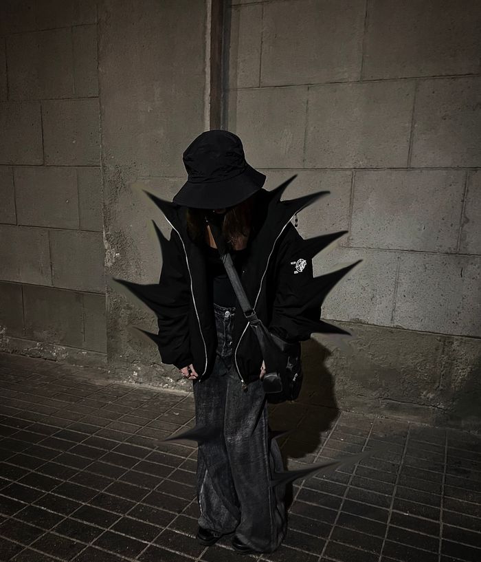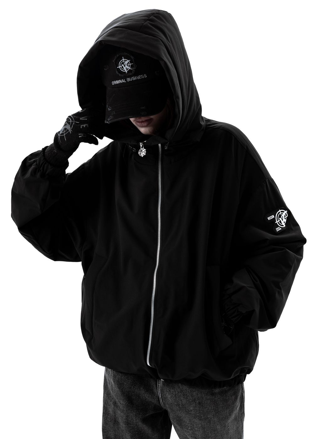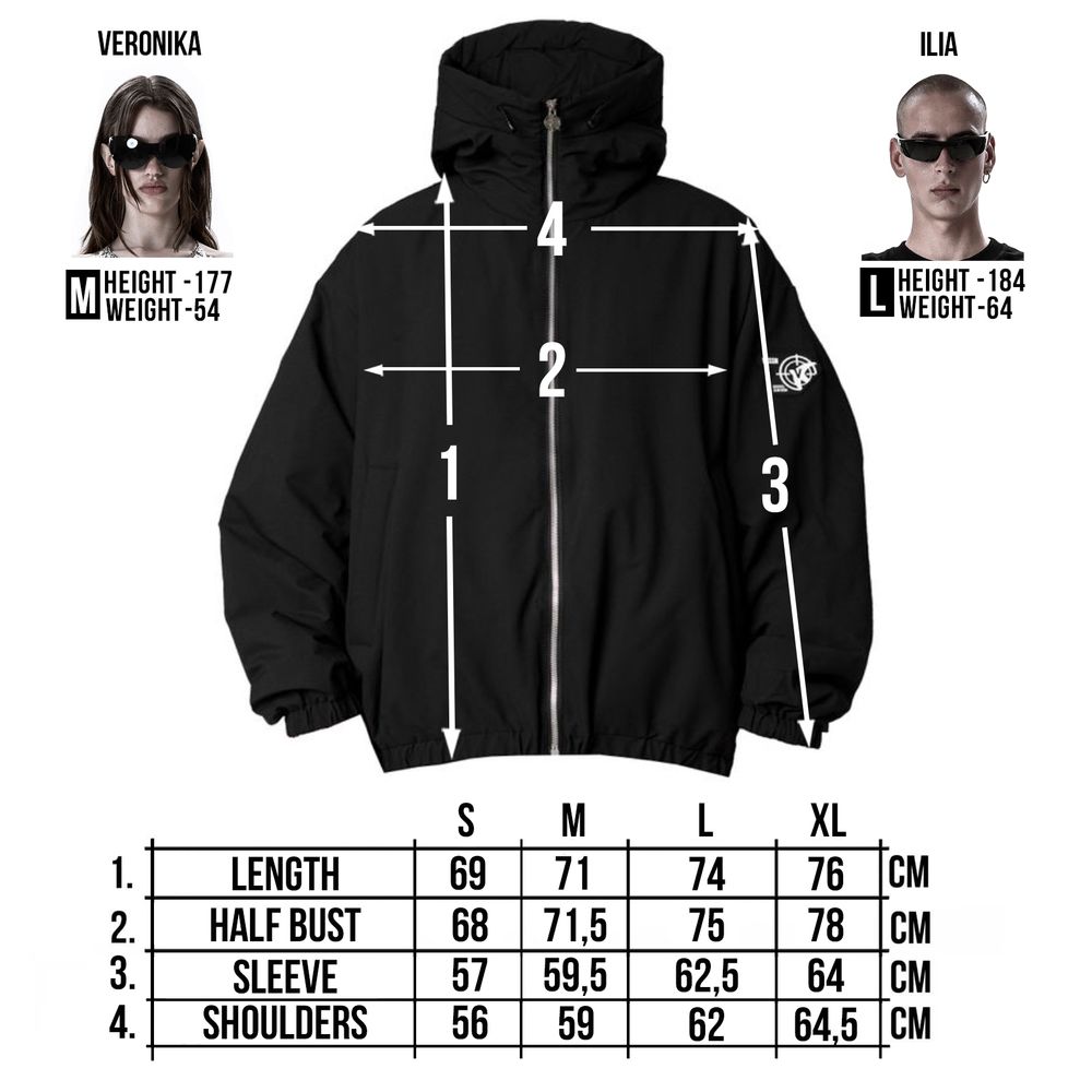 Oversized fit. The jacket is light, does not give a feeling of heaviness, but due to the thin down layer inside it perfectly keeps warmth in windy weather. The deep hood with a high collar, adjustable with elastic bands. 2 zipped side pockets with soft fleece inside. Inside pocket with zipper. All sizes are oversized, so we recommend to take your size.