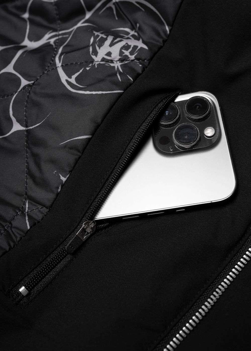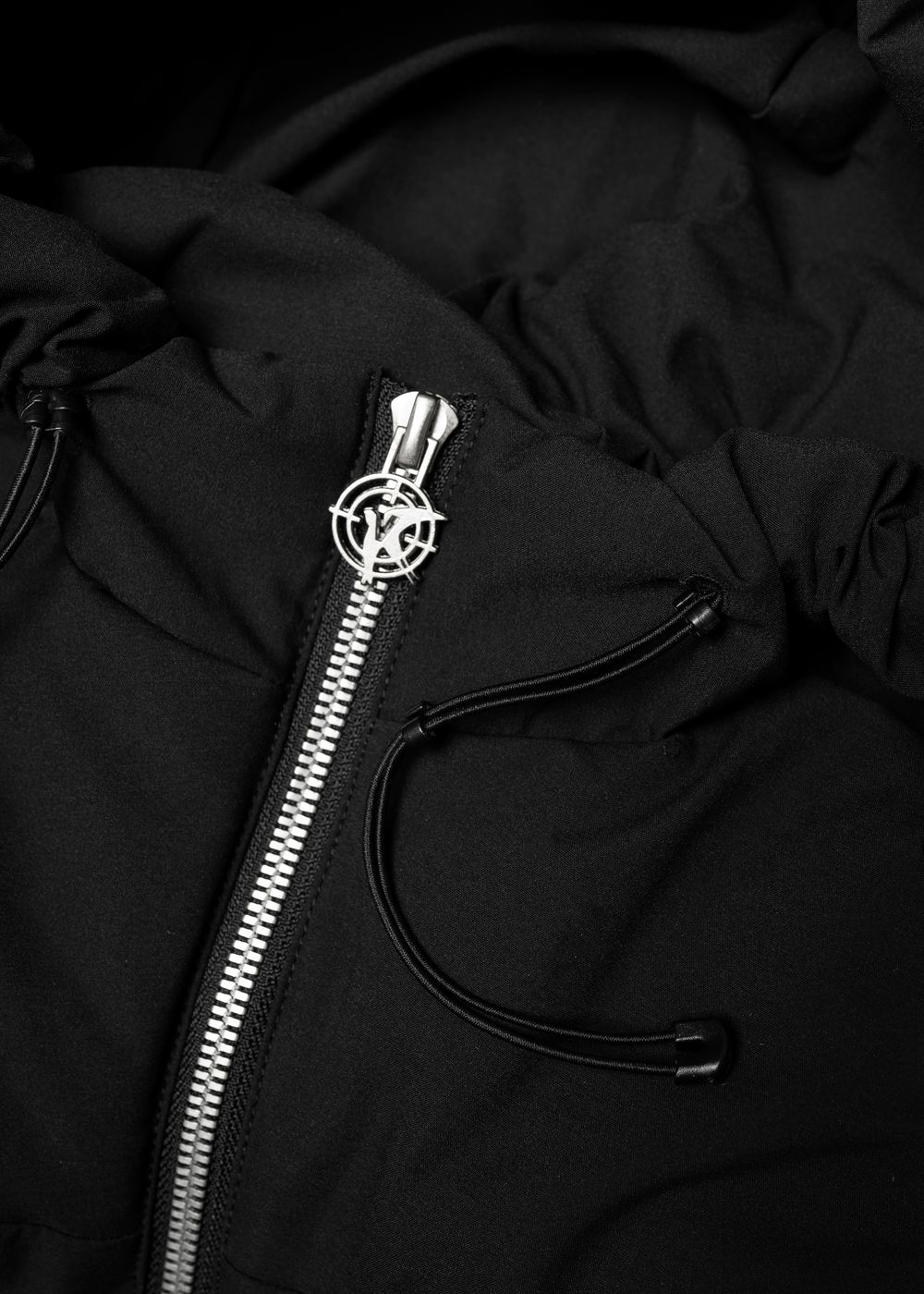 Branded zipper with metal logo. YKK zippers on pockets, including the inner one. Round elastic bands and technological fasteners with fasteners added into the hood.