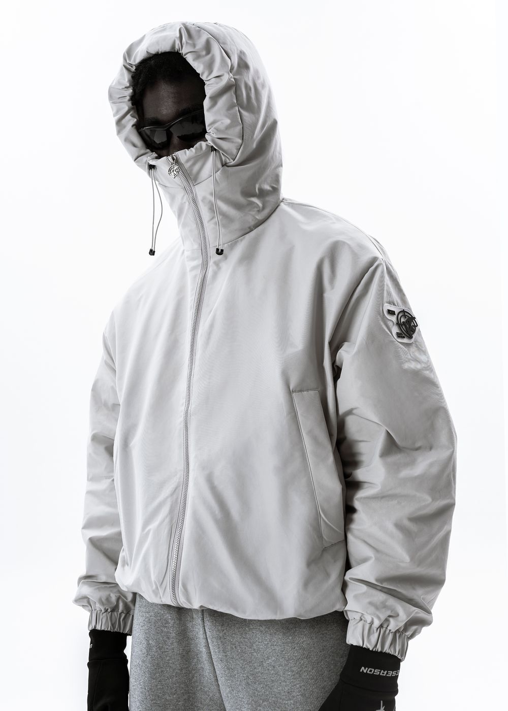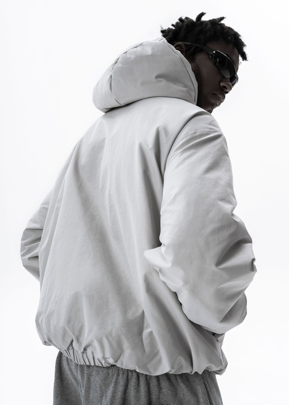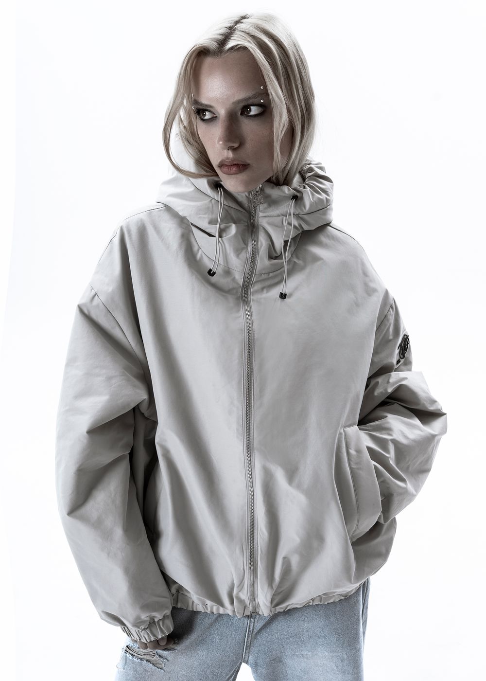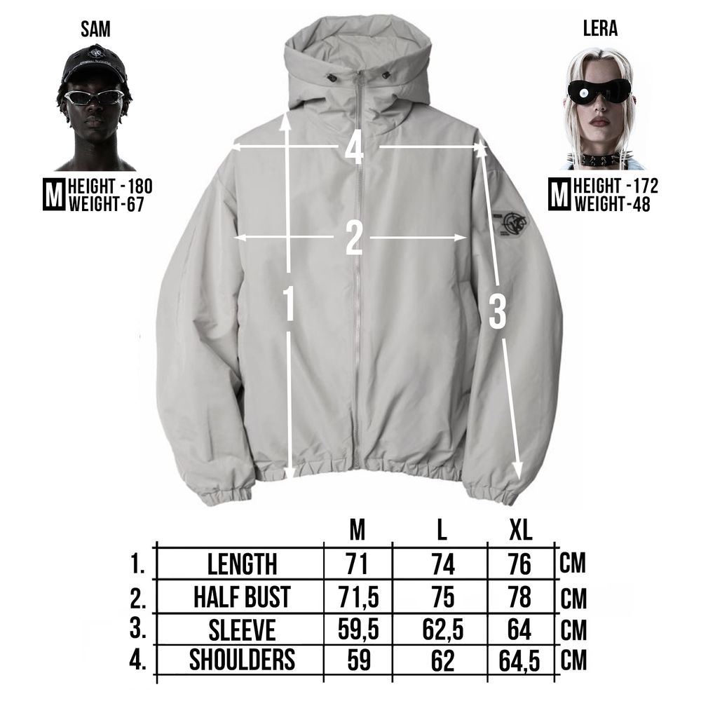 Oversized fit. The jacket is light, does not give a feeling of heaviness, but due to the thin down layer inside it perfectly keeps warmth in windy weather. The deep hood with a high collar, adjustable with elastic bands. 2 zipped side pockets with soft fleece inside. Inside pocket with zipper. All sizes are oversized, so we recommend to take your size.