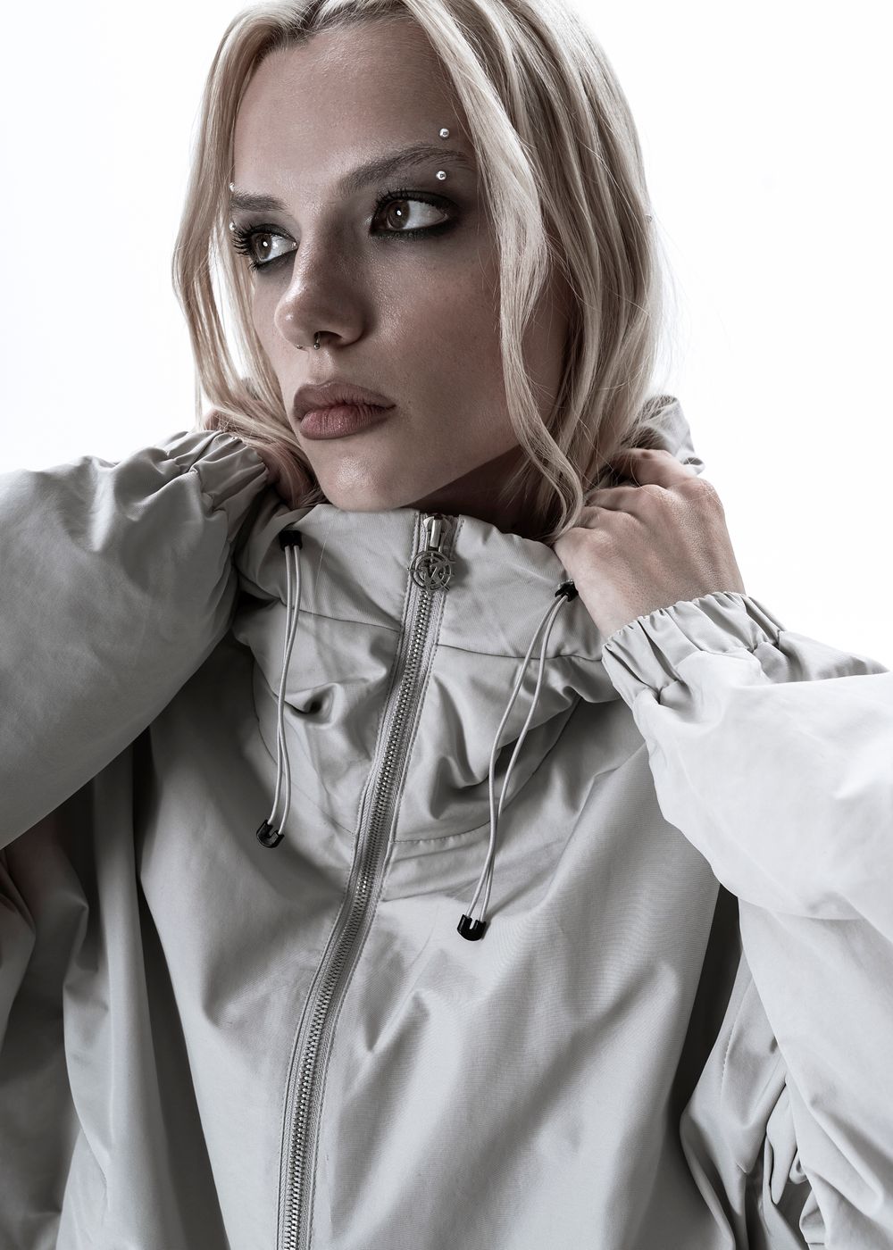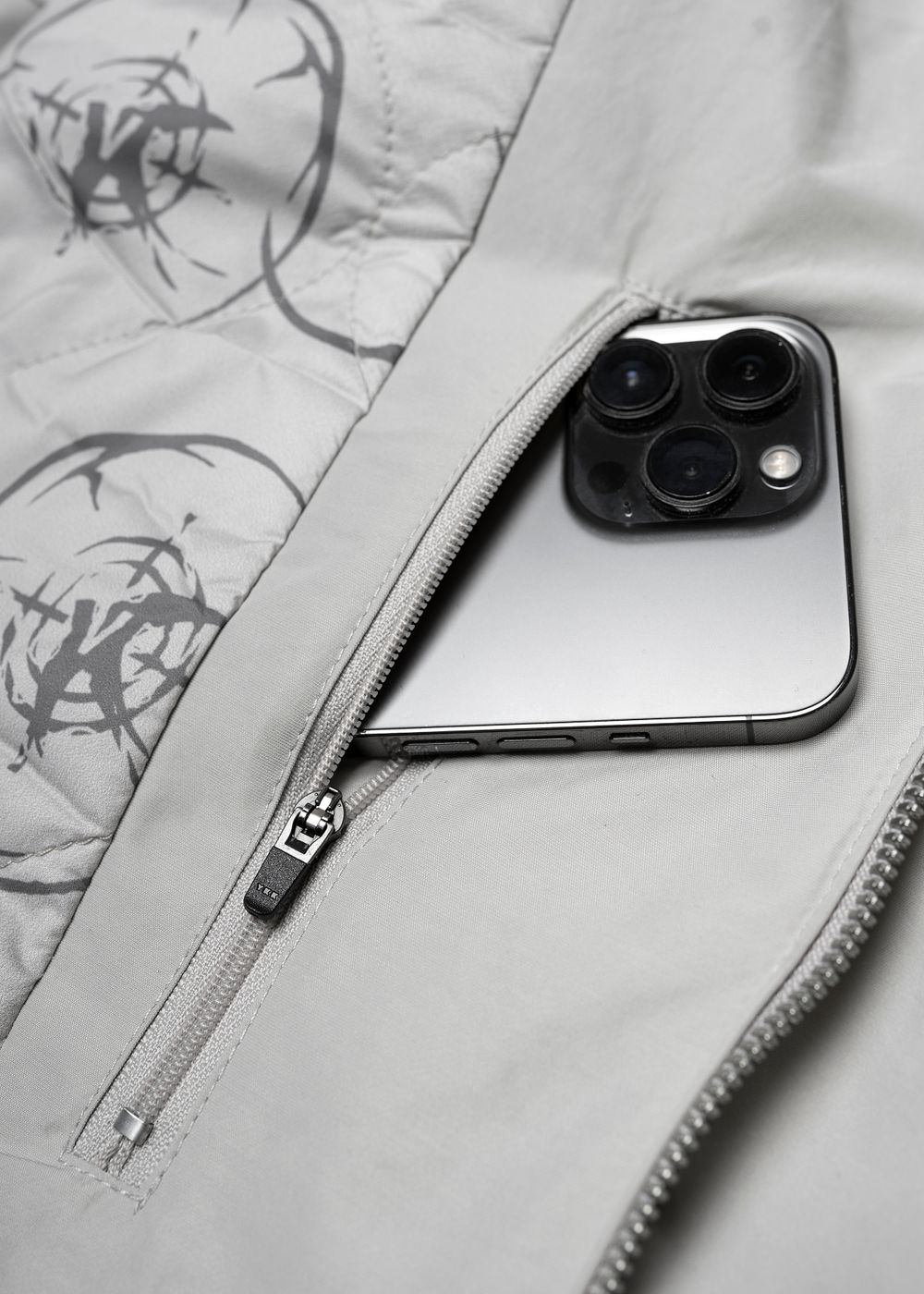 Branded zipper with metal logo. YKK zippers on pockets, including the inner one. Round elastic bands and technological fasteners with fasteners added into the hood.