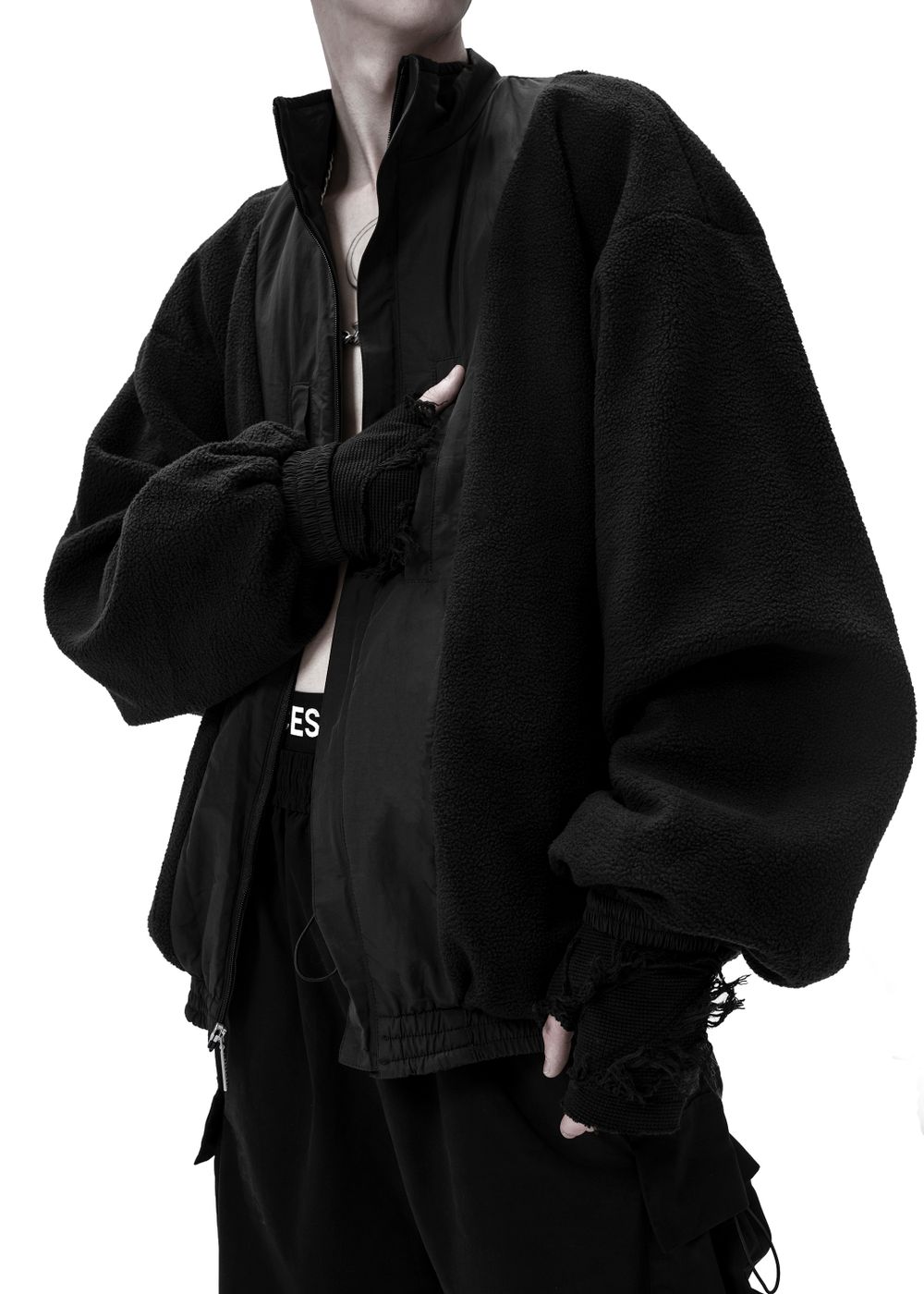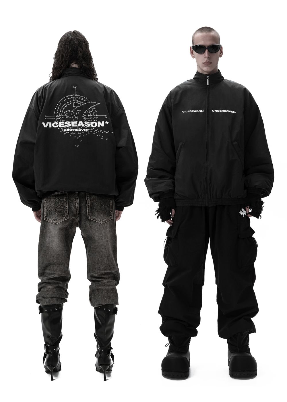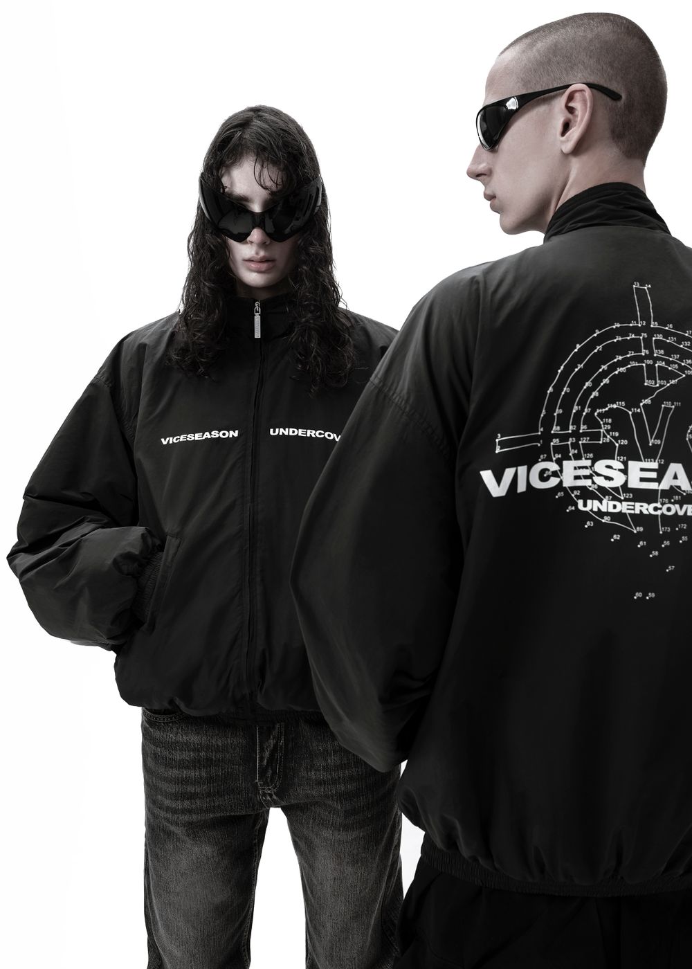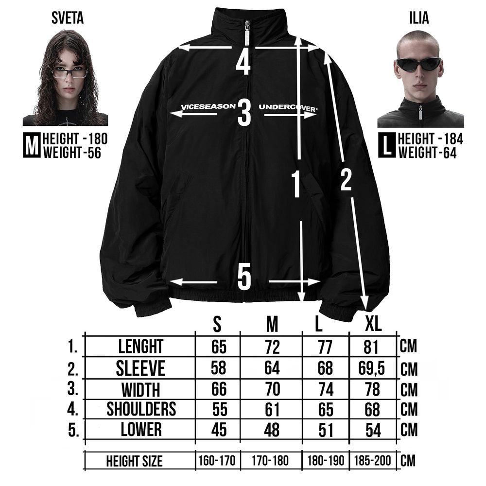 Voluminous oversized cut with dropped shoulders. The jacket can be reversed and worn on both sides. High stand-up collar. Convenient side external zip pockets and 2 internal pockets.