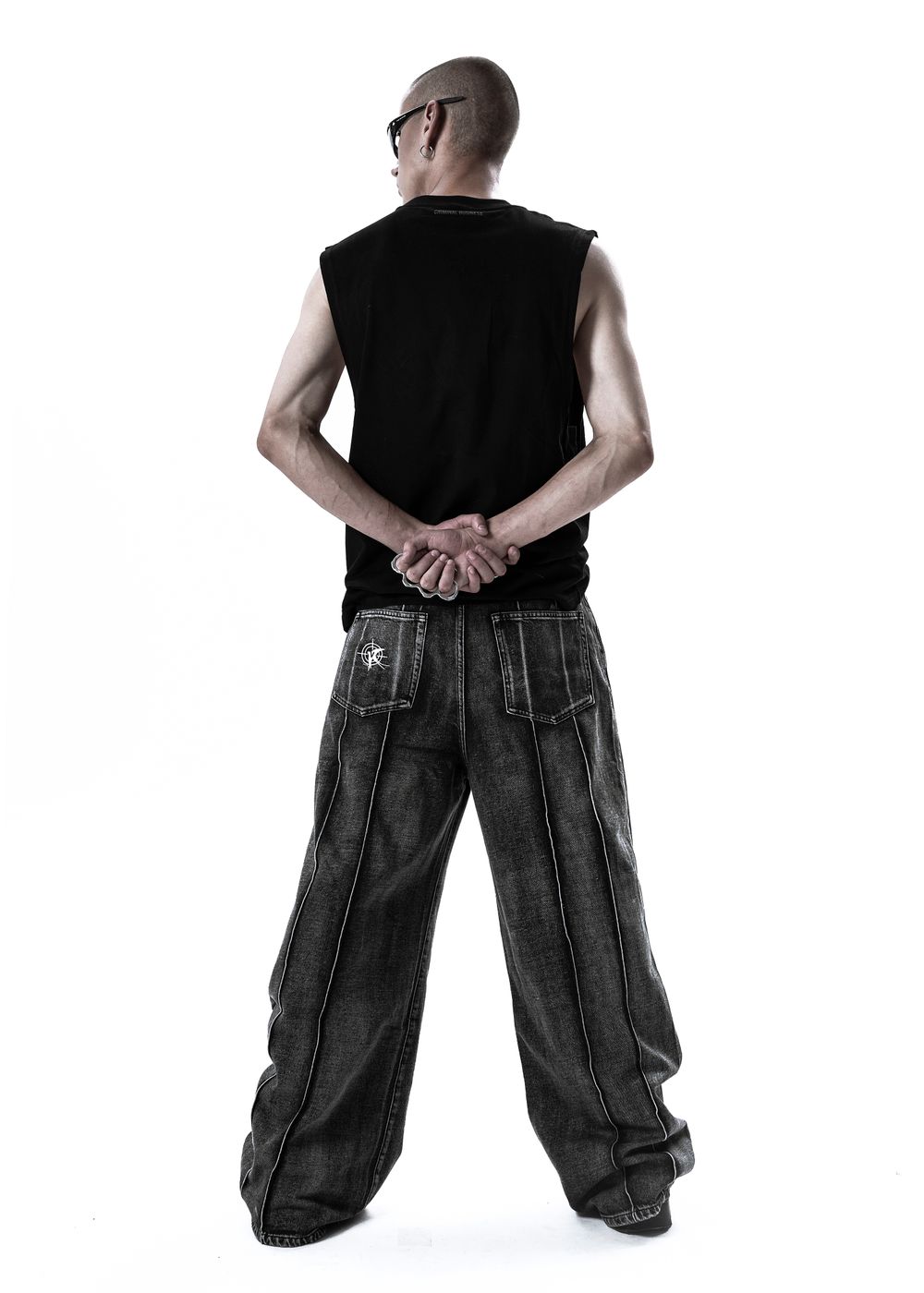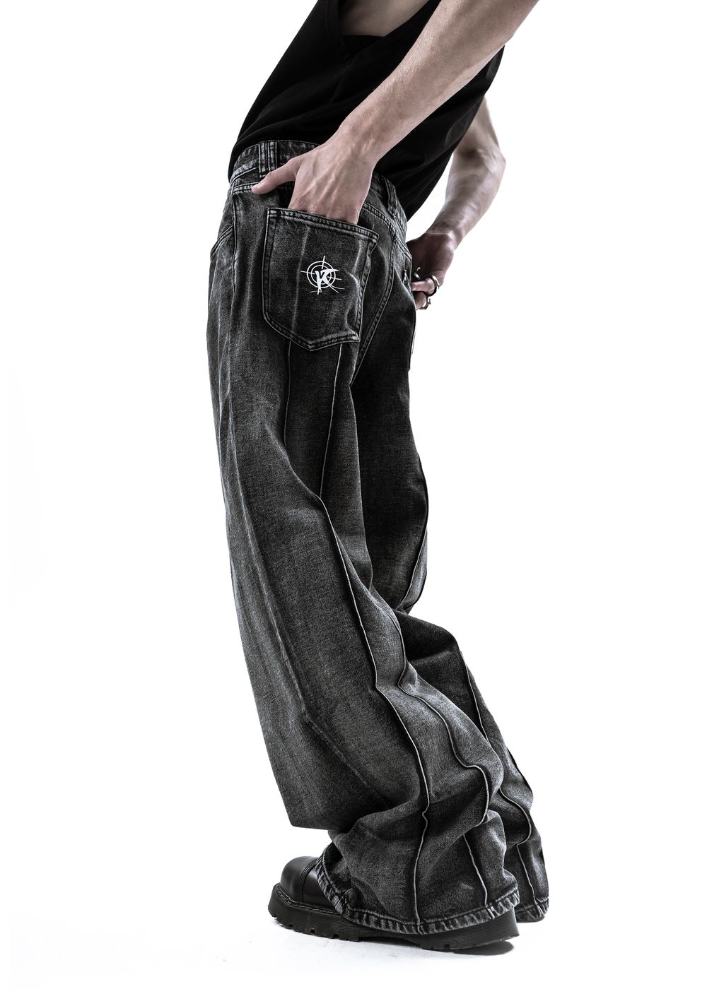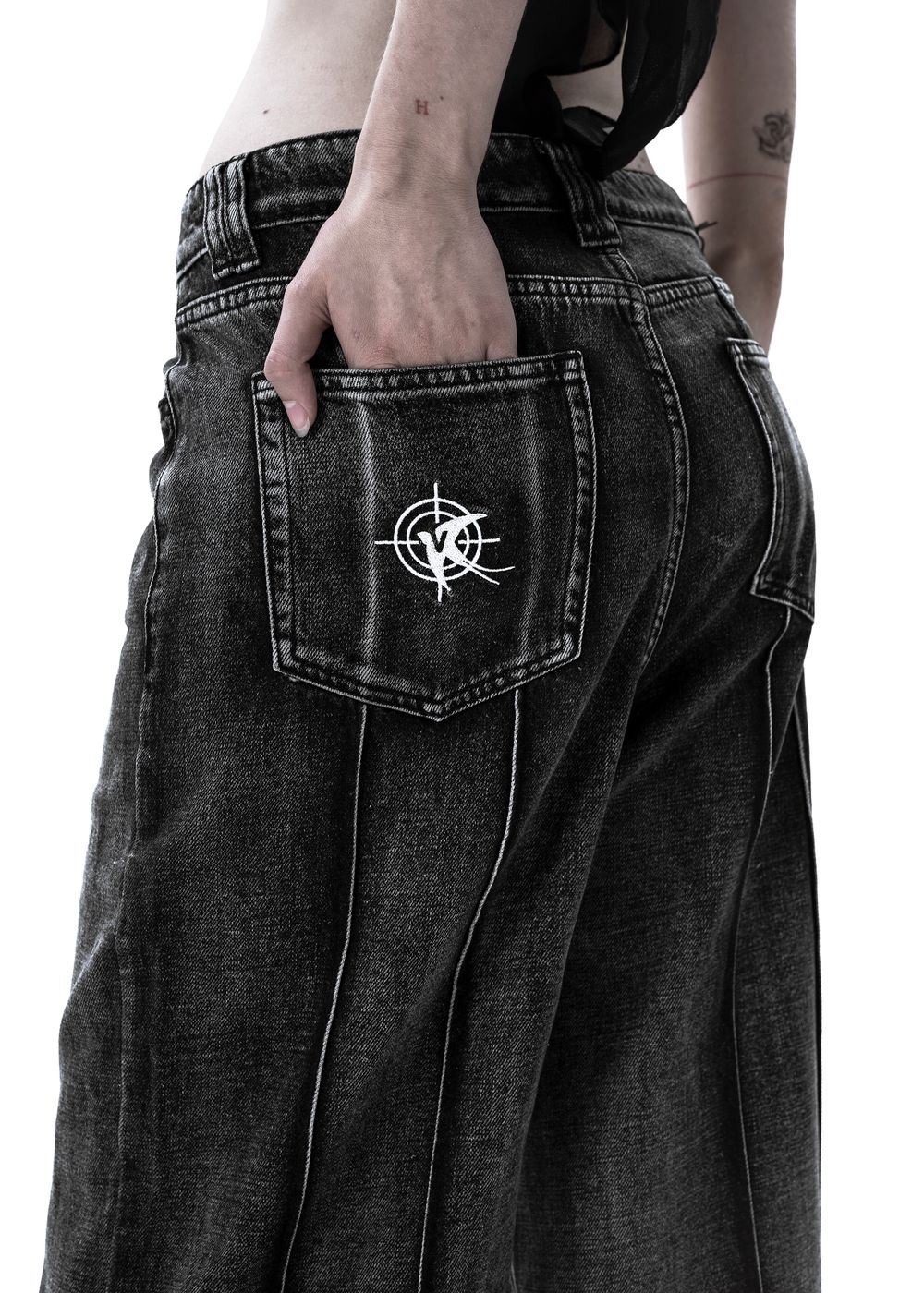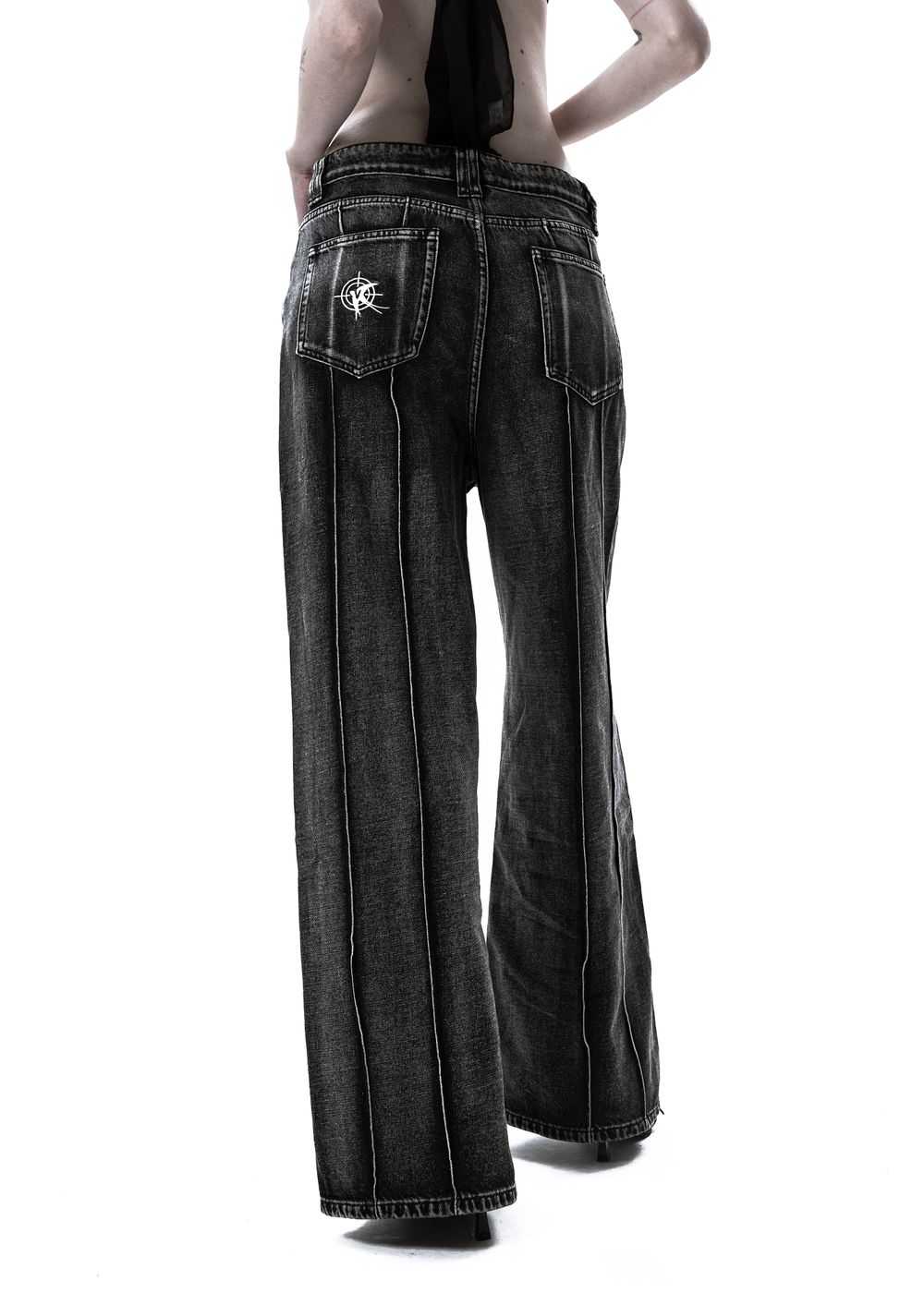 Embroidered logo on the back left pocket. Contrasting bleached seams. 4 vertical accent seams along the length of the jeans on the back side.
