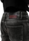 Straight skinny fit. The shape enhances the silhouette and elongates the legs. Thin decorative logo embroidery on the back pocket. Branded iron button with engraved logo. Metal branded rivets built into the seams of the pockets. Leather faded jacron with a burgundy accent on the waistband.