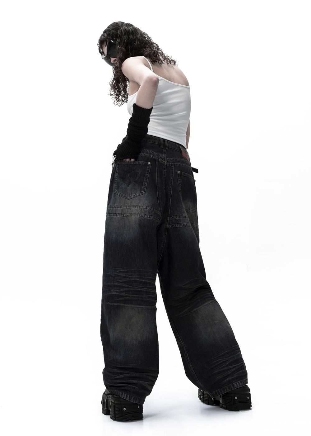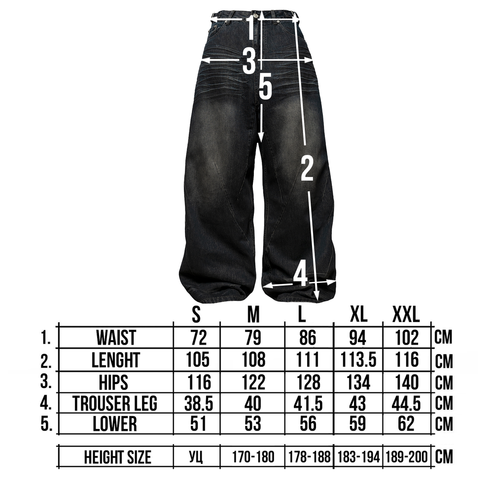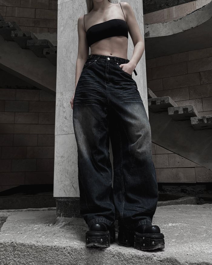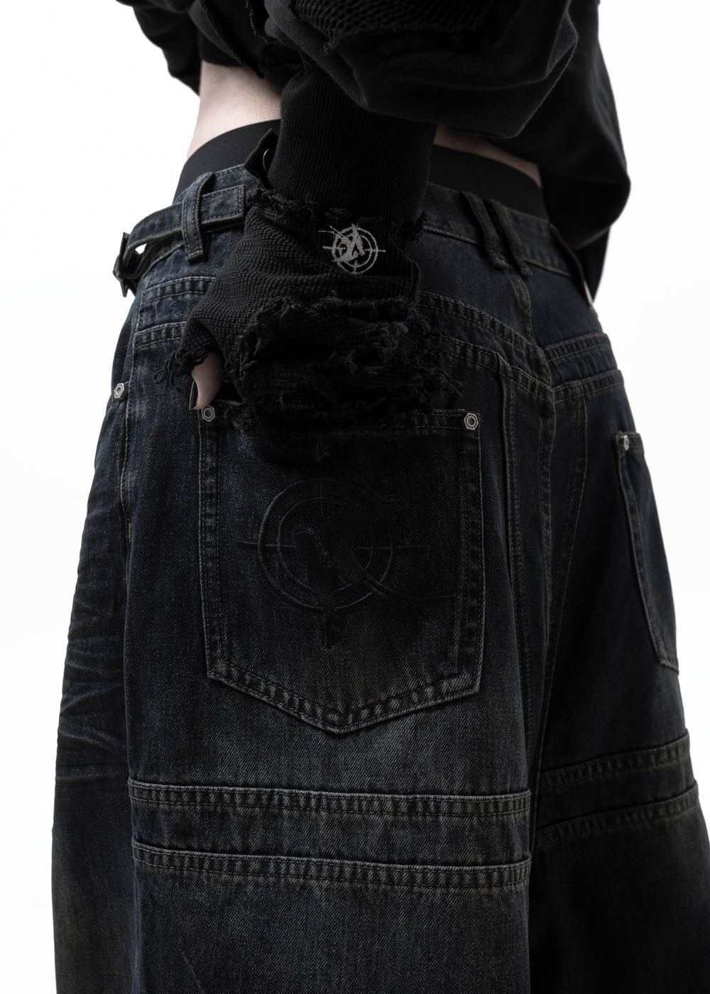 Oversized baggy fit. The jeans feature several decorative geometric seams on the lower front part and more pronounced, raised seams on the back. Adjustable waist. Large logo embroidery on the back pocket.