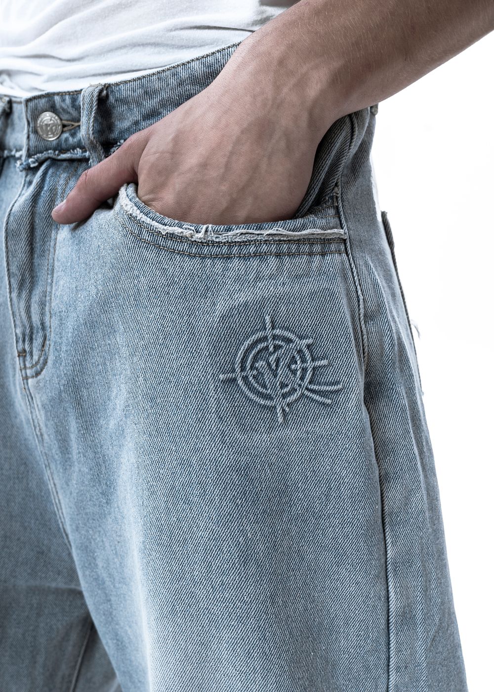 External embossing (stamp of a relief print on the surface) logo under the left front pocket. Embossing on denim is almost impossible to find, this detail very distinctive. It was made using special technology in specialized production abroad. Contrast fringed seams.