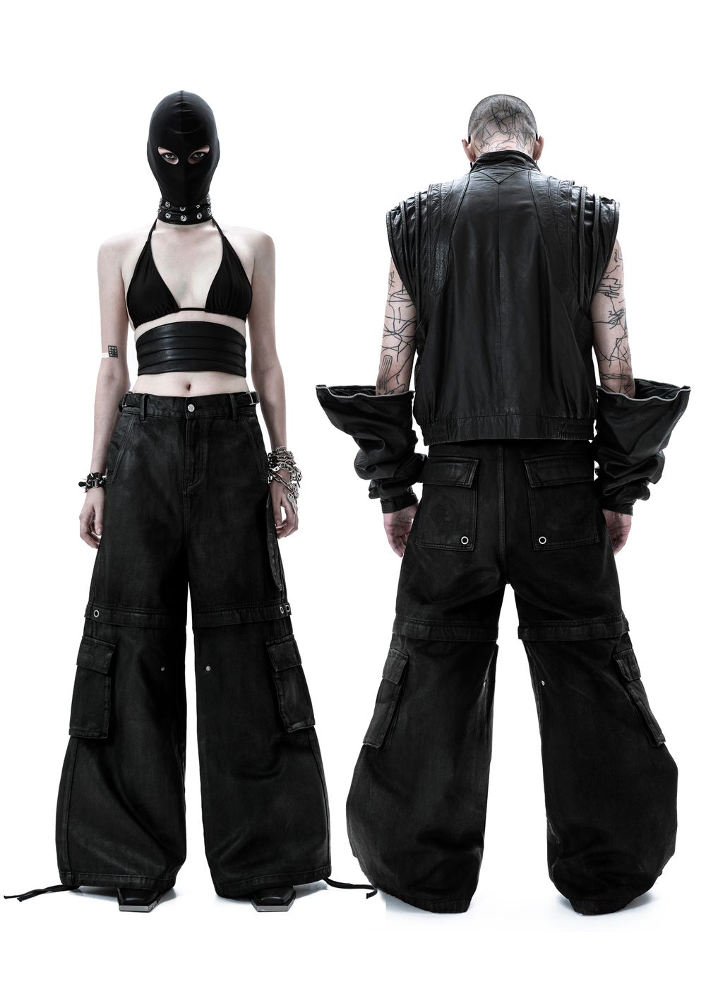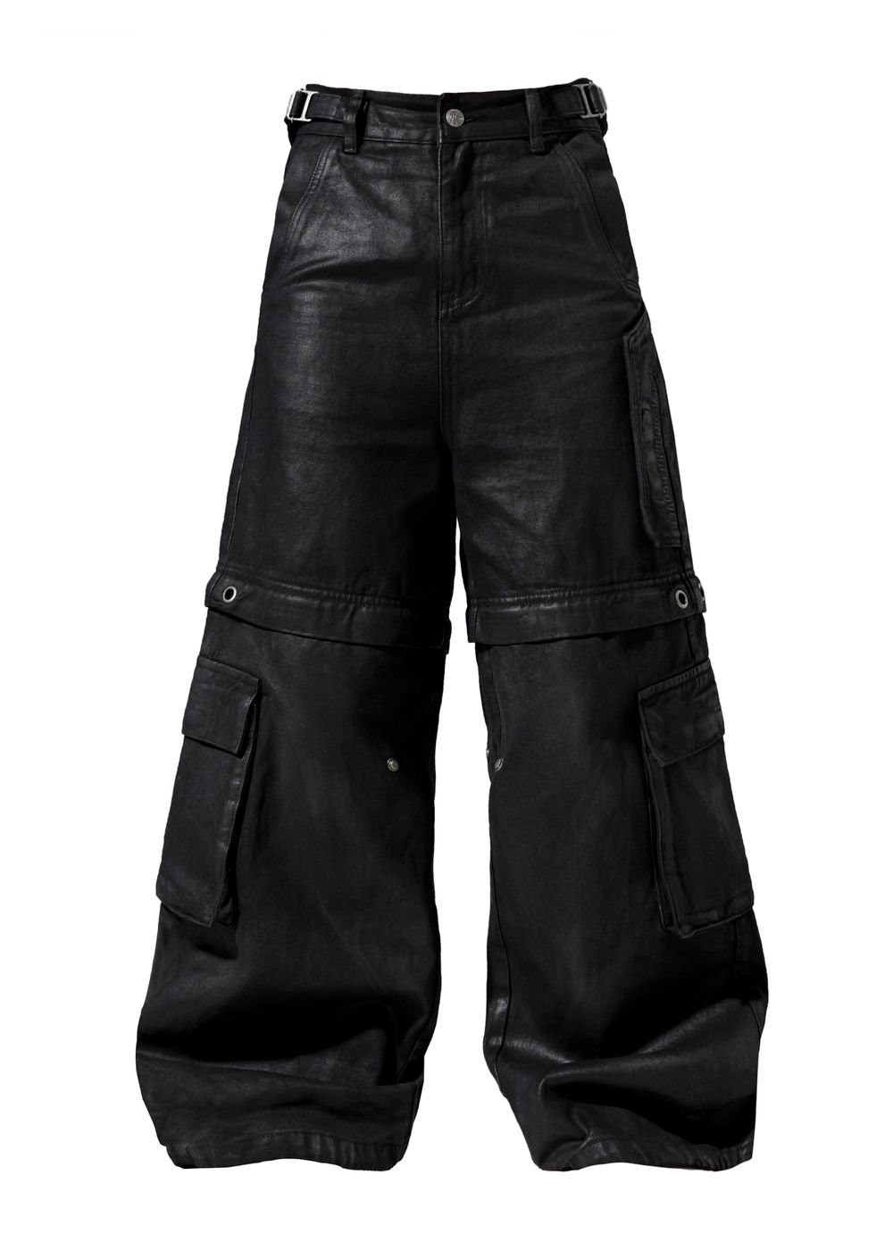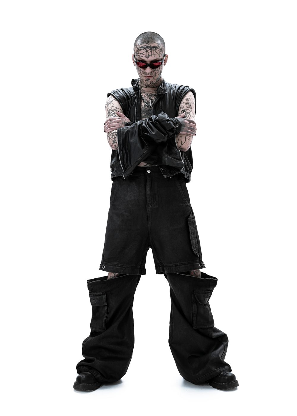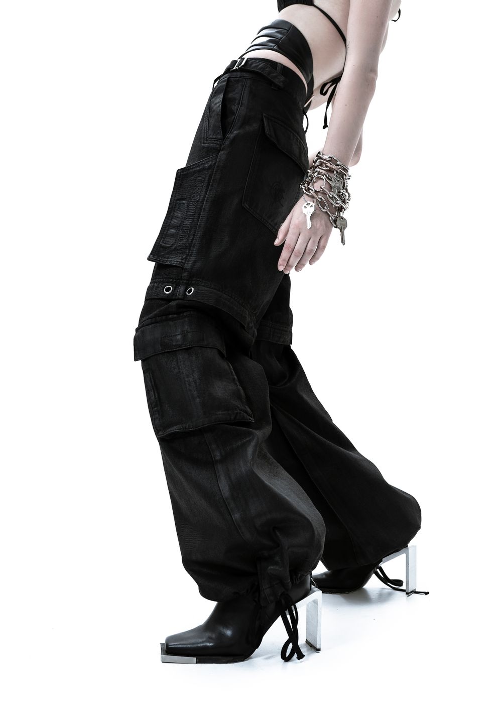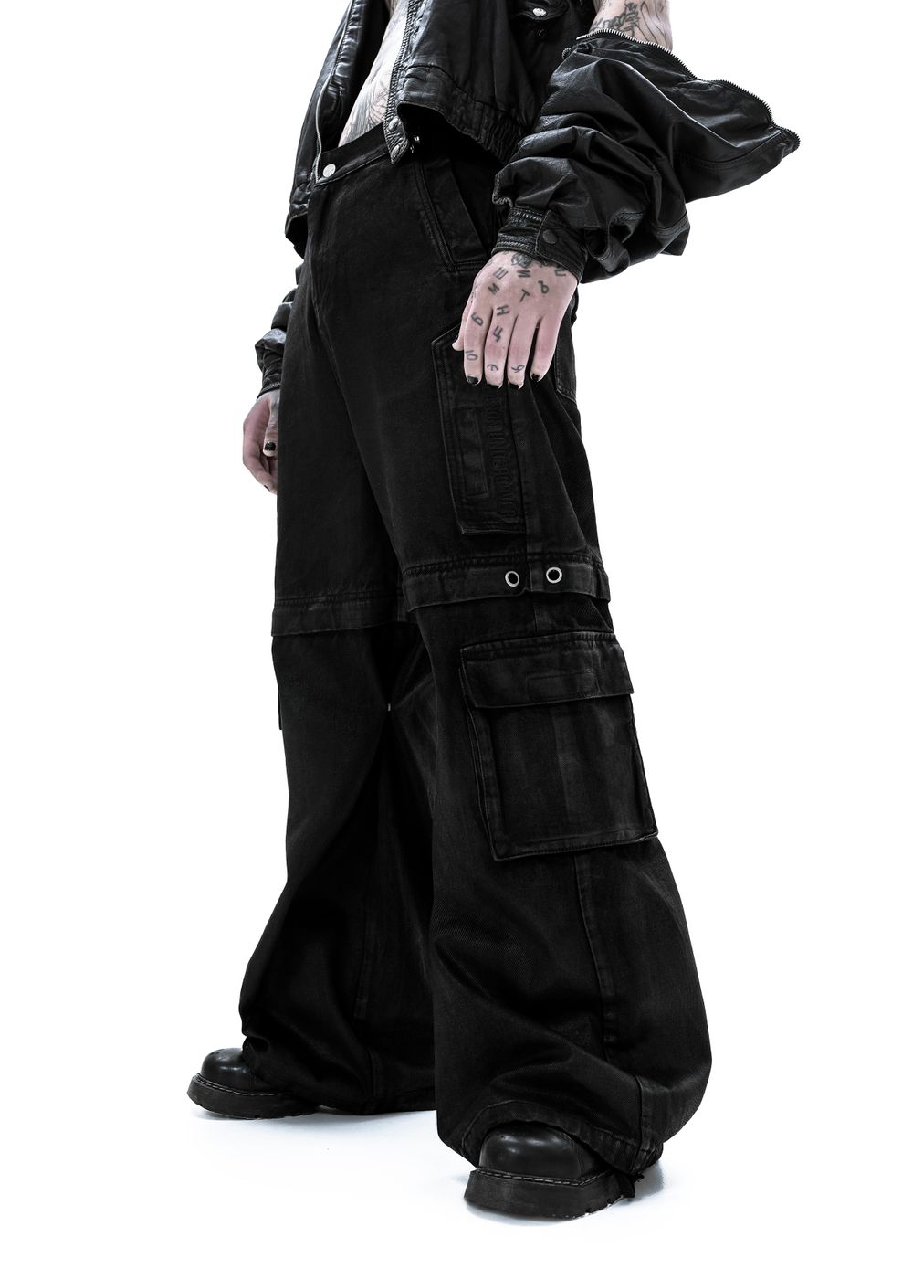 Elongated oversized cargo fit with adjustable waist. These jeans are transformable and offer 5 styling options: