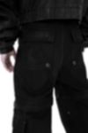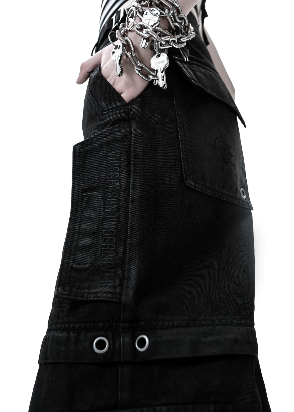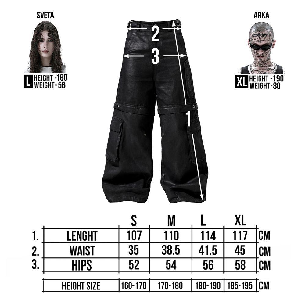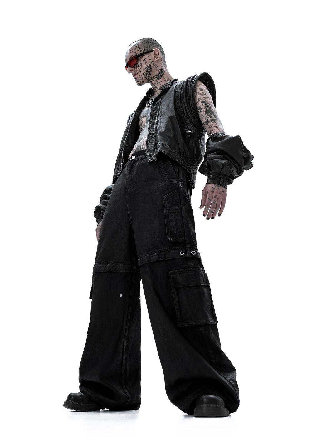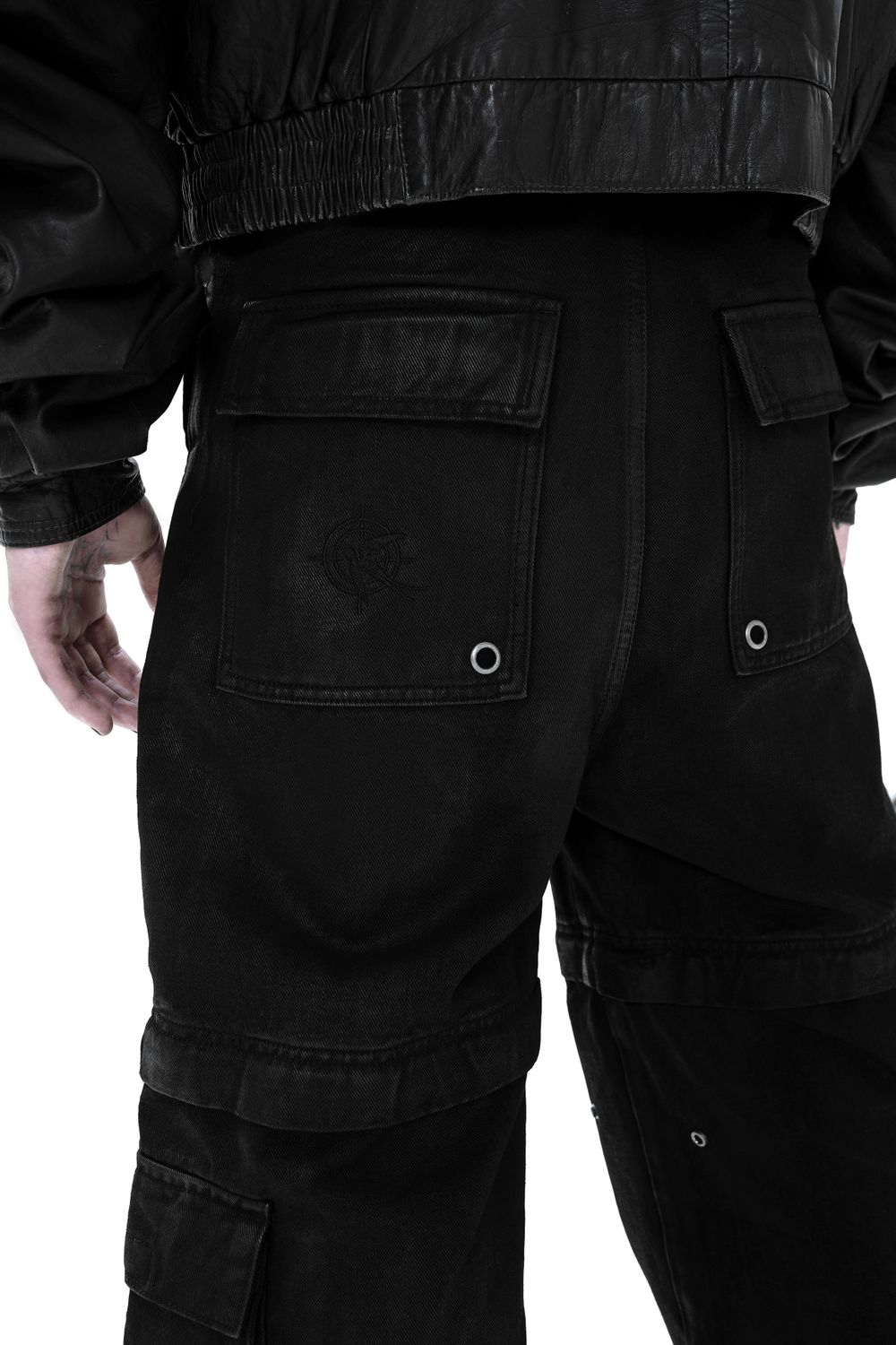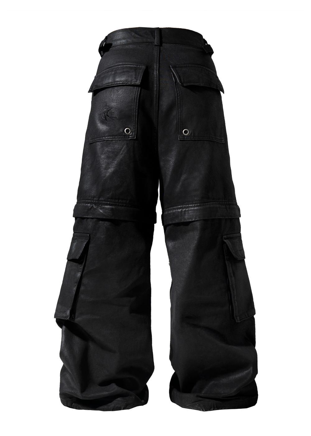 Elongated oversized cargo fit with adjustable waist. These jeans are transformable and offer 5 styling options: