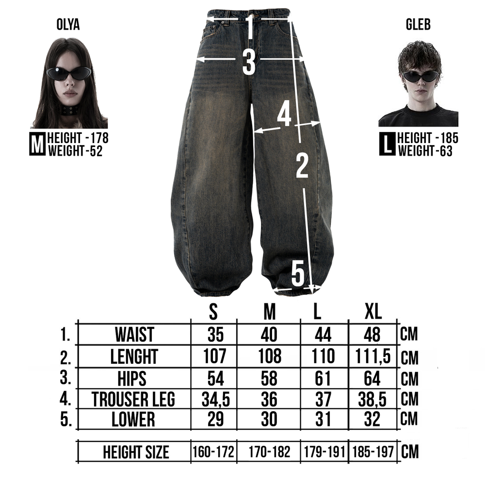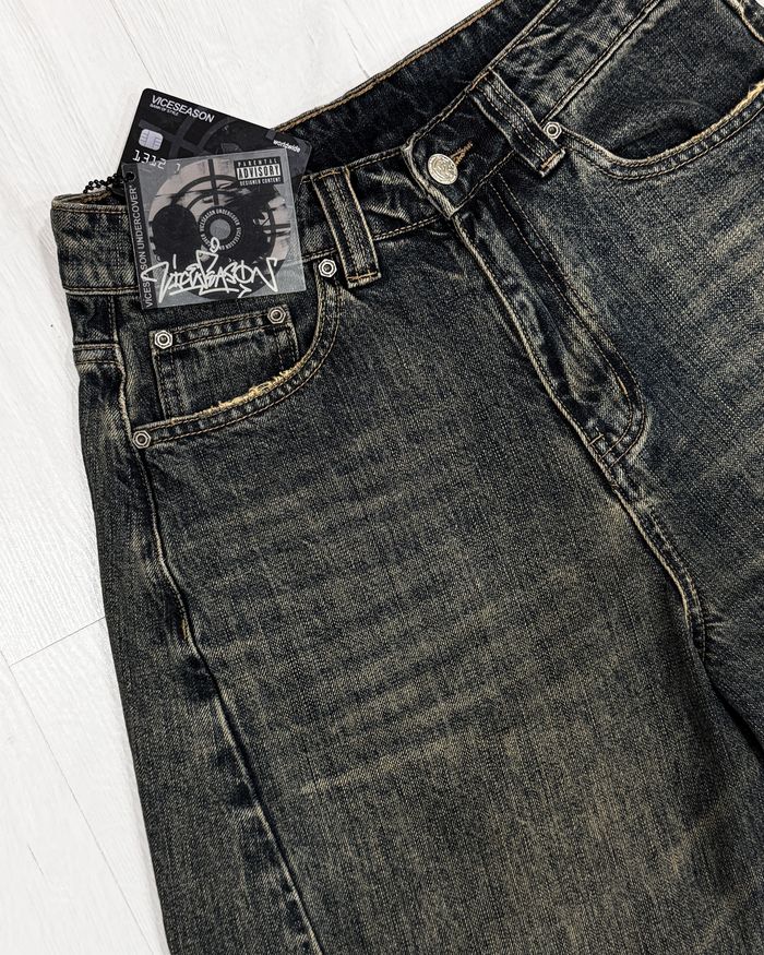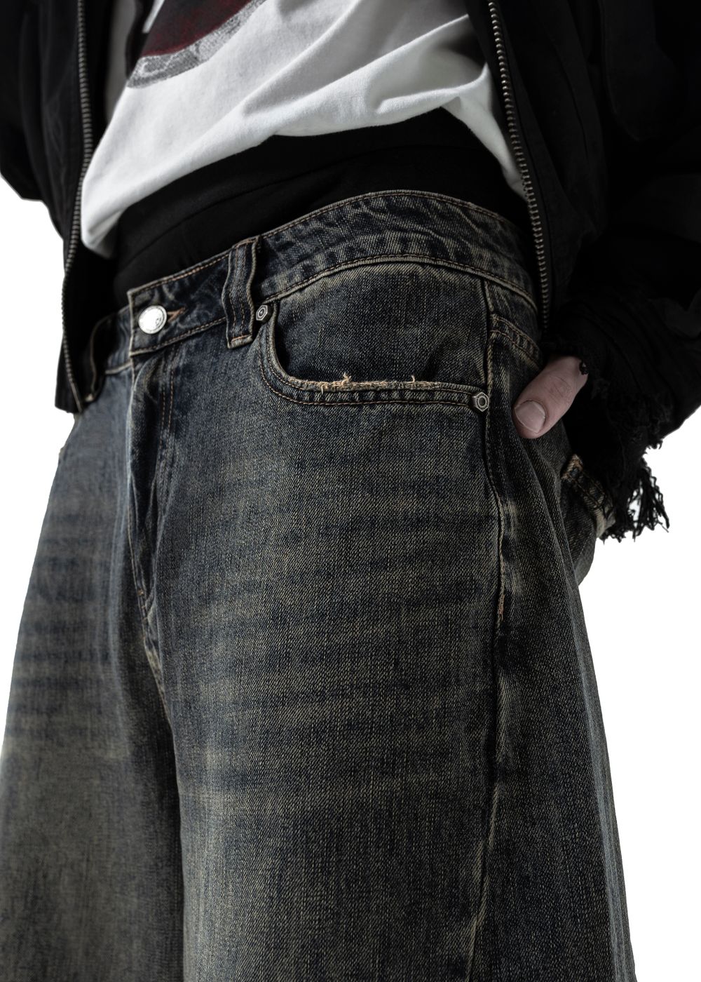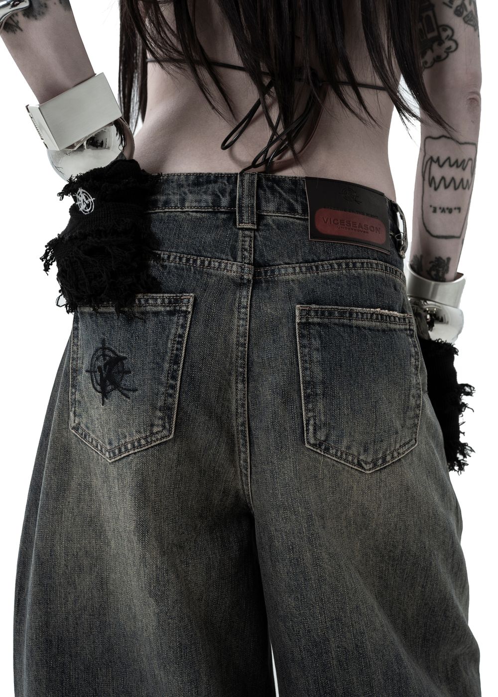 Oversized baggy fit with a tapered leg. Slanted side seams and thick geometric stitching on the back. Distressing on pockets and hem. Logo embroidery on the back pocket.