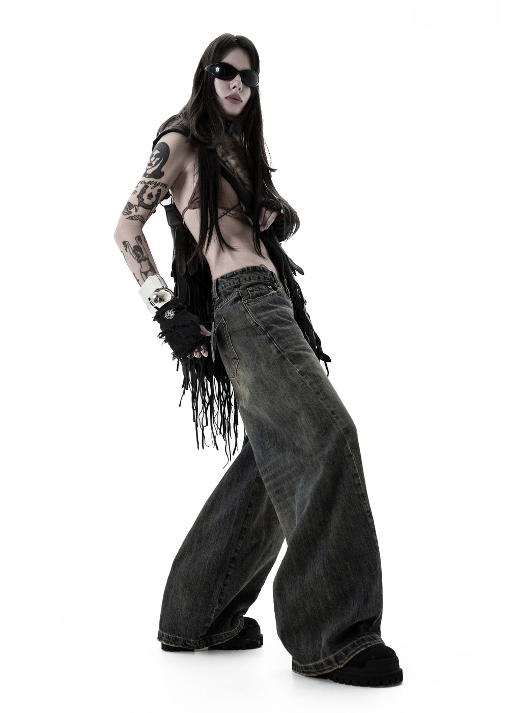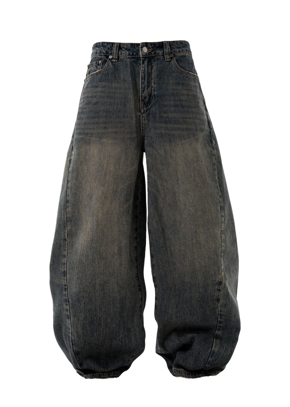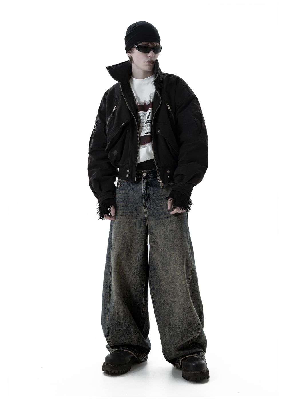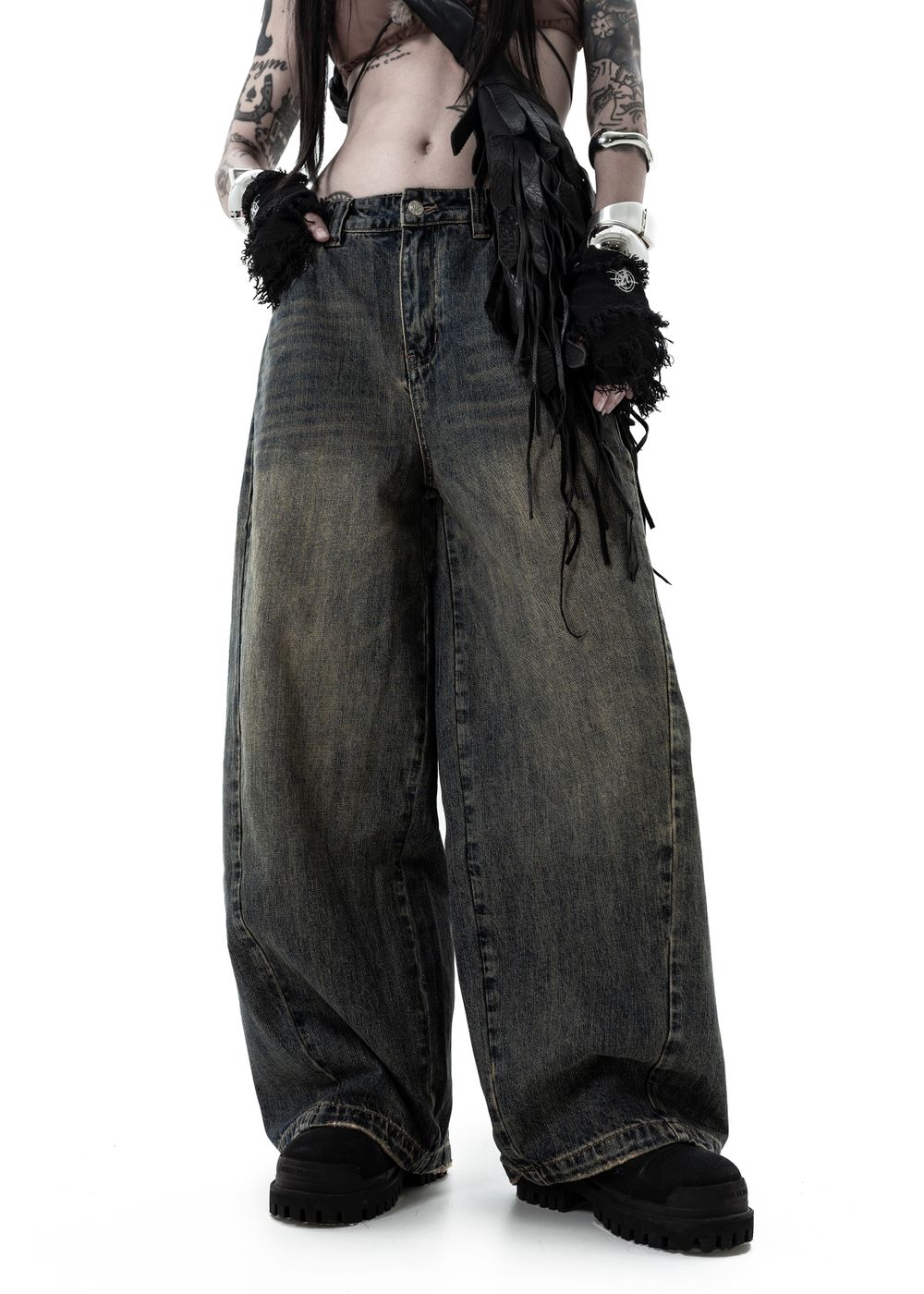 Oversized baggy fit with a tapered leg. Slanted side seams and thick geometric stitching on the back. Distressing on pockets and hem. Logo embroidery on the back pocket.