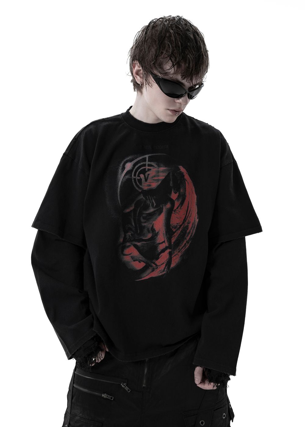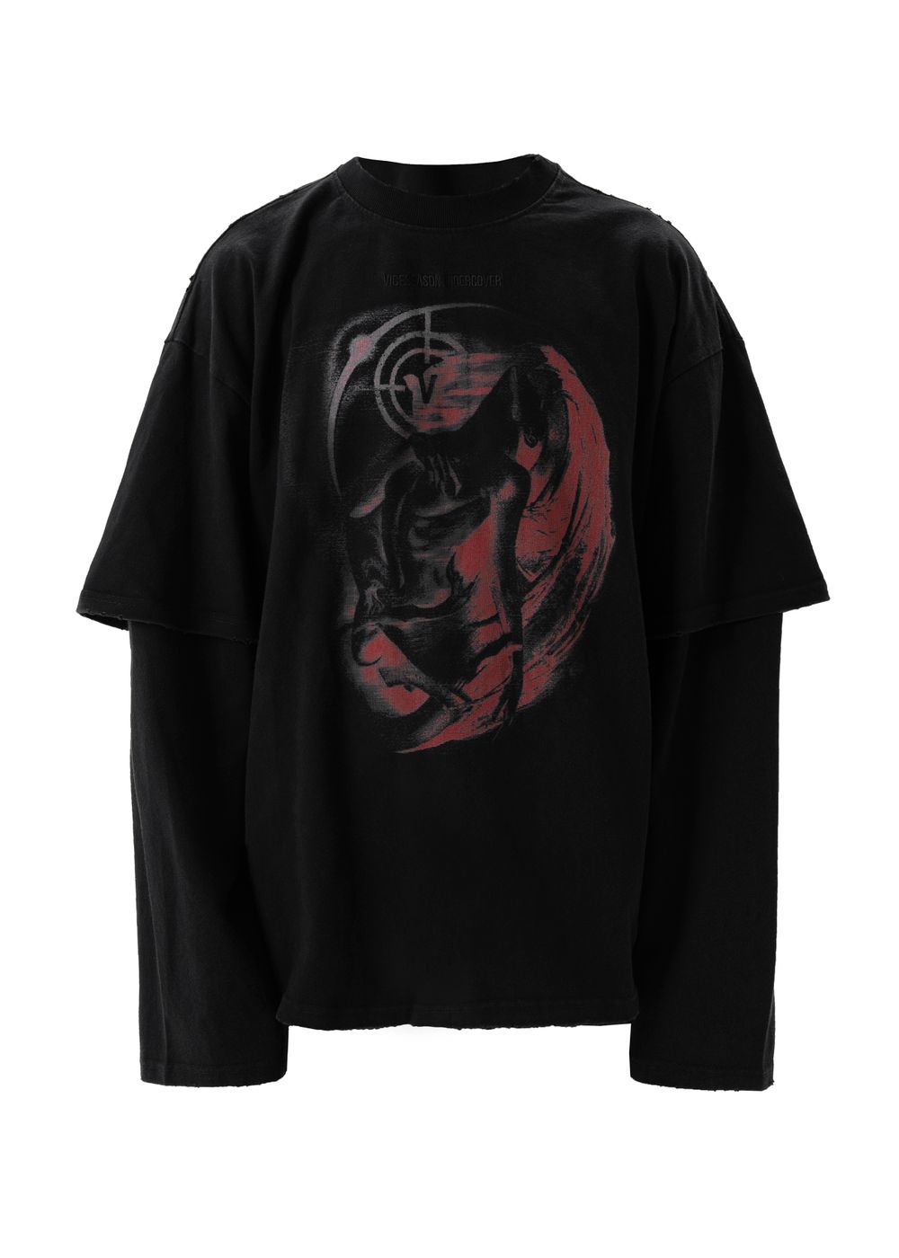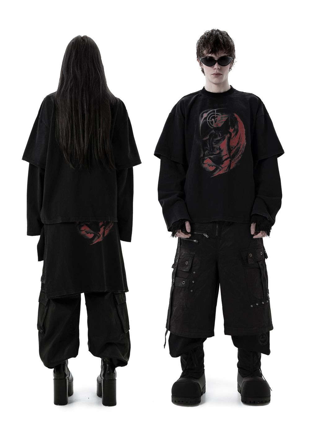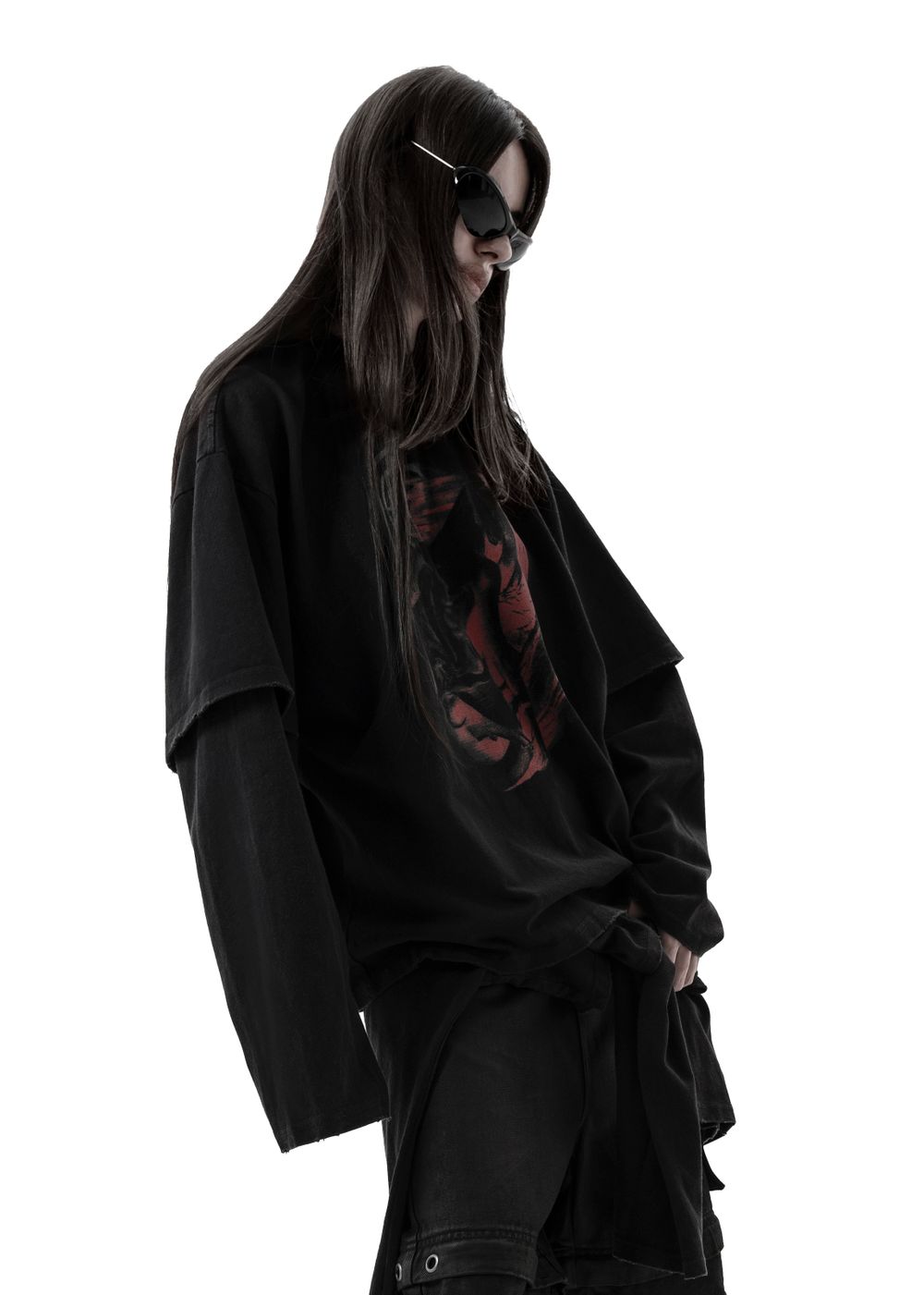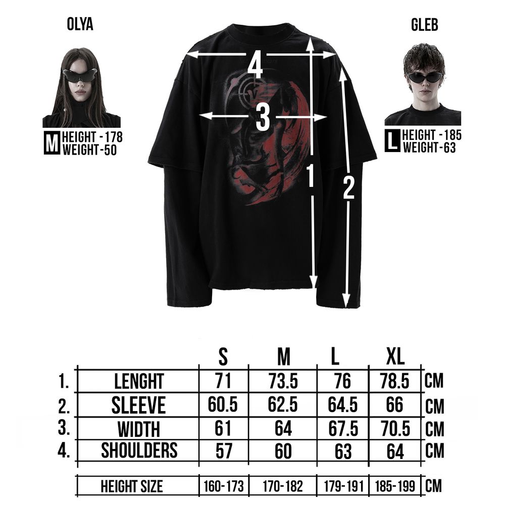 Loose straight oversized cut. Voluminous double sleeves. Seams and edges are distressed for a raw, undone look. The print is made with durable digital printing in muted dark tones matching the collection’s aesthetic. Branding embroidery is stitched above the print. All sizes are intentionally oversized — we recommend choosing your usual size.