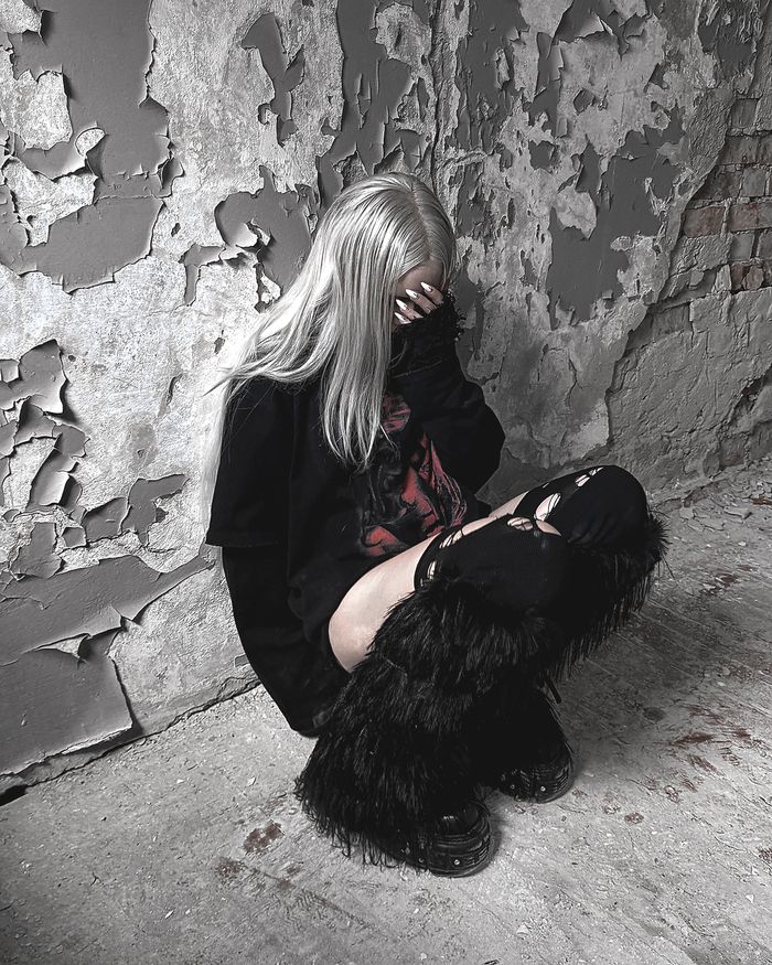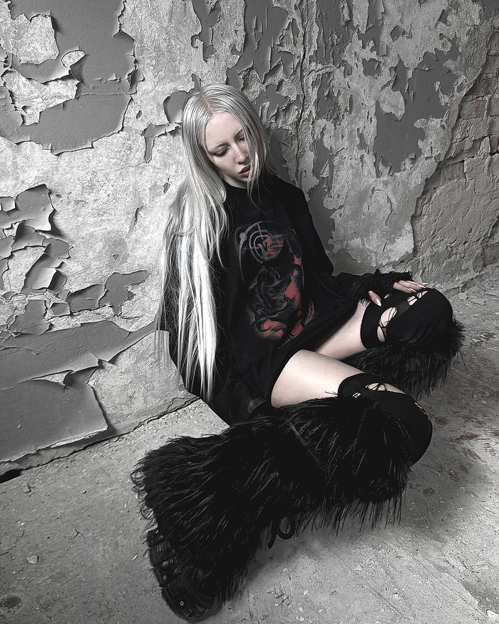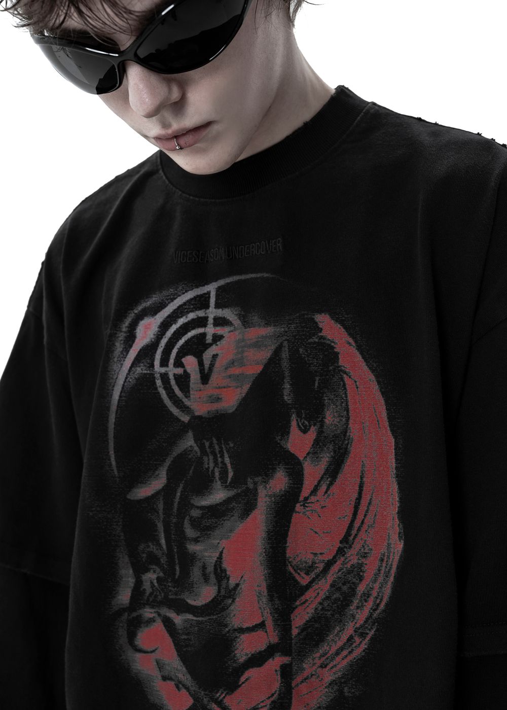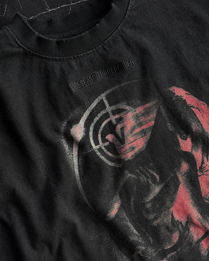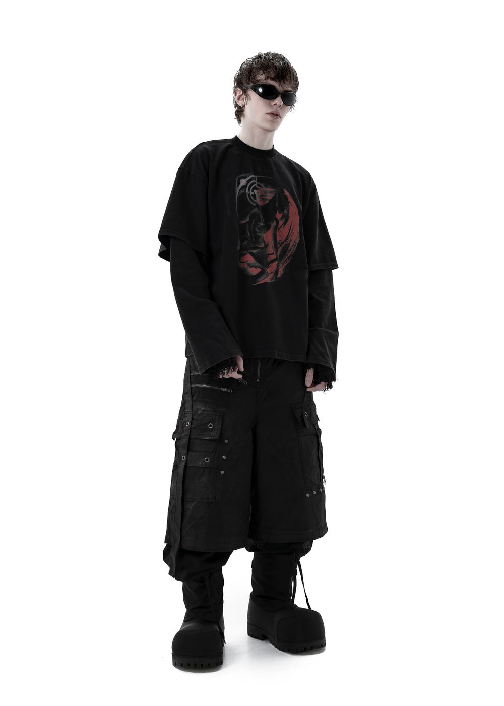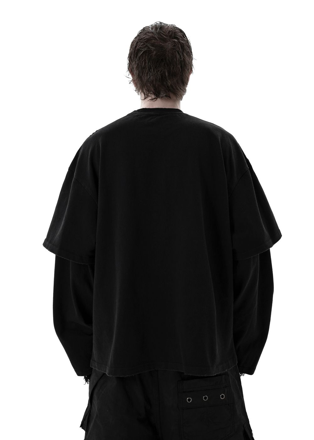 Loose straight oversized cut. Voluminous double sleeves. Seams and edges are distressed for a raw, undone look. The print is made with durable digital printing in muted dark tones matching the collection’s aesthetic. Branding embroidery is stitched above the print. All sizes are intentionally oversized — we recommend choosing your usual size.