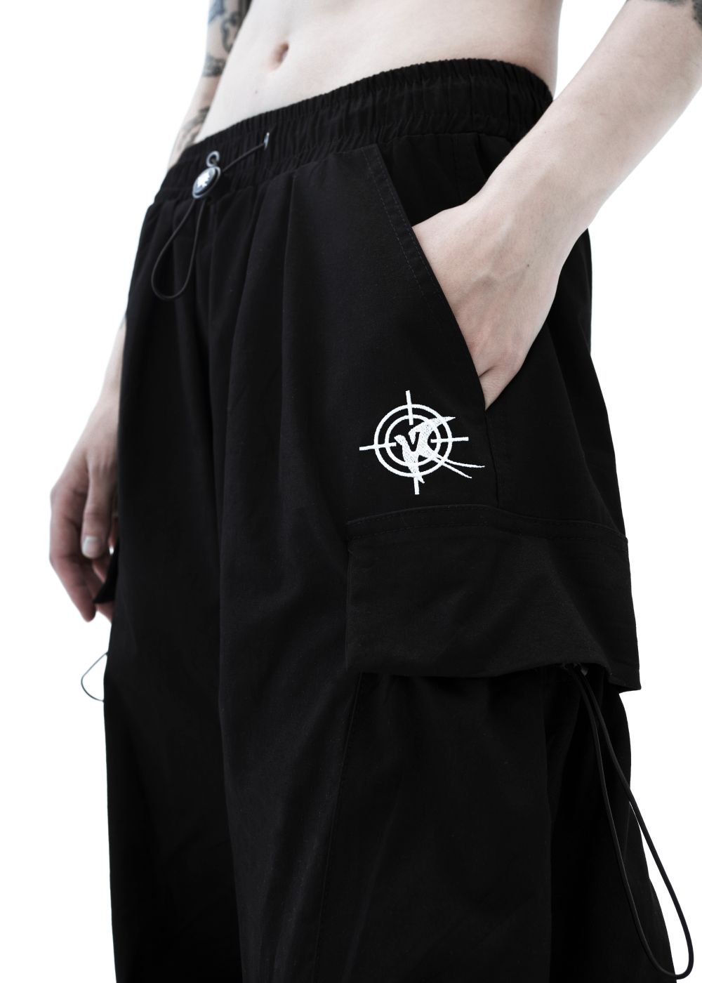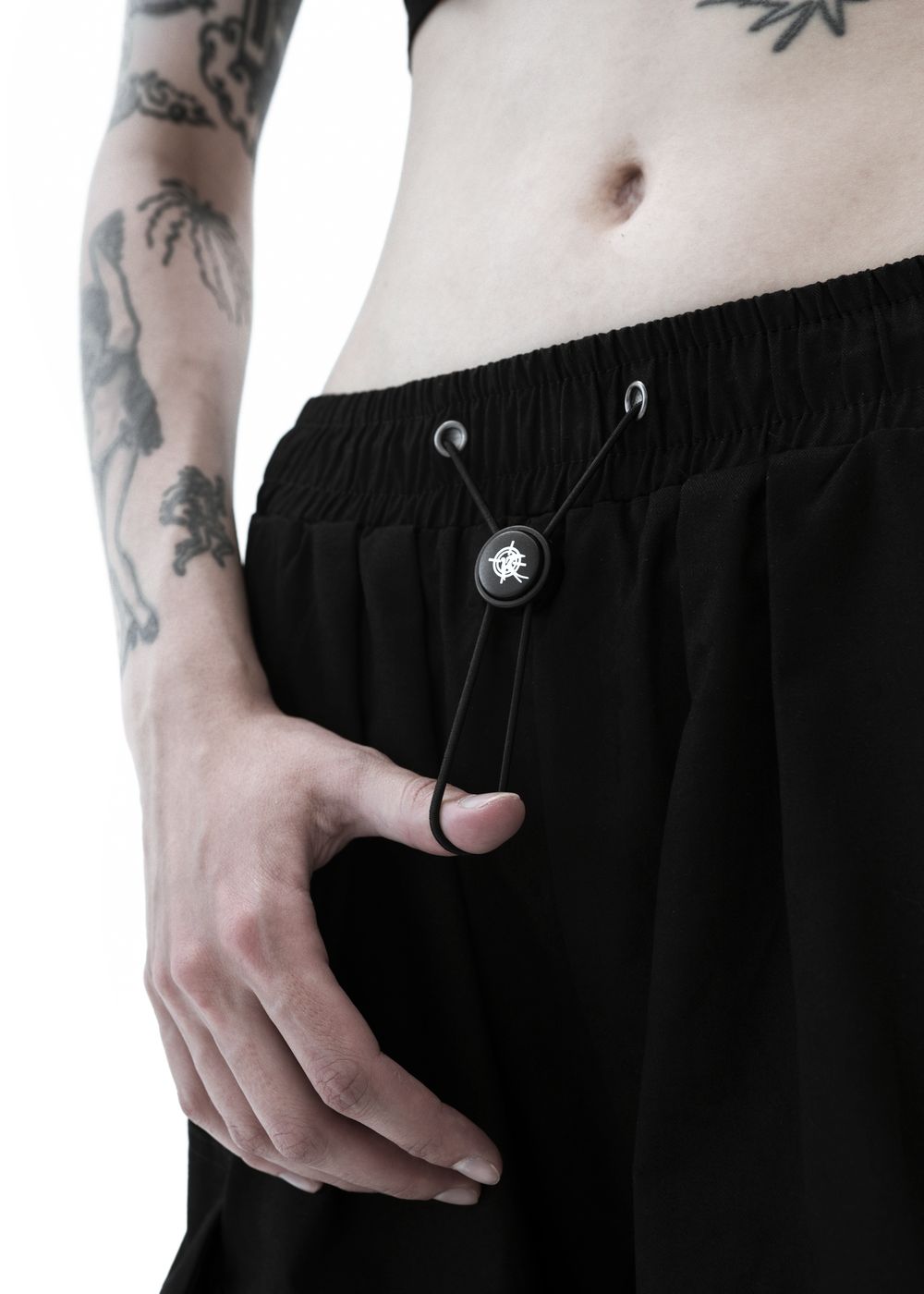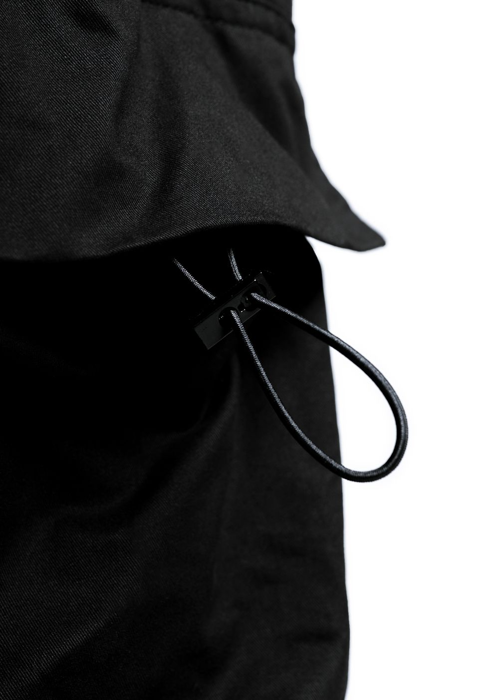 Two side pockets with press studs and an elastic band with a fasteners to change the shape of the pocket. Elasticated waist with branded fastener. Embroidered logo above the left side pocket. Two front deep pockets and drawstring elastic at the bottom of the trousers for shape change.
