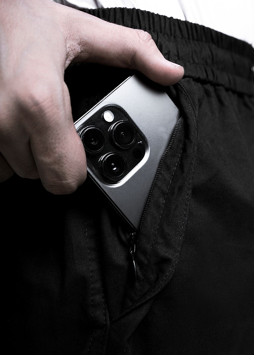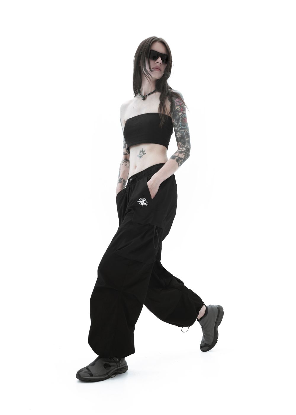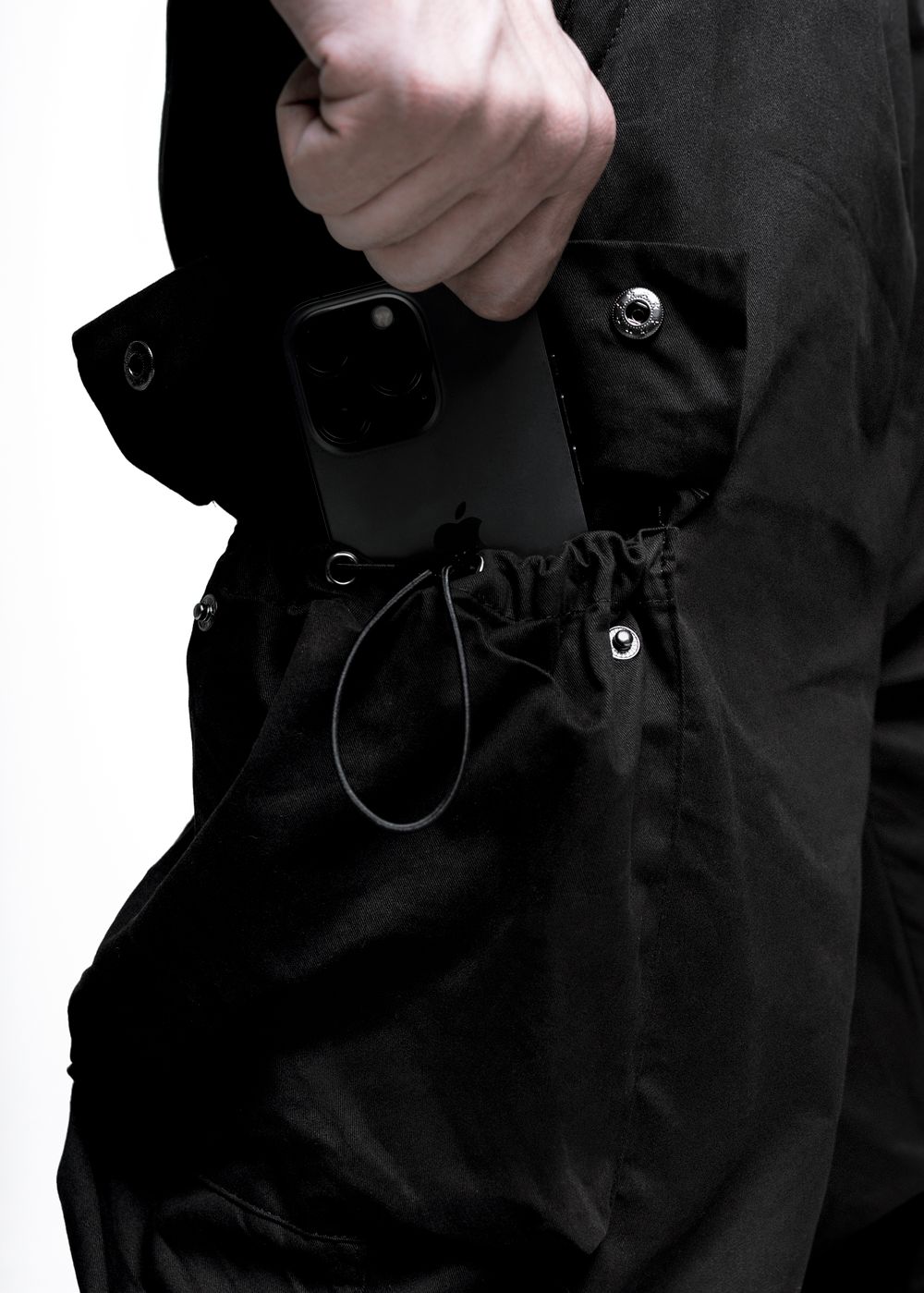 Two side pockets with press studs and an elastic band with a fasteners to change the shape of the pocket. Elasticated waist with branded fastener. Embroidered logo above the left side pocket. Two front deep pockets and drawstring elastic at the bottom of the trousers for shape change.