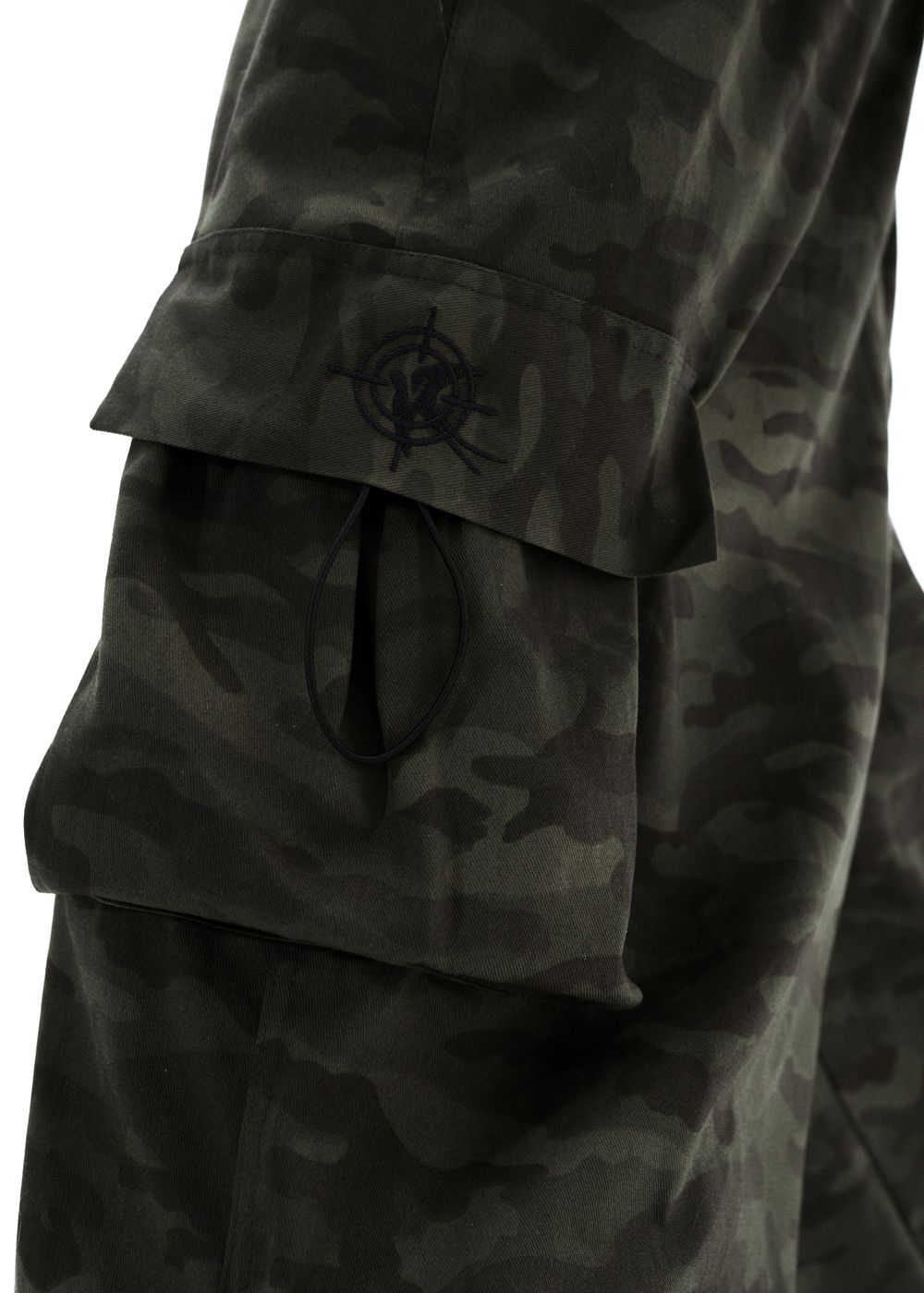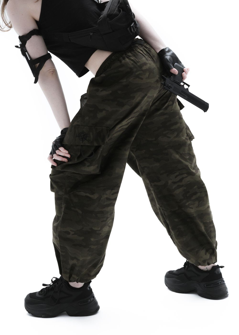 Two side pockets with press studs and an elastic band with a fasteners to change the shape of the pocket. Elasticated waist with branded fastener. Embroidered logo above the left side pocket. Two front deep pockets and drawstring elastic at the bottom of the trousers for shape change.