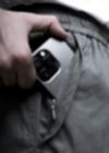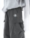 Two side pockets with press studs and an elastic band with a fasteners to change the shape of the pocket. Elasticated waist with branded fastener. Embroidered logo above the left side pocket. Two front deep pockets and drawstring elastic at the bottom of the trousers for shape change.