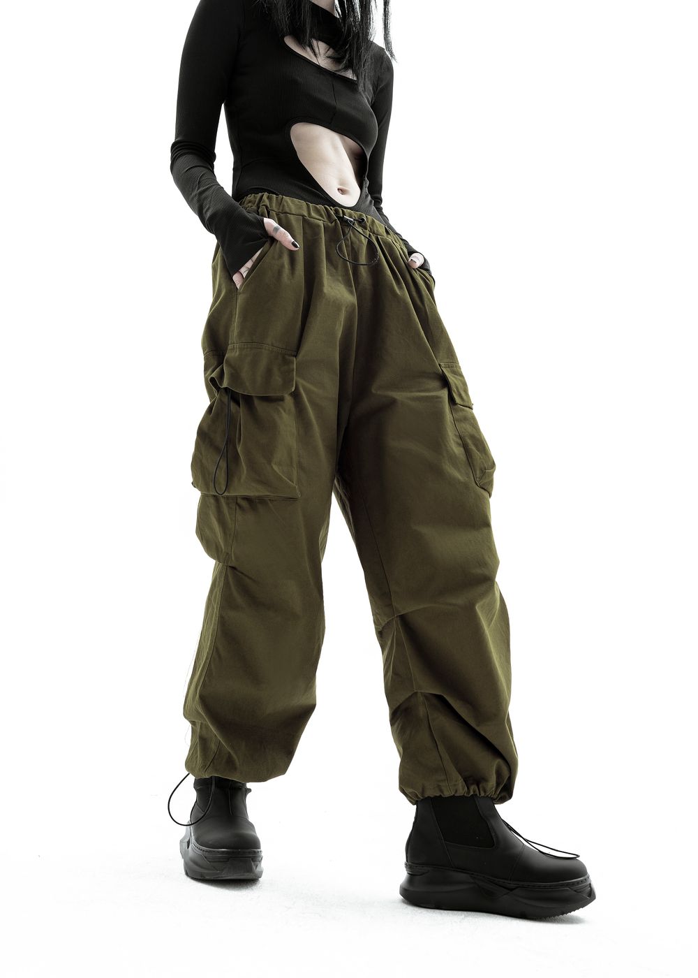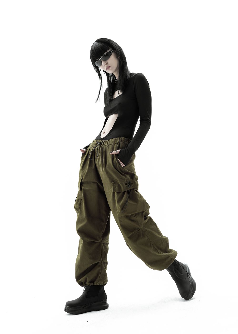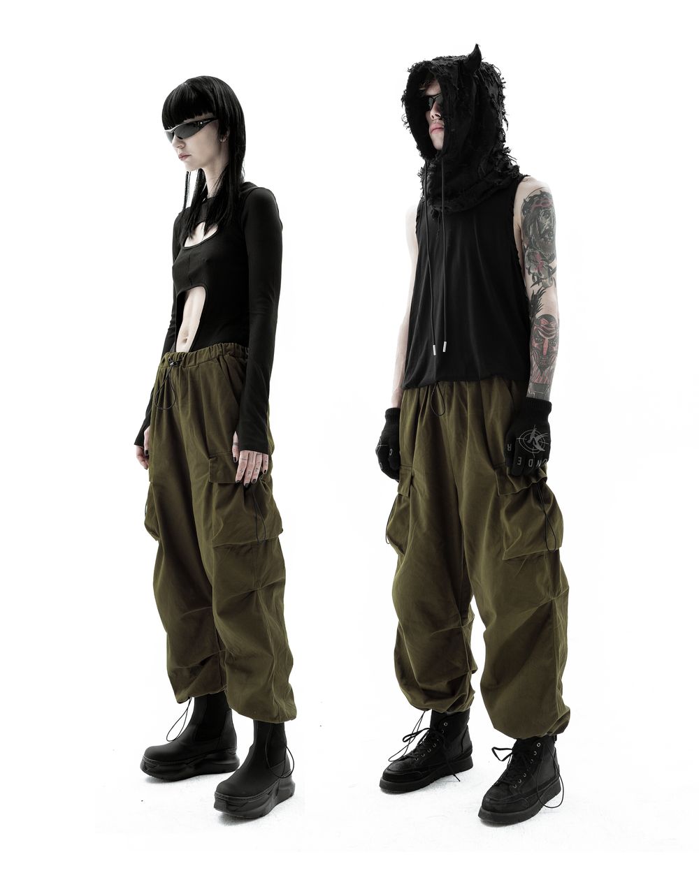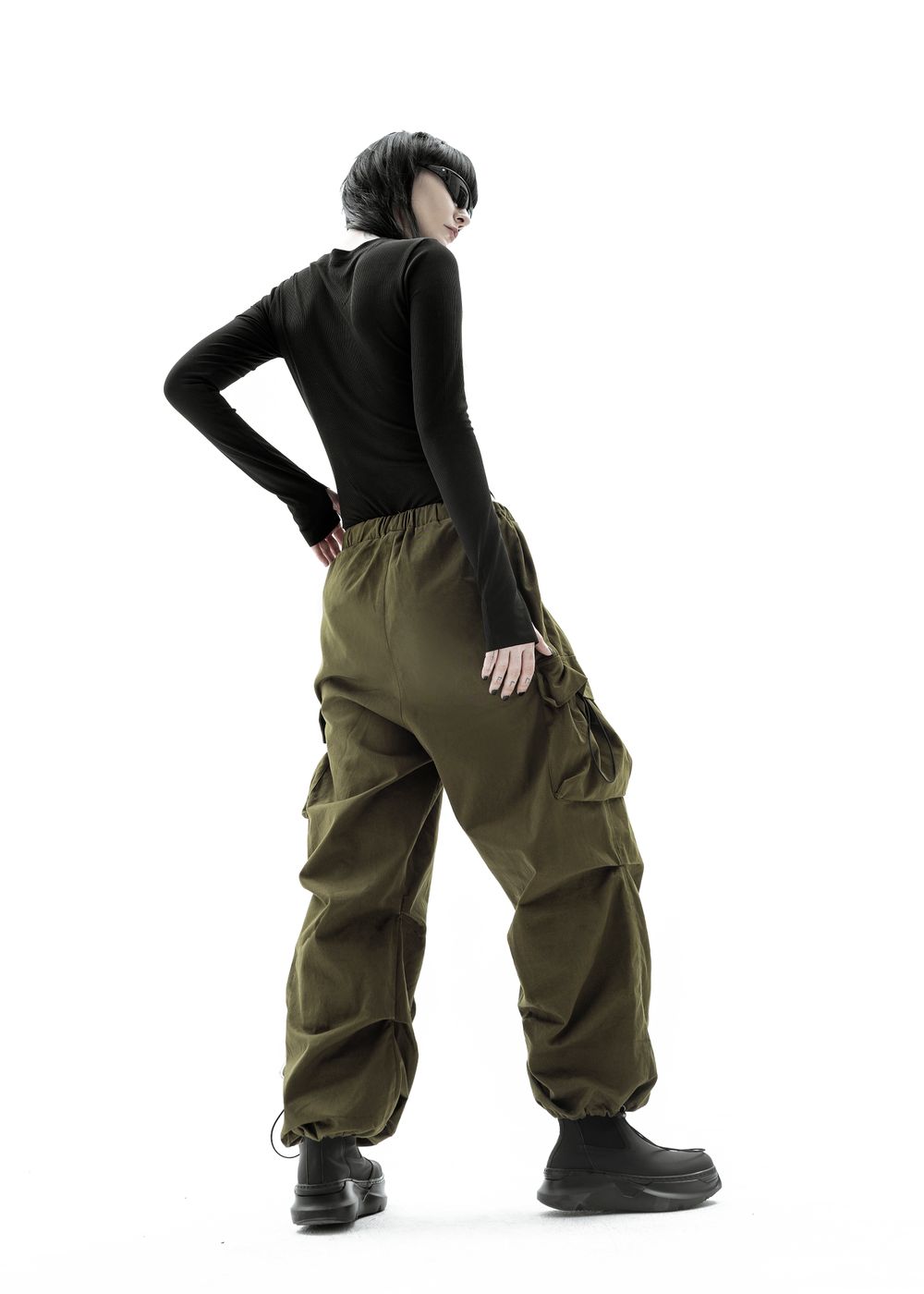 Elastics and fasteners allow pants to take on many different shapes: they can be wide and straight or tightened to create a more difficult shape. Elastic bands on the pockets also contribute to the change of shape. Trousers go well with oversized hoodies and jackets, t-shirts and tops.