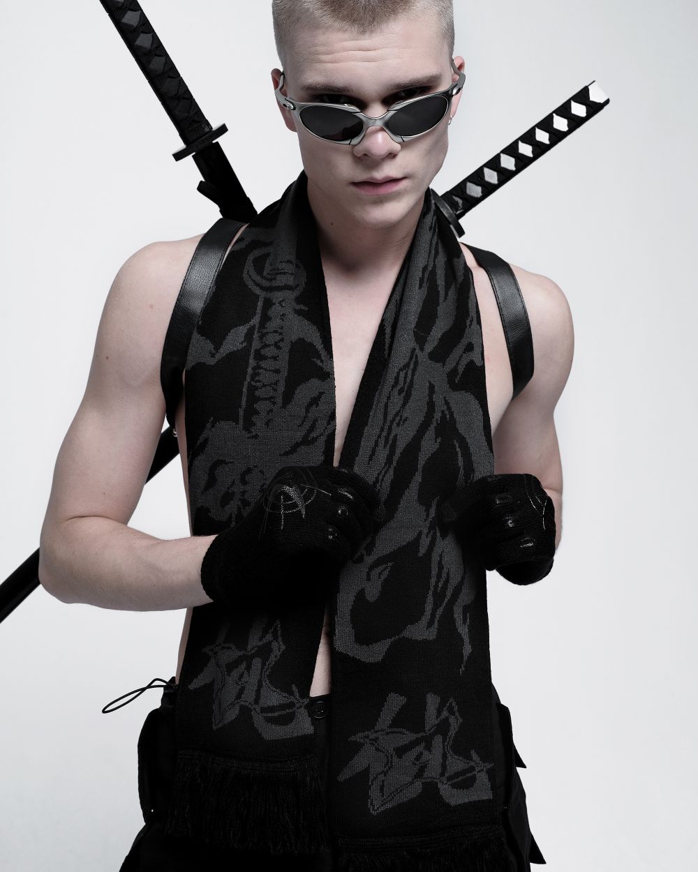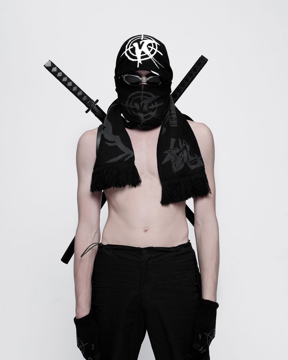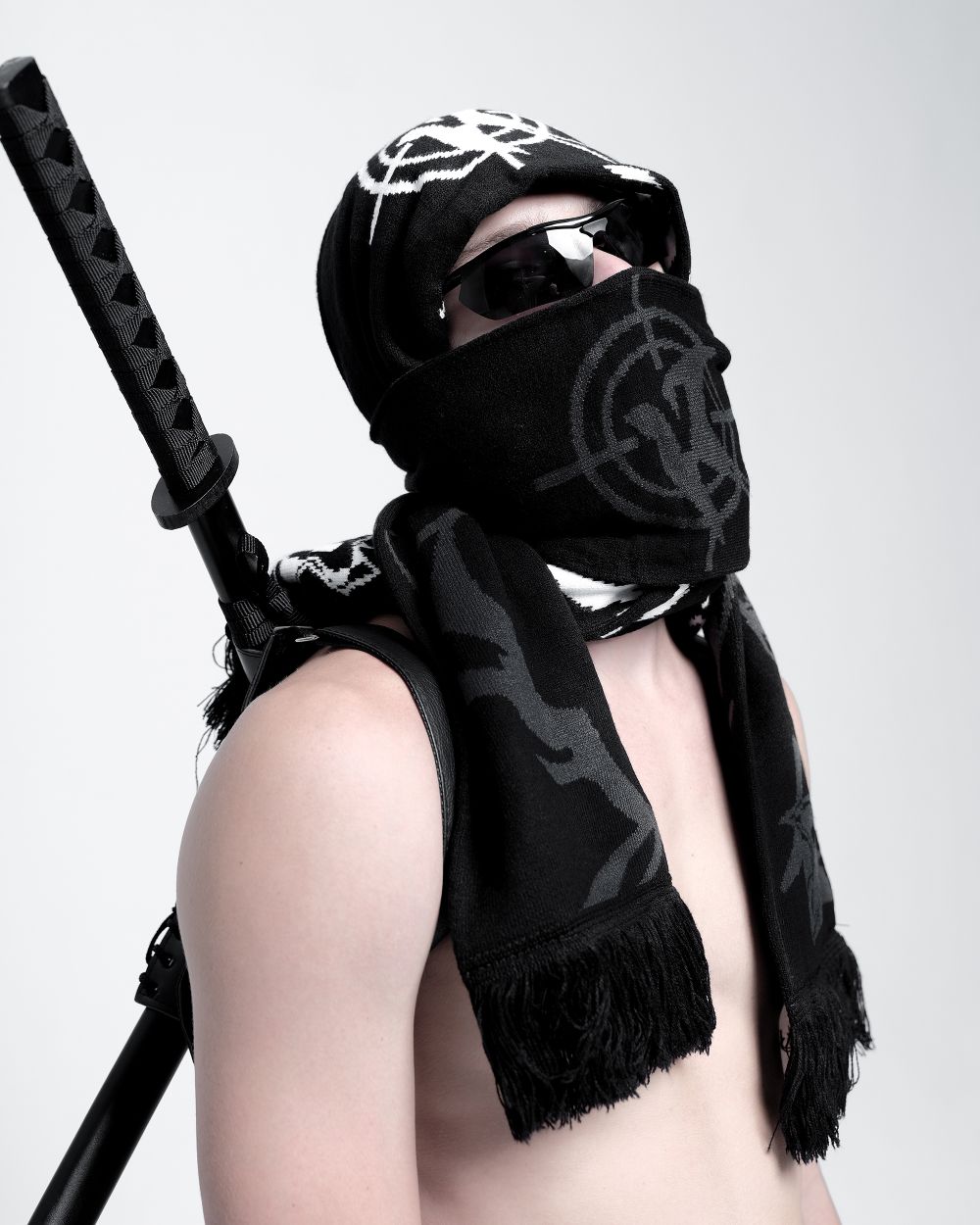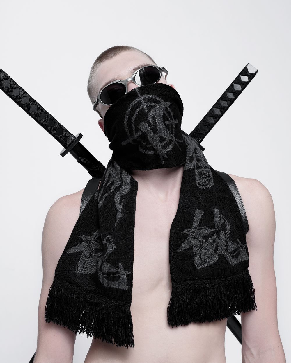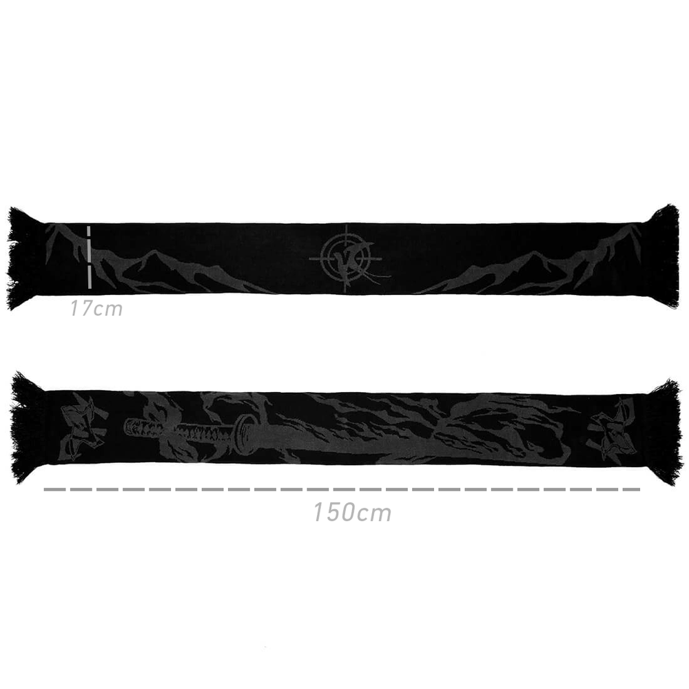 The double-sided scarf is made of both soft and elastic acrylic. Incredibly convenient to use and pleasantly disposed to the skin. The design of one side of the scarf is inspired by the works of Chinese tattoo artists. The print of one of the sides was designed specifically for the VCSS brand by artist and underground tattoo artist from Shanghai No.Cain, who is popular in Asia for his daring works in a rebellious spirit. Artist's Instagram - https://www.instagram.com/no.cain /. The design conveys the spirit of a real samurai. The design of the second side is the VCSS logo and the mountains. The scarf can be combined in different styles due to its universal color and two different designs.