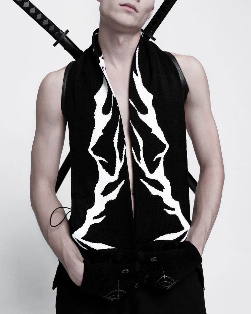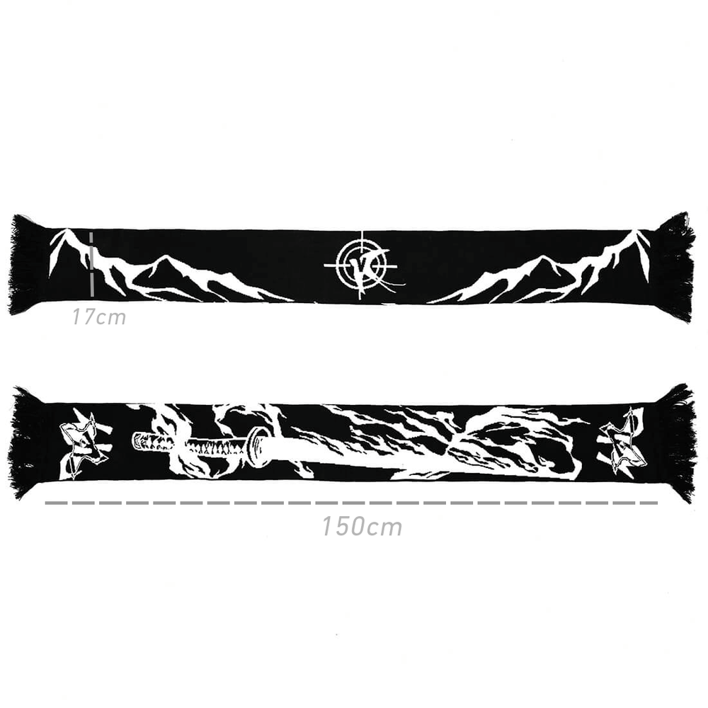 The double-sided scarf is made of both soft and elastic acrylic. Incredibly convenient to use and pleasantly disposed to the skin. The design of one side of the scarf is inspired by the works of Chinese tattoo artists. The print of one of the sides was designed specifically for the VCSS brand by artist and underground tattoo artist from Shanghai No.Cain, who is popular in Asia for his daring works in a rebellious spirit. Artist's Instagram - https://www.instagram.com/no.cain /. The design conveys the spirit of a real samurai. The design of the second side is the VCSS logo and the mountains. The scarf can be combined in different styles due to its universal color and two different designs.
