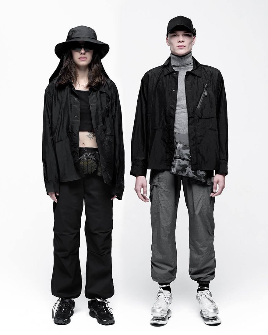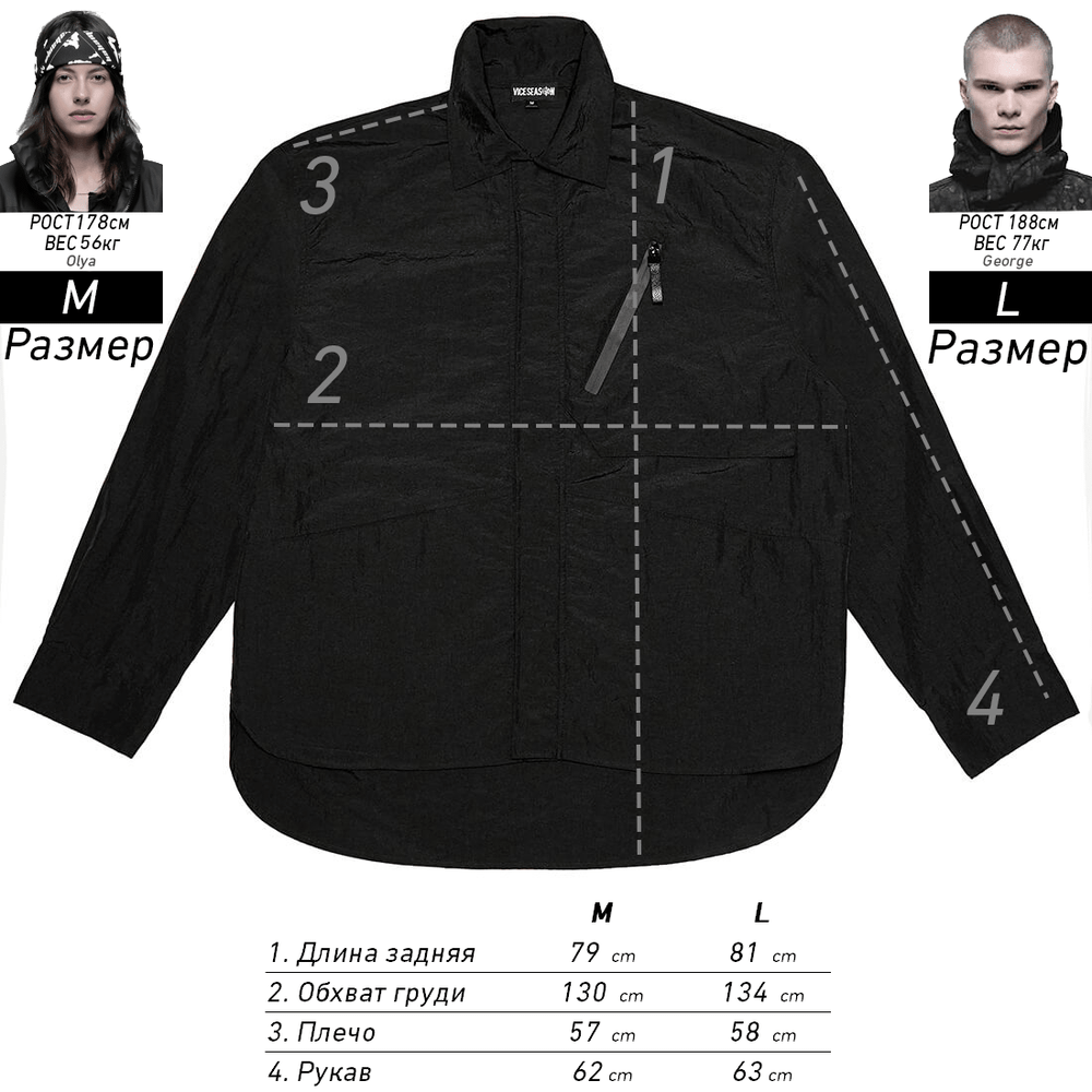 The black VCSS shirt is made with snap fasteners, two hidden pockets and a hidden zipper on the front. There is a carabiner suspension on the back, which allows you to make interesting combinations with various accessories. The shirt can be combined with other wardrobe items both buttoned and unbuttoned as a coach. Versatility and style in one person.