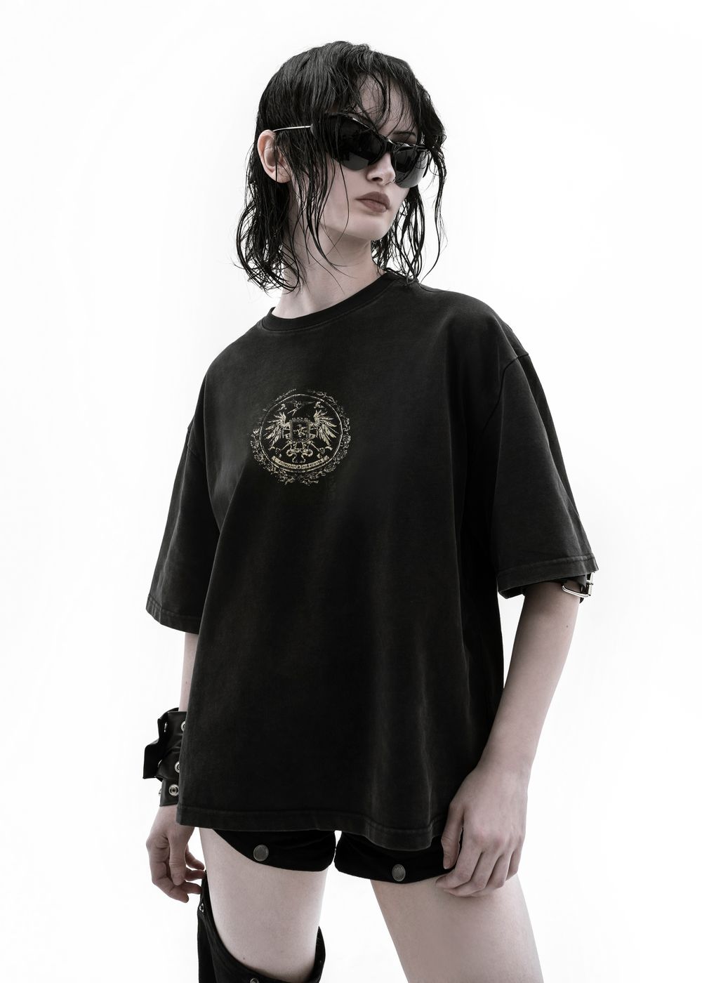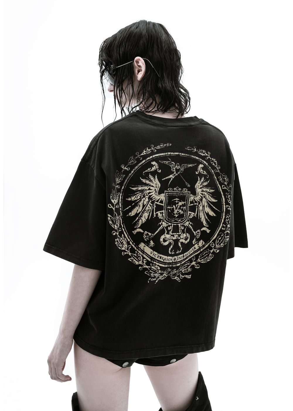 Loose fit with a low shoulder. The shape has a length "in size" (not elongated). The prints are made with durable silkscreen printing and tested for durability. The print has a "worn" vintage effect.
