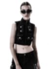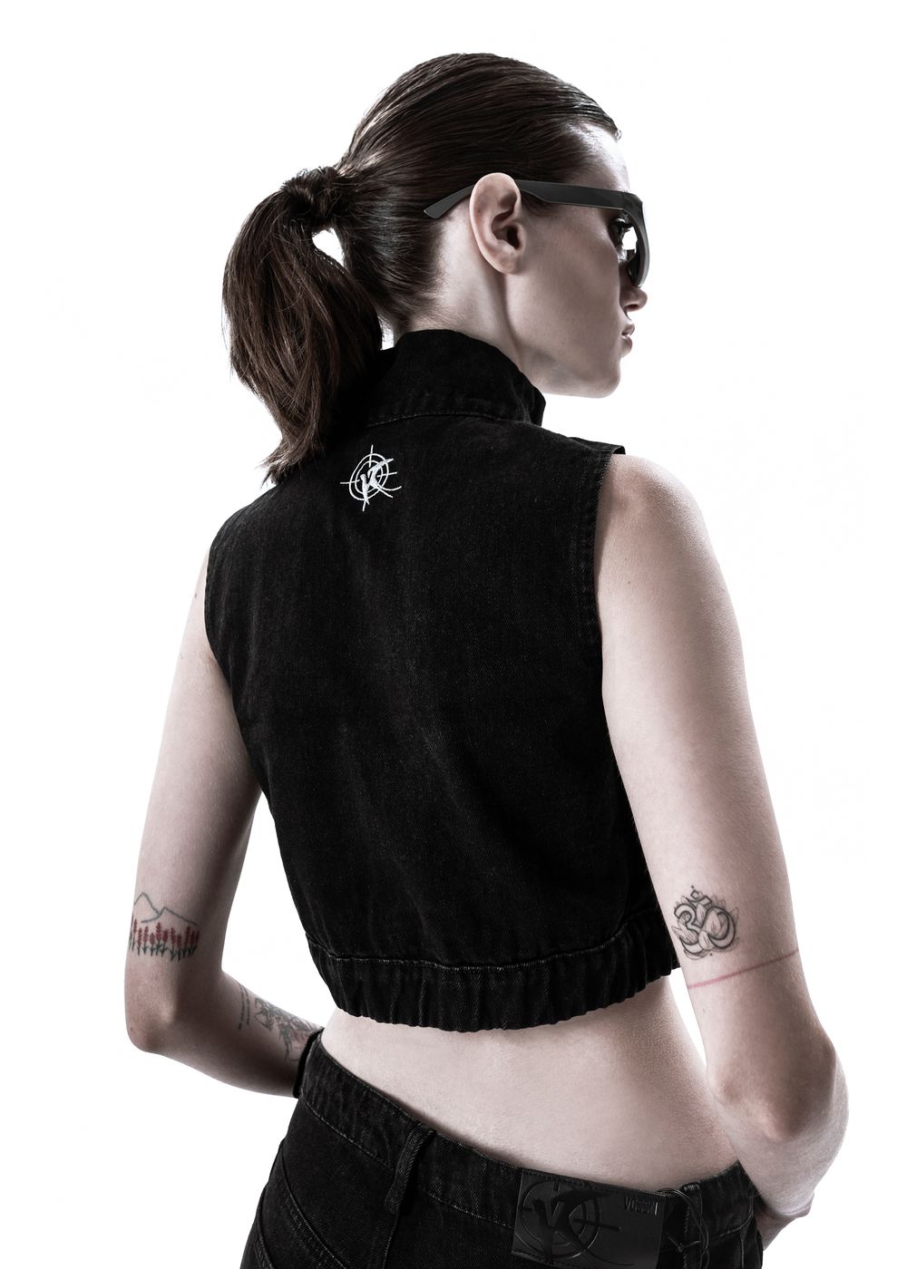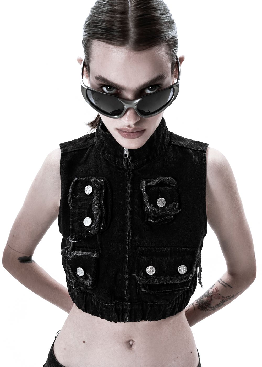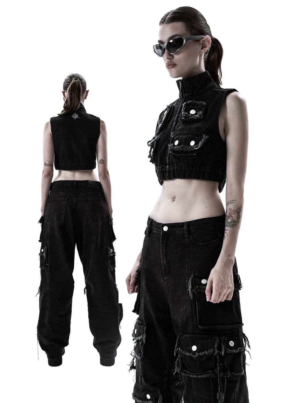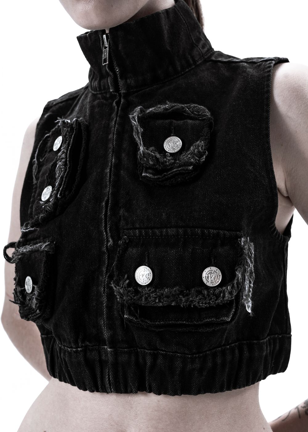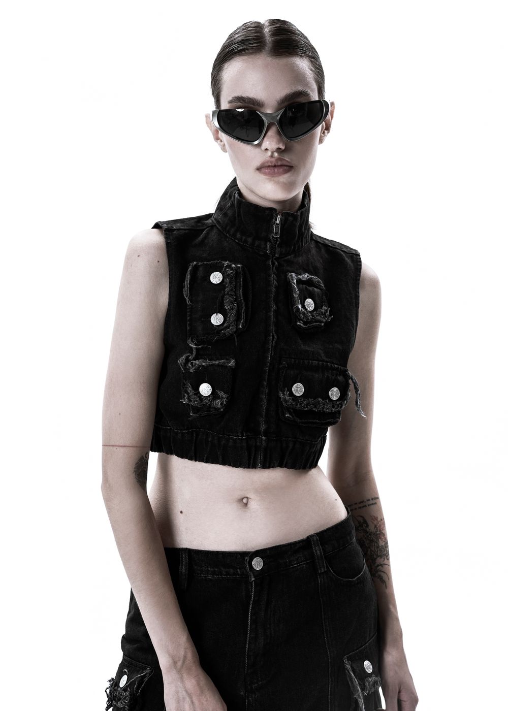 Sleeveless crop top with a high neck and a zipper. 4 voluminous external pockets. Elastic band around the bottom circumference of the top.