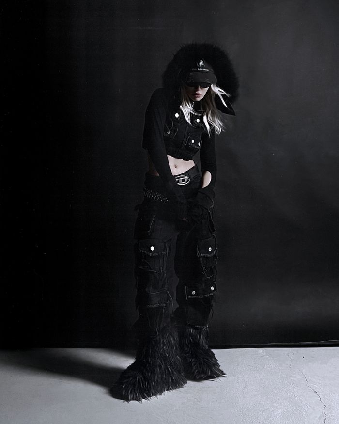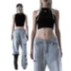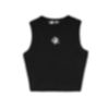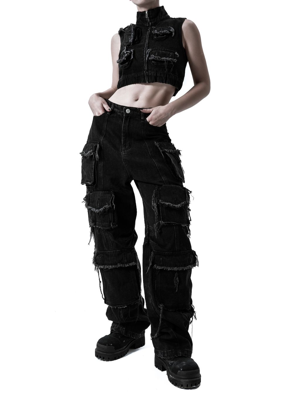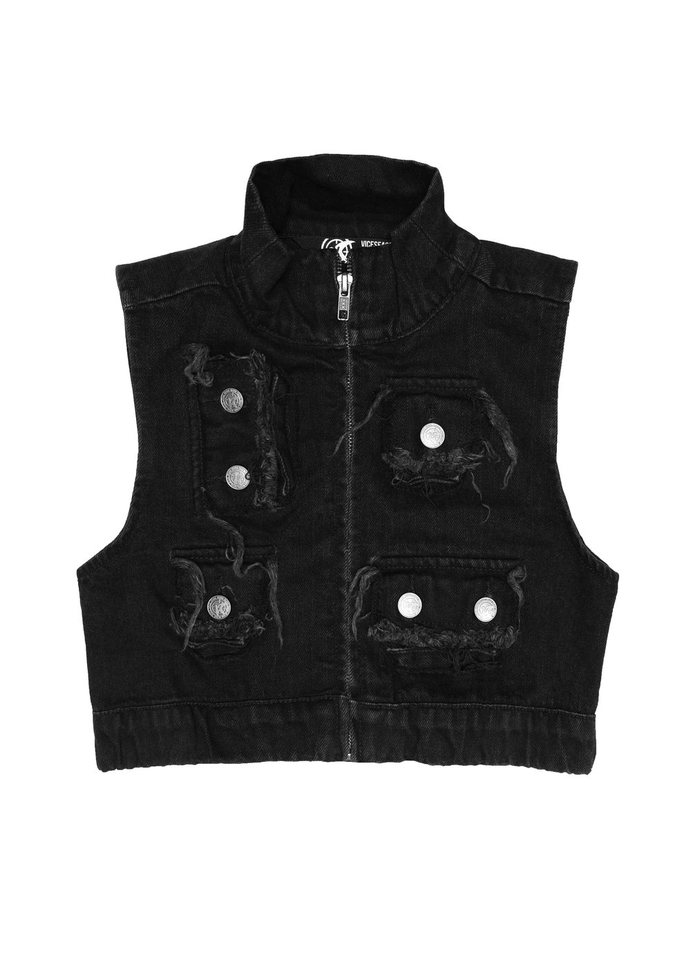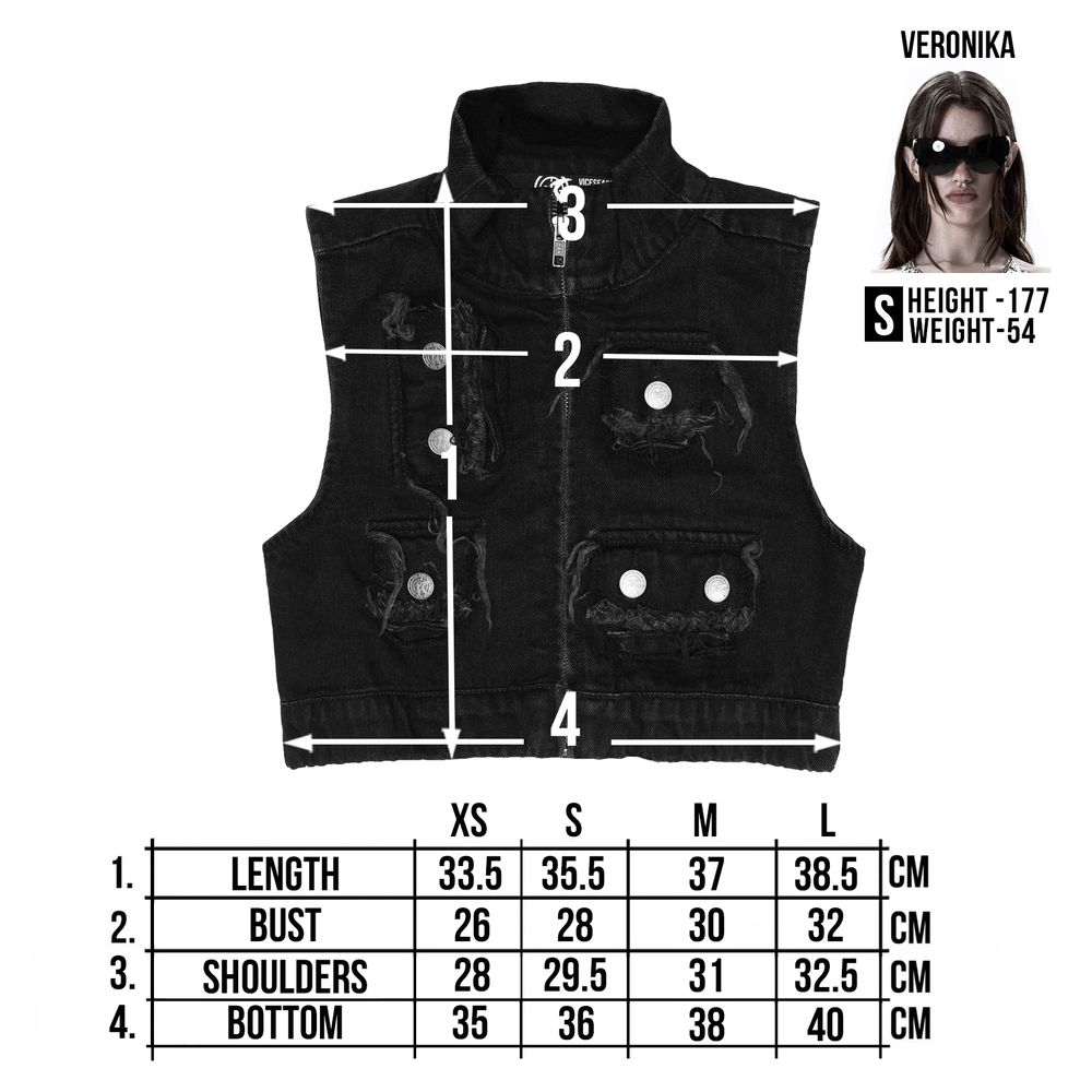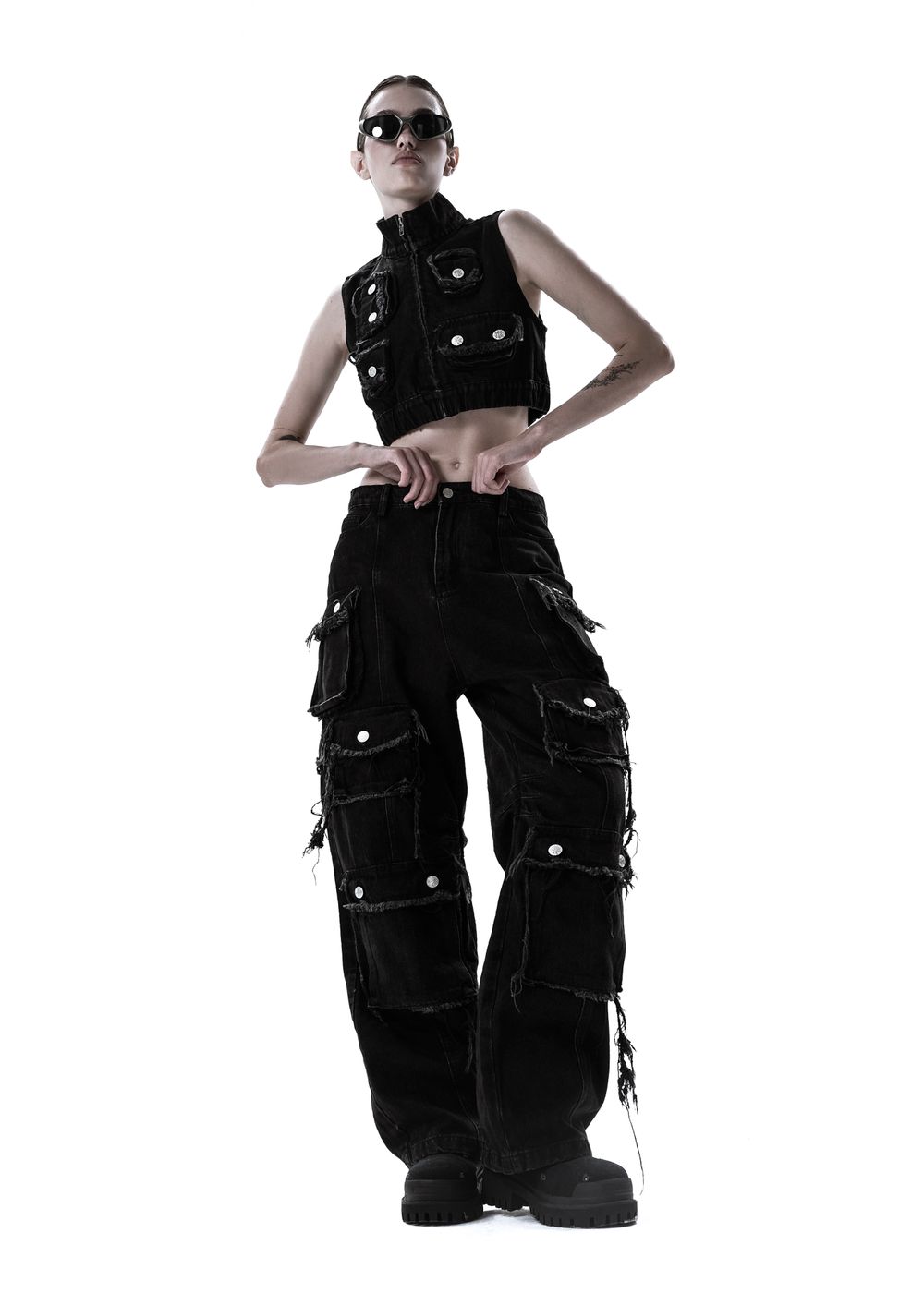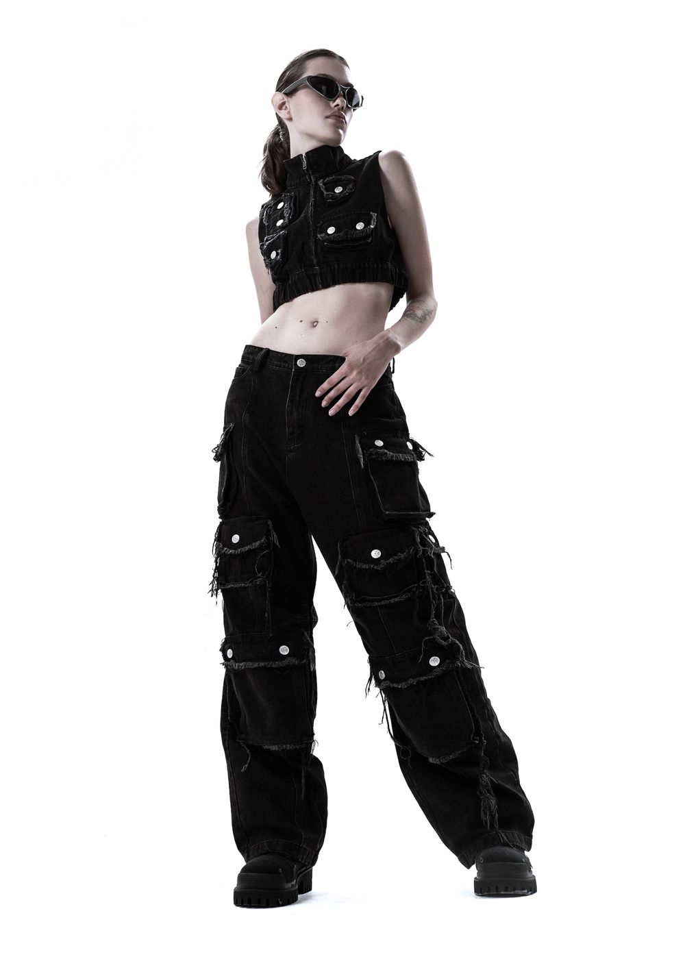 Sleeveless crop top with a high neck and a zipper. 4 voluminous external pockets. Elastic band around the bottom circumference of the top.