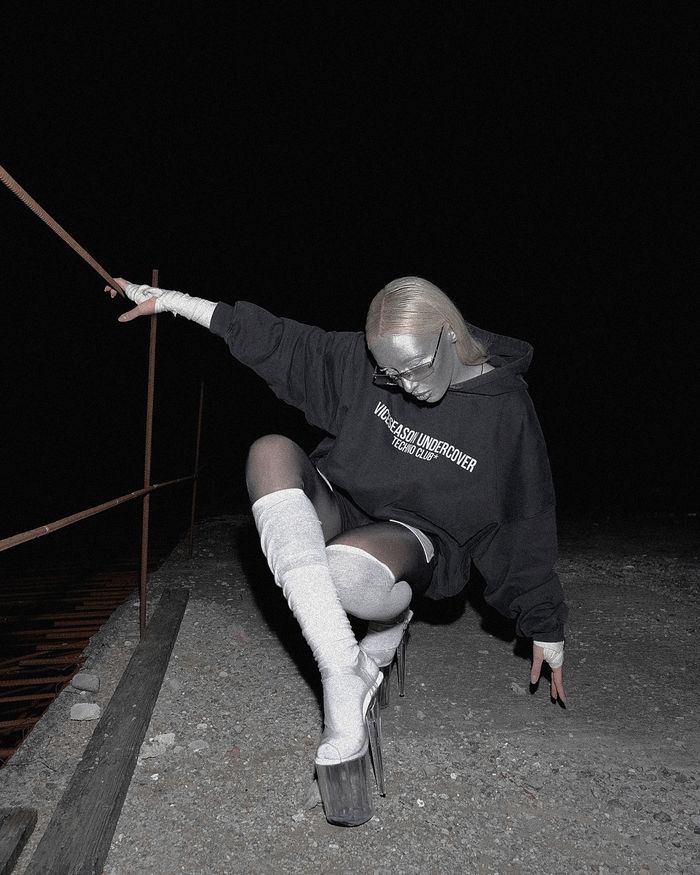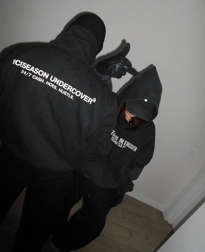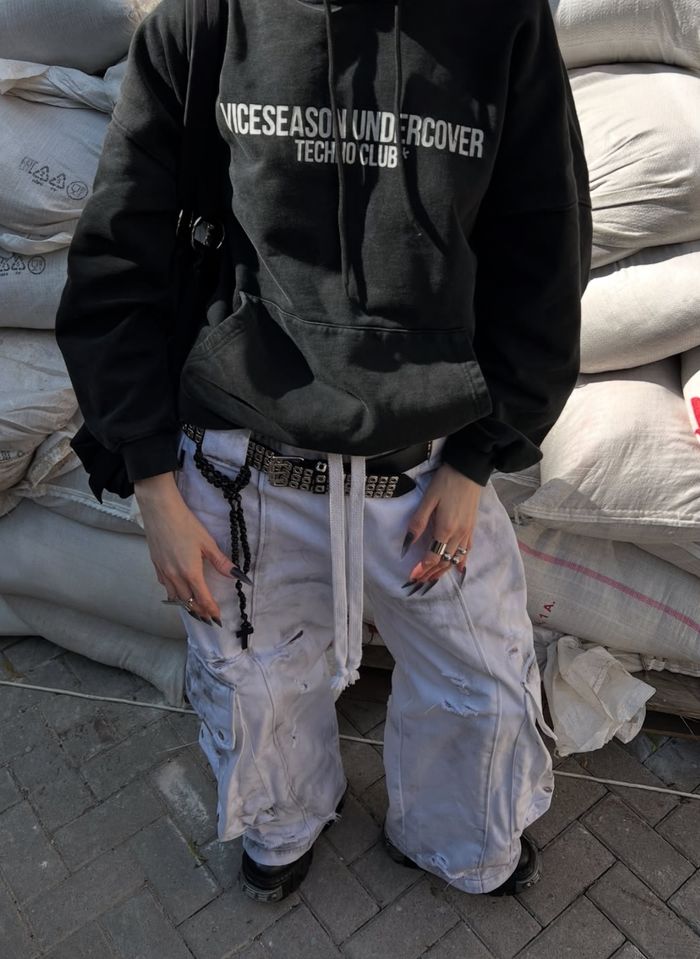 This hoodie is part of the "Techno Club" line and features a tag in the form of a keychain with the brand's bank card and a branded floppy disk.