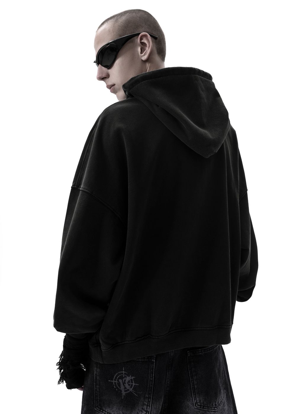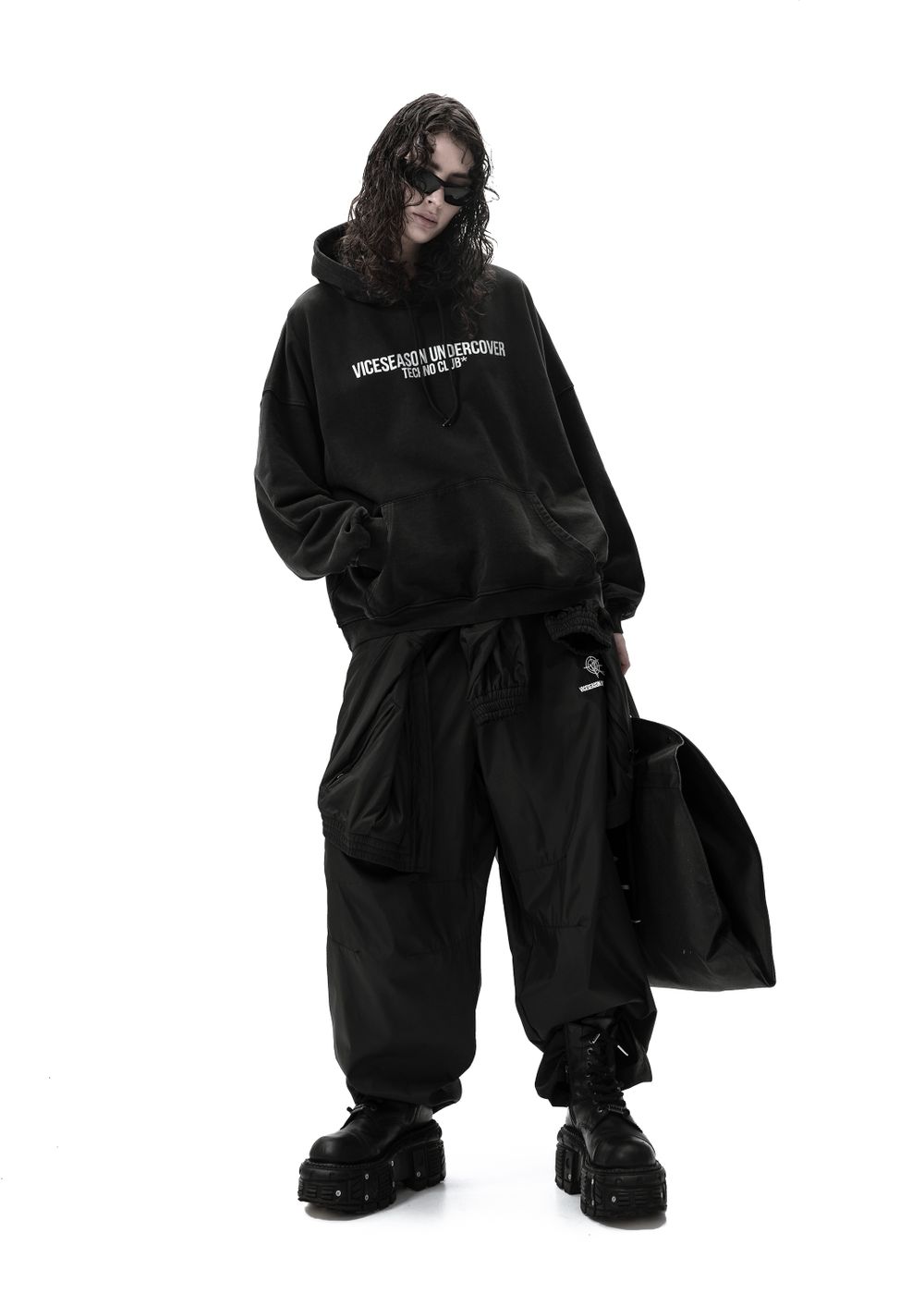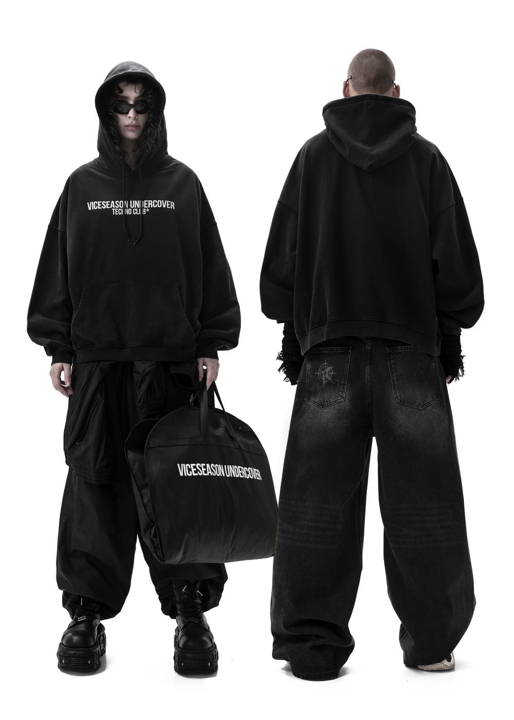 Oversized cut, dropped shoulders, voluminous sleeves, and a spacious hood.