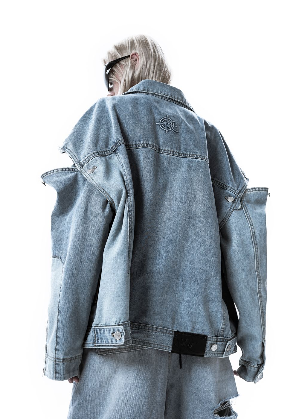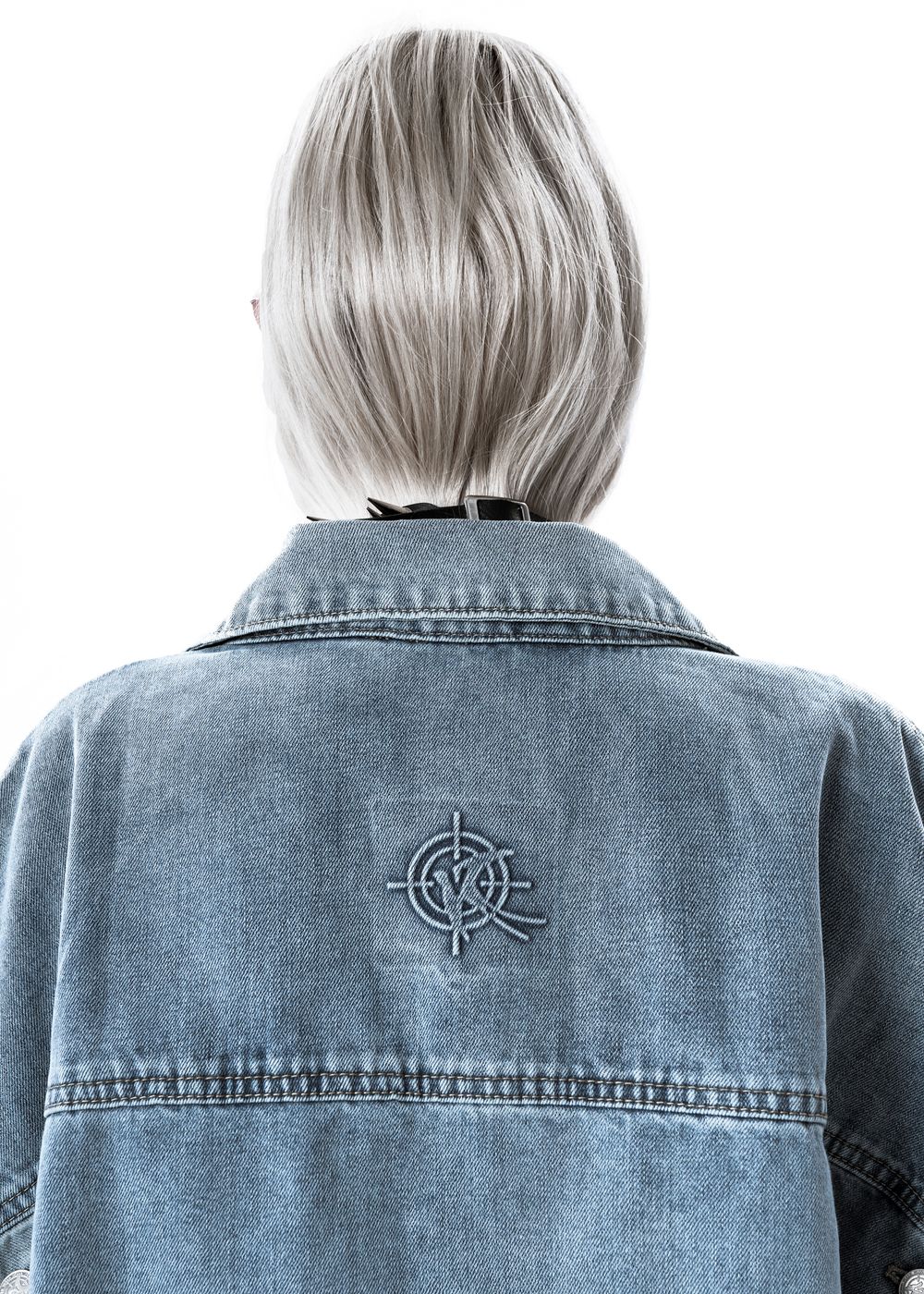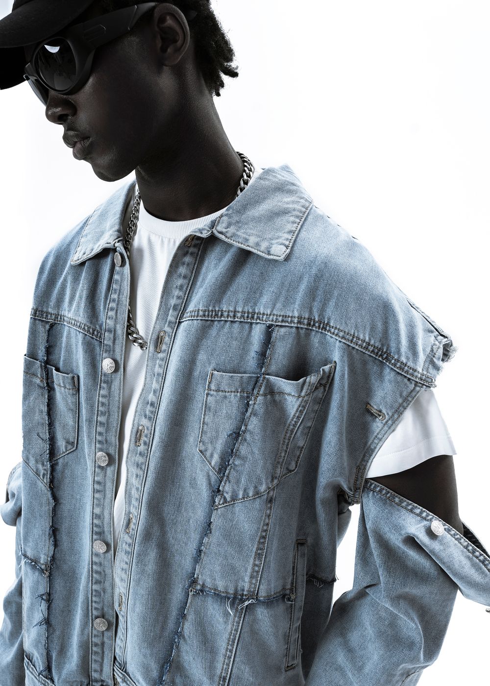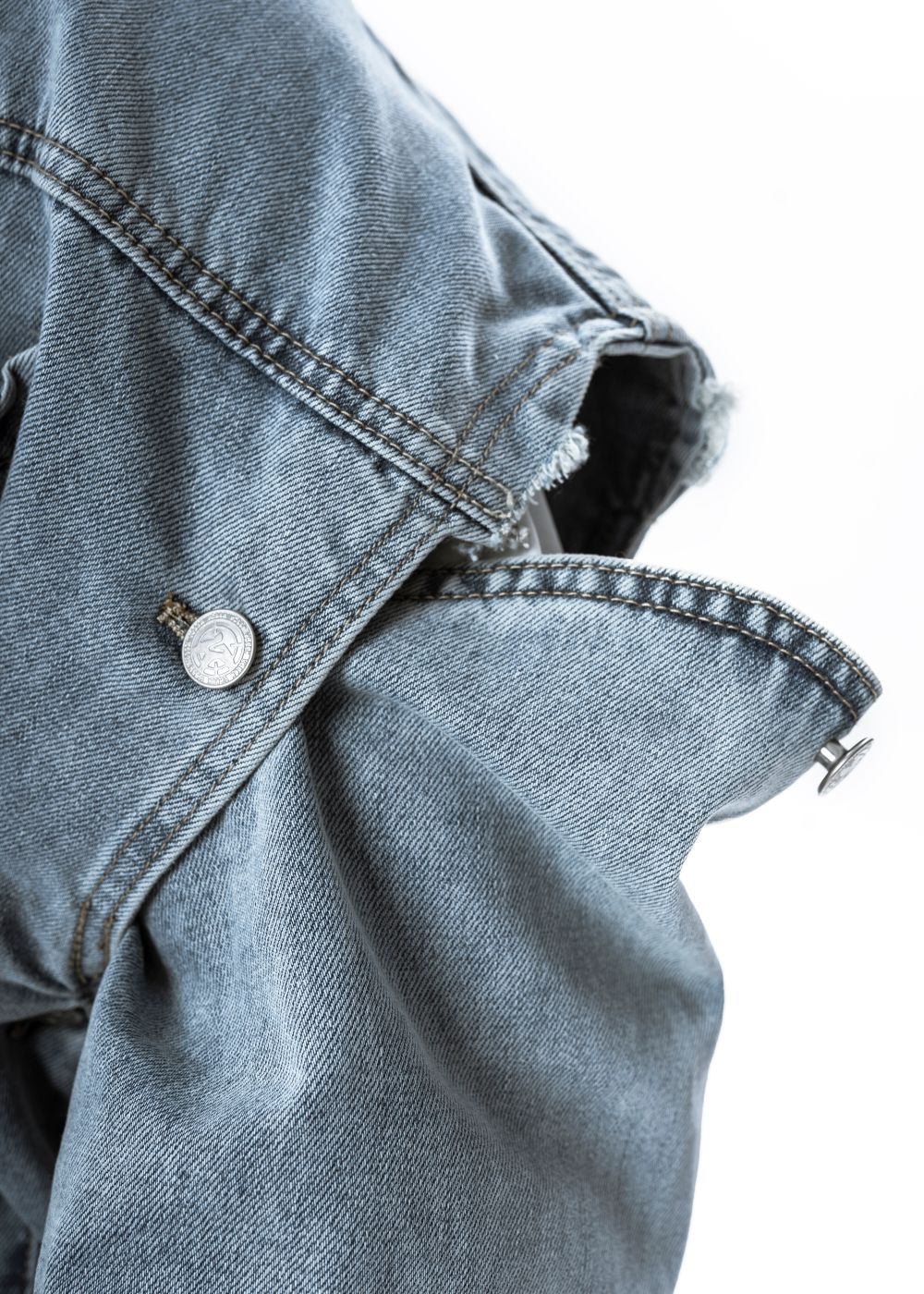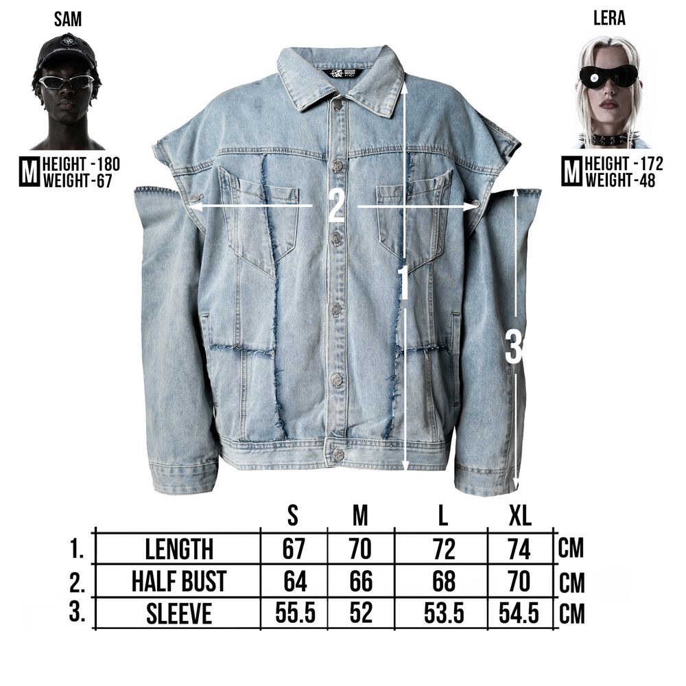 The jacket can have many types of look due to the detachable sleeves on buttons along the shoulders. You can wear it as a basic denim jacket (sleeves fully buttoned), also as a more designer and unusual version with cutouts at the shoulders (buttons half buttoned), or as a denim vest (sleeves fully buttoned). In general, you can experiment and create many of your own variations. External embossing (stamp of a relief imprint on the surface) logo on the back under the collar. Embossing on denim is very rare, thats why this item very distinctive. Different types of fasteners on the right and left sleeves. Eco-leather jacron with logo embossed on the back of the jacket belt.