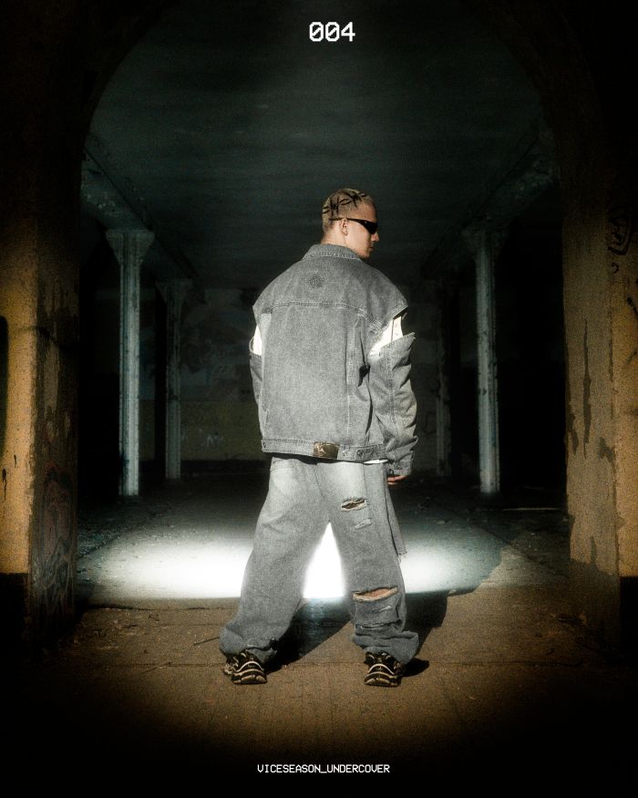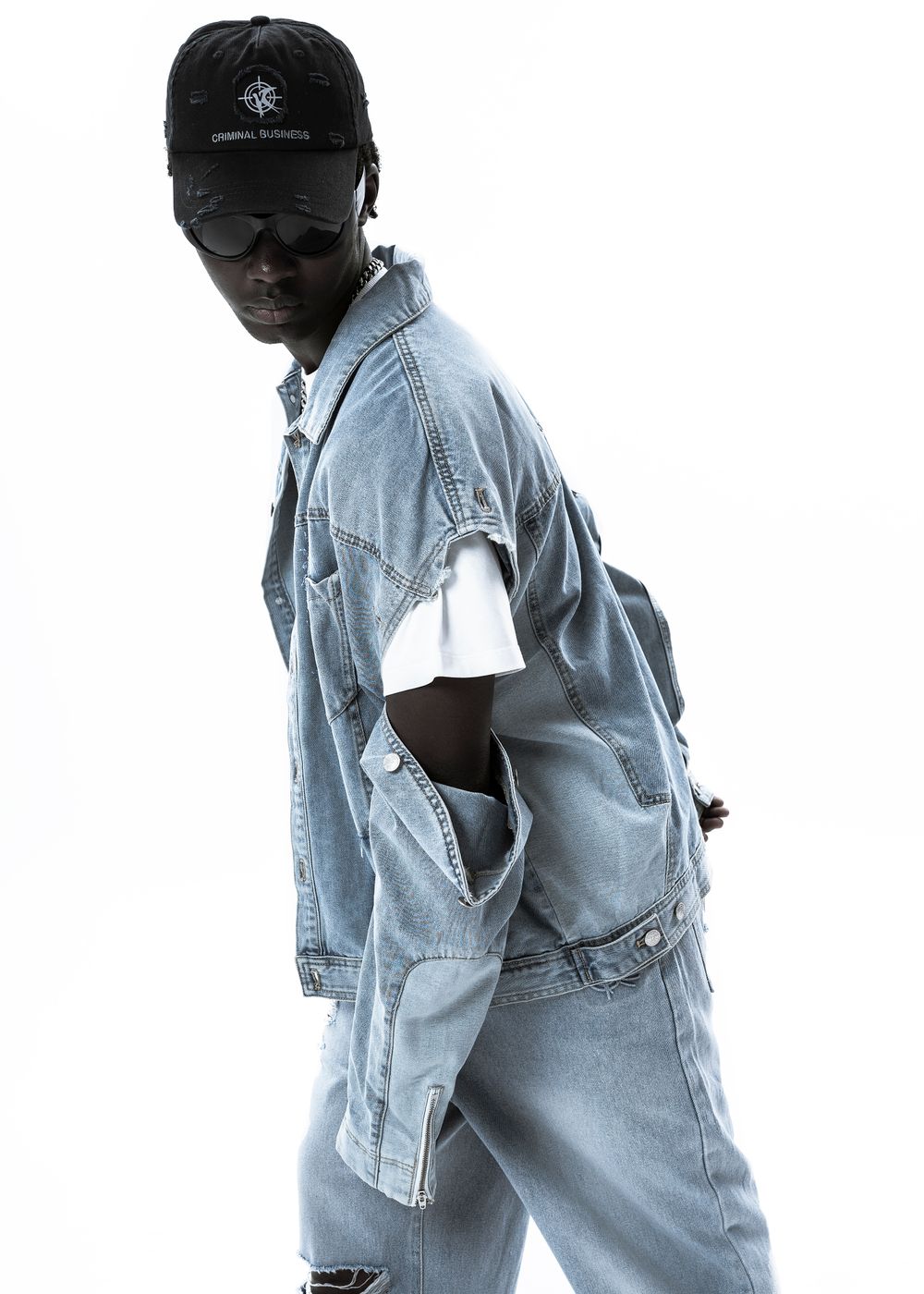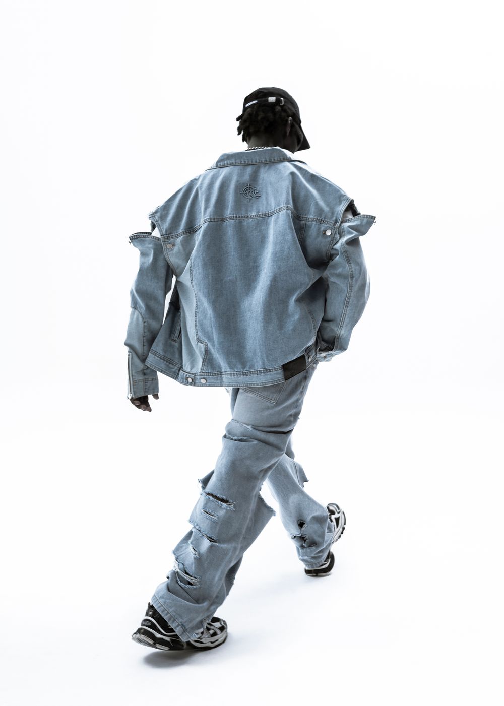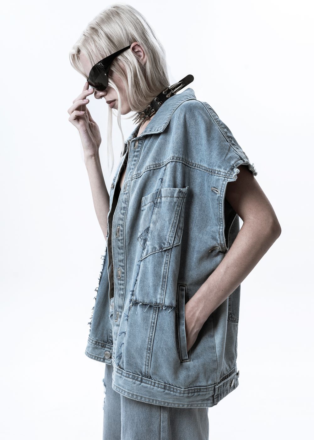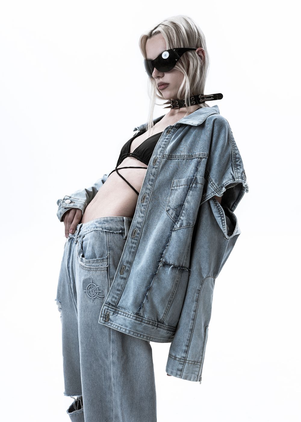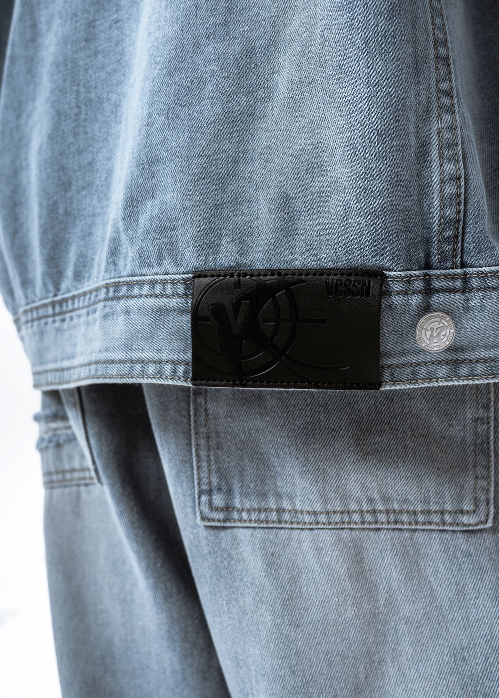 The jacket can have many types of look due to the detachable sleeves on buttons along the shoulders. You can wear it as a basic denim jacket (sleeves fully buttoned), also as a more designer and unusual version with cutouts at the shoulders (buttons half buttoned), or as a denim vest (sleeves fully buttoned). In general, you can experiment and create many of your own variations. External embossing (stamp of a relief imprint on the surface) logo on the back under the collar. Embossing on denim is very rare, thats why this item very distinctive. Different types of fasteners on the right and left sleeves. Eco-leather jacron with logo embossed on the back of the jacket belt.