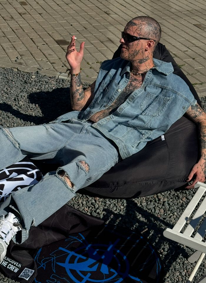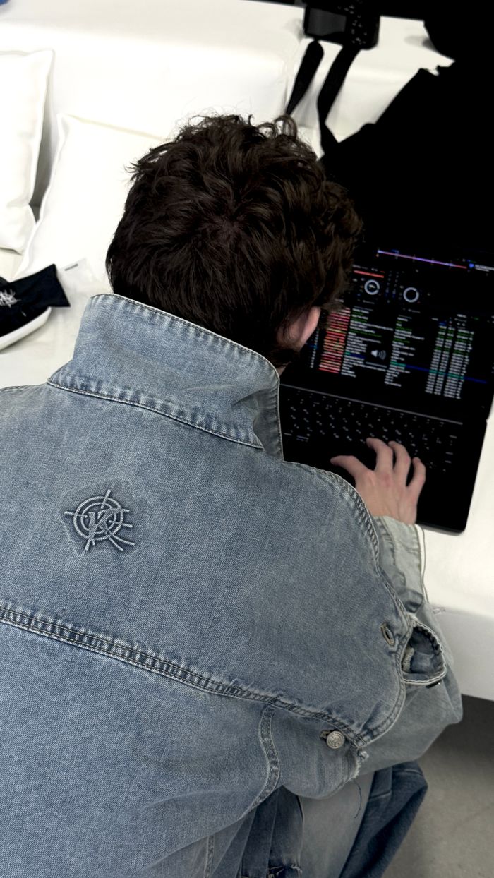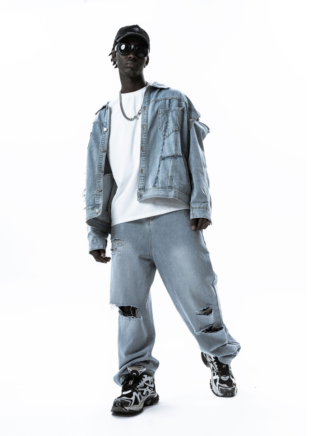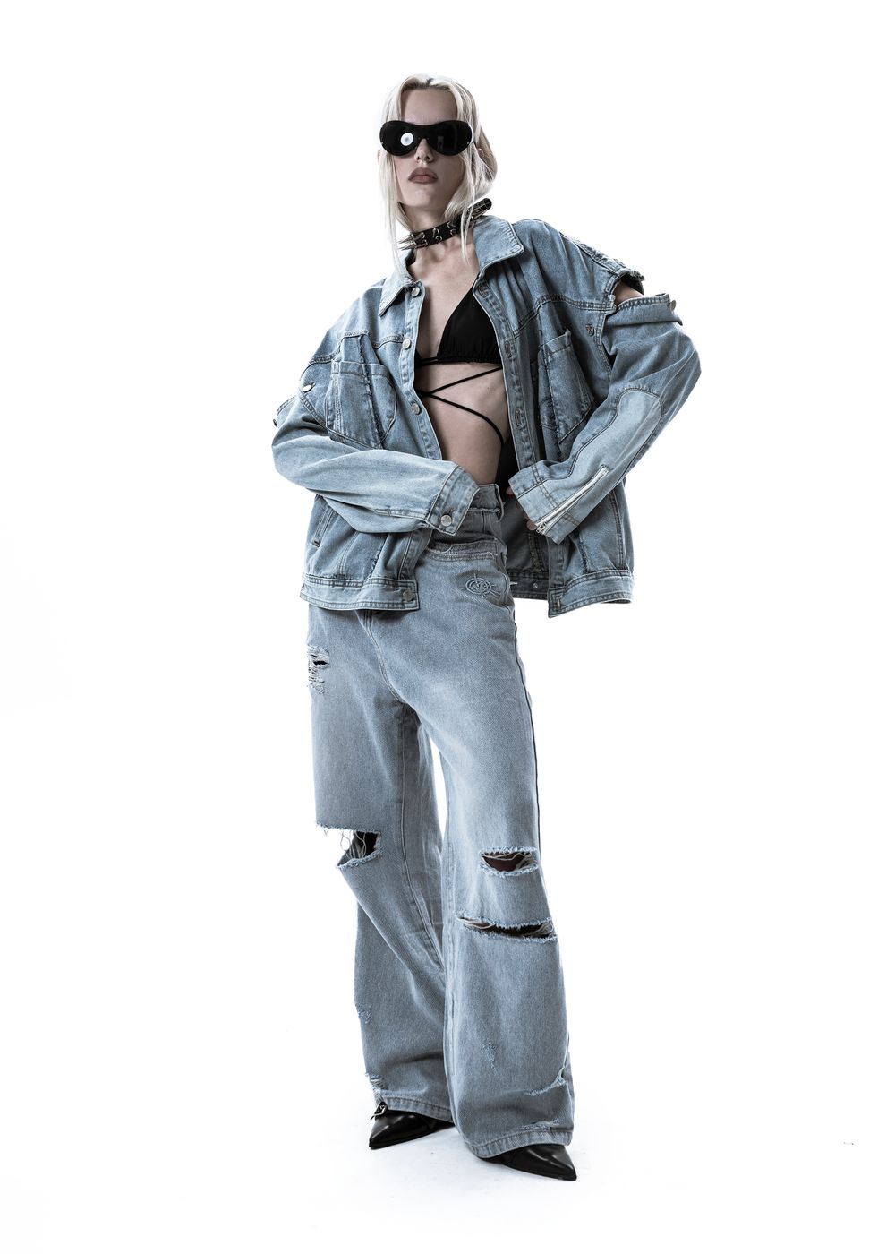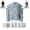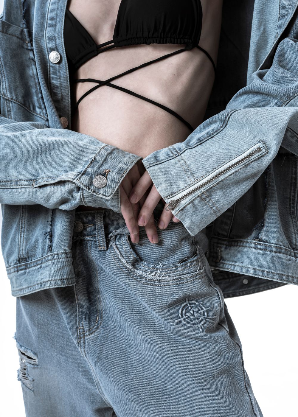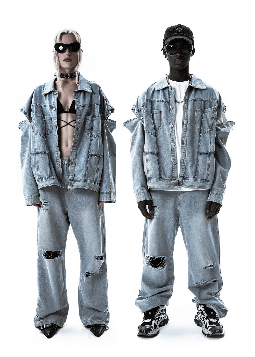 The jacket can have many types of look due to the detachable sleeves on buttons along the shoulders. You can wear it as a basic denim jacket (sleeves fully buttoned), also as a more designer and unusual version with cutouts at the shoulders (buttons half buttoned), or as a denim vest (sleeves fully buttoned). In general, you can experiment and create many of your own variations. External embossing (stamp of a relief imprint on the surface) logo on the back under the collar. Embossing on denim is very rare, thats why this item very distinctive. Different types of fasteners on the right and left sleeves. Eco-leather jacron with logo embossed on the back of the jacket belt.