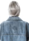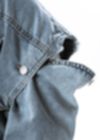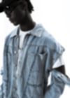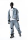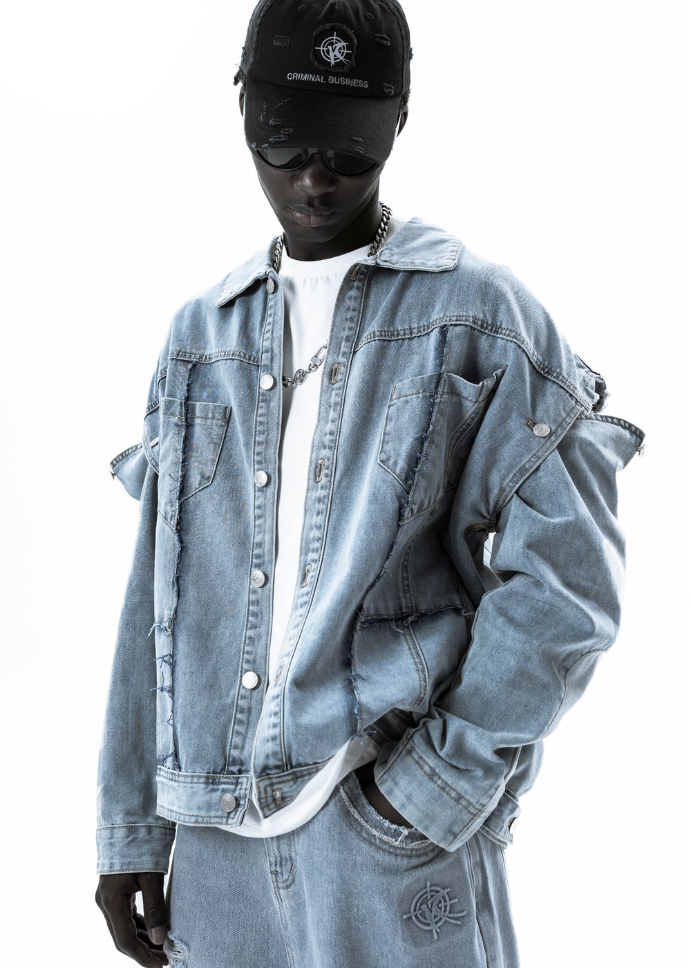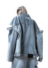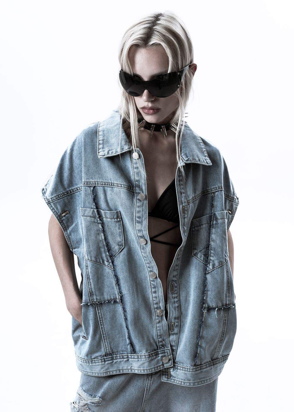 Oversized fit. Front pockets with an unusual slanted shape on the chest, which are cut through by a vertical seam. 2 side pockets. Contrasting fringed seams. Light colored inserts on the sides of the jacket and on the sleeves.